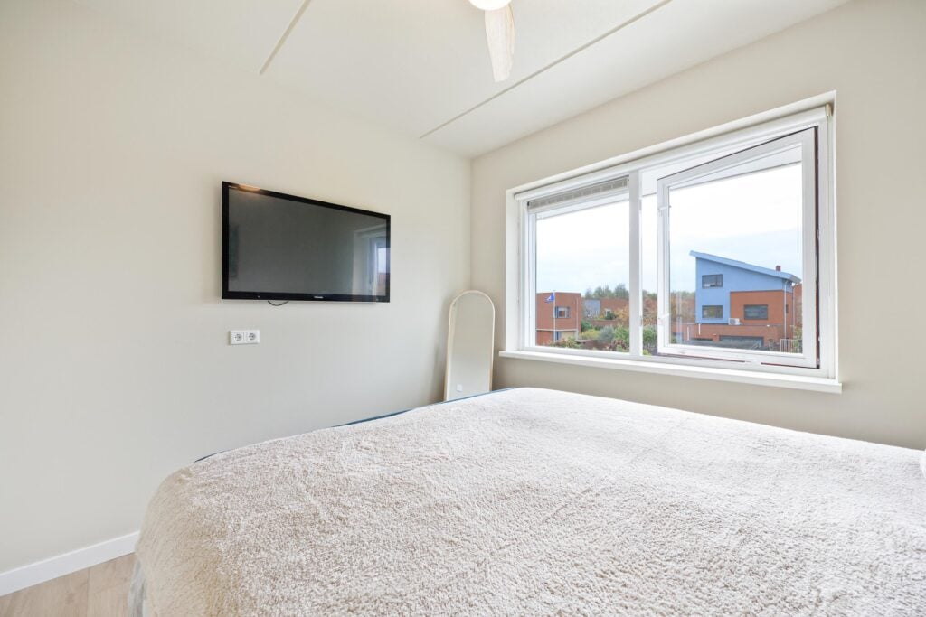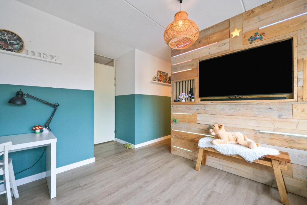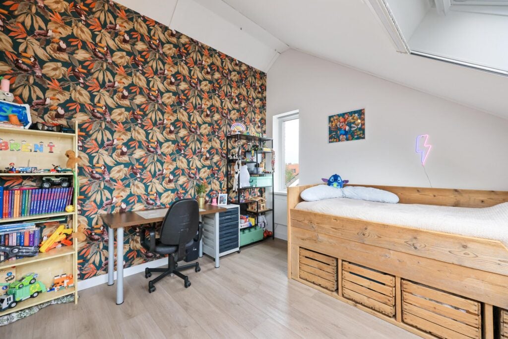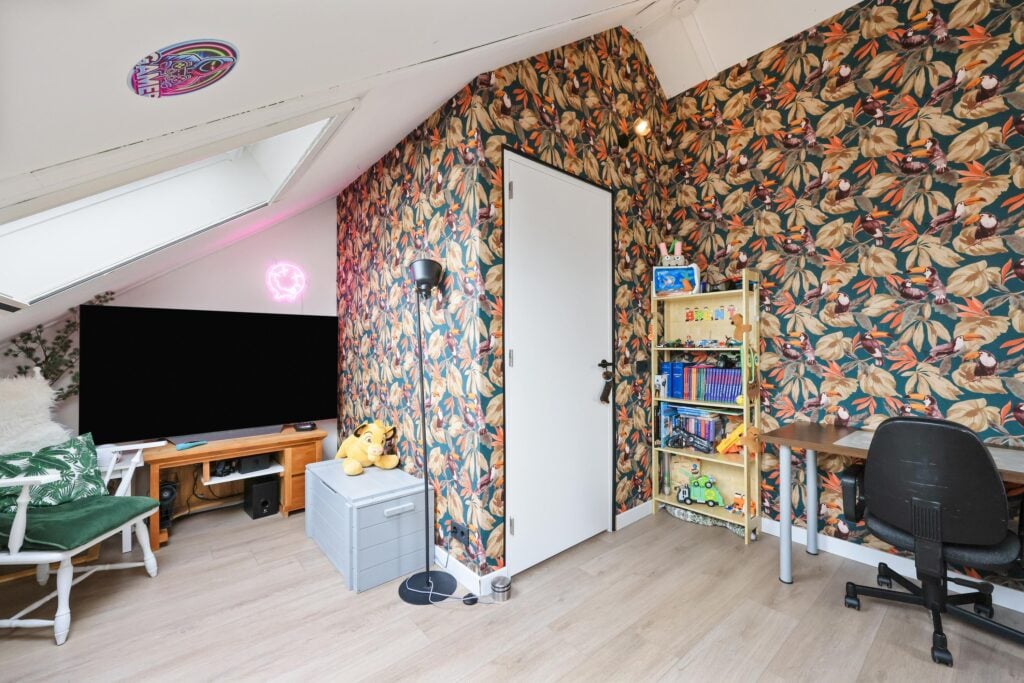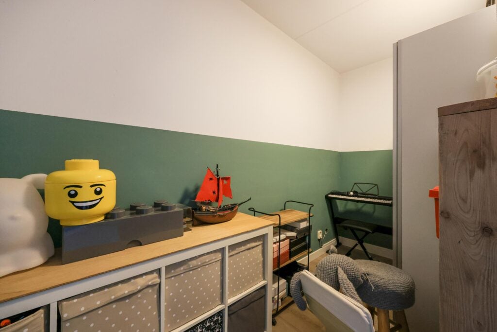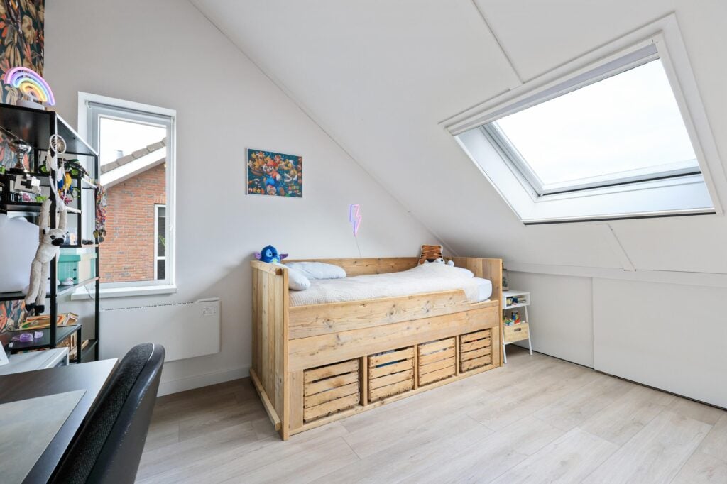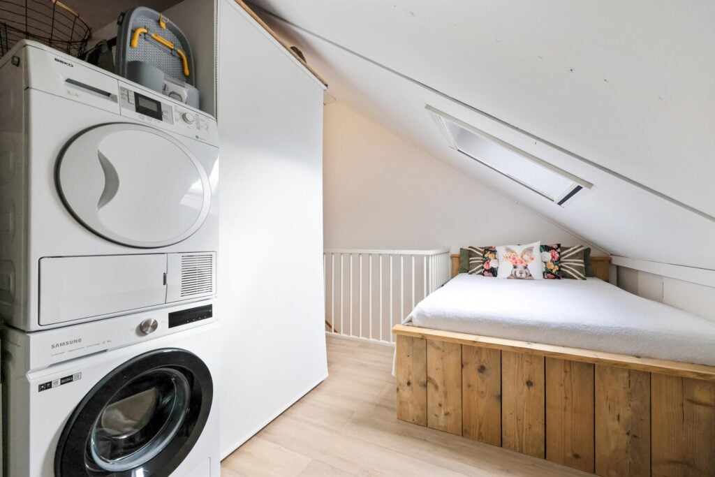 Op de tweede verdieping is nog een ruime slaapkamer en veel bergruimte, ideaal als werk-, logeer- of tienerkamer. Hier bevindt zich ook de wasruimte met aansluiting voor wasmachine en droger.