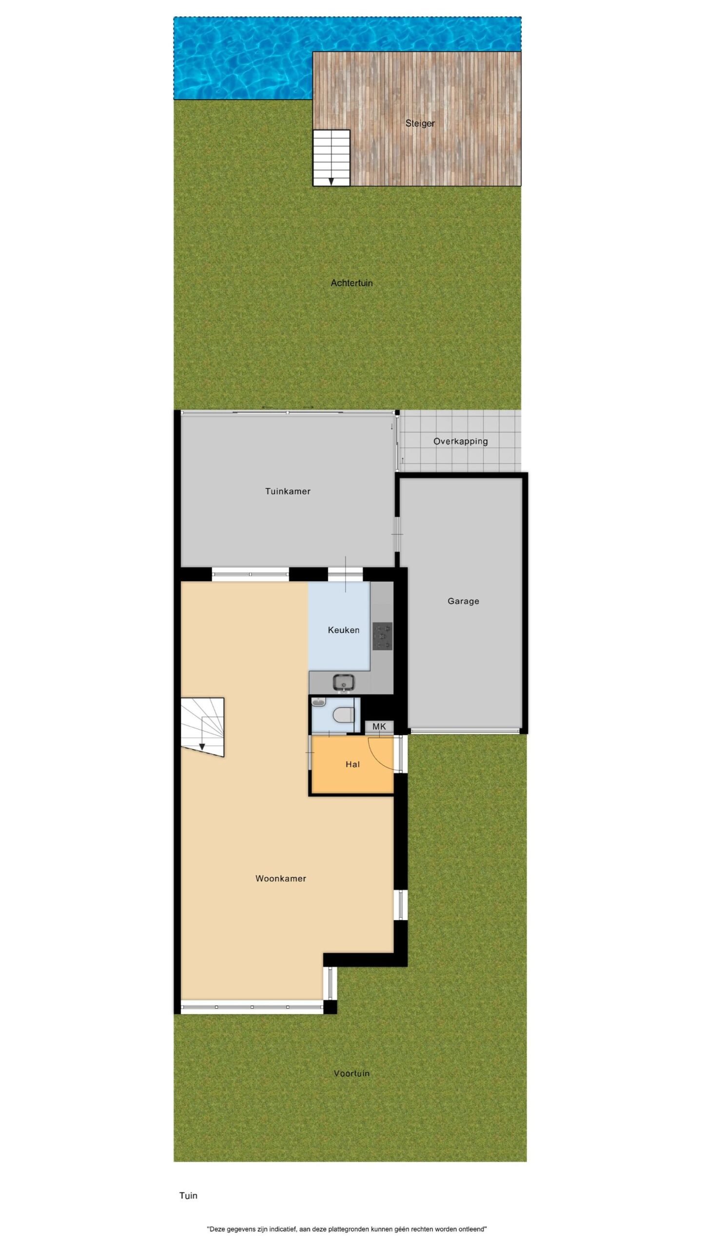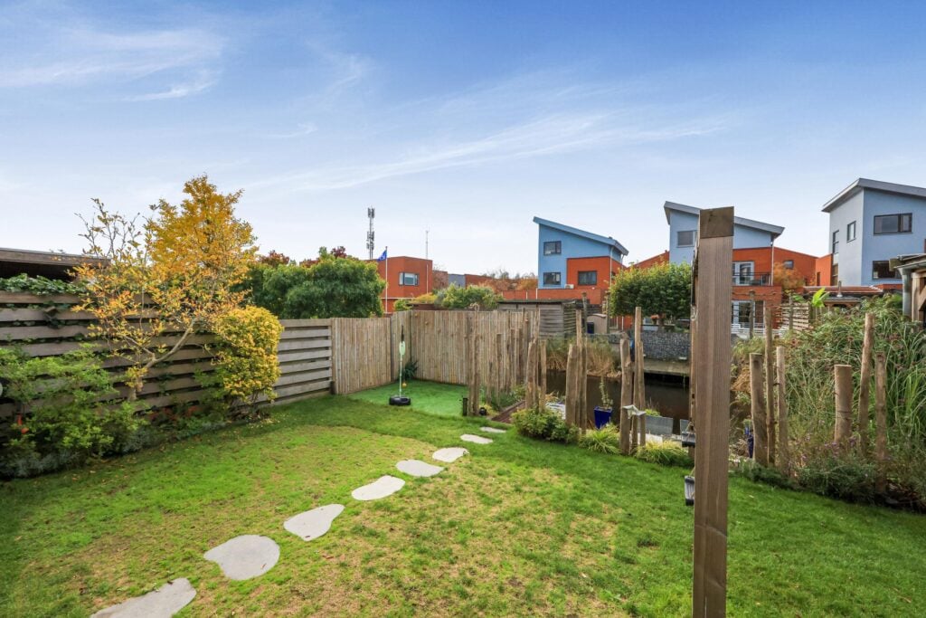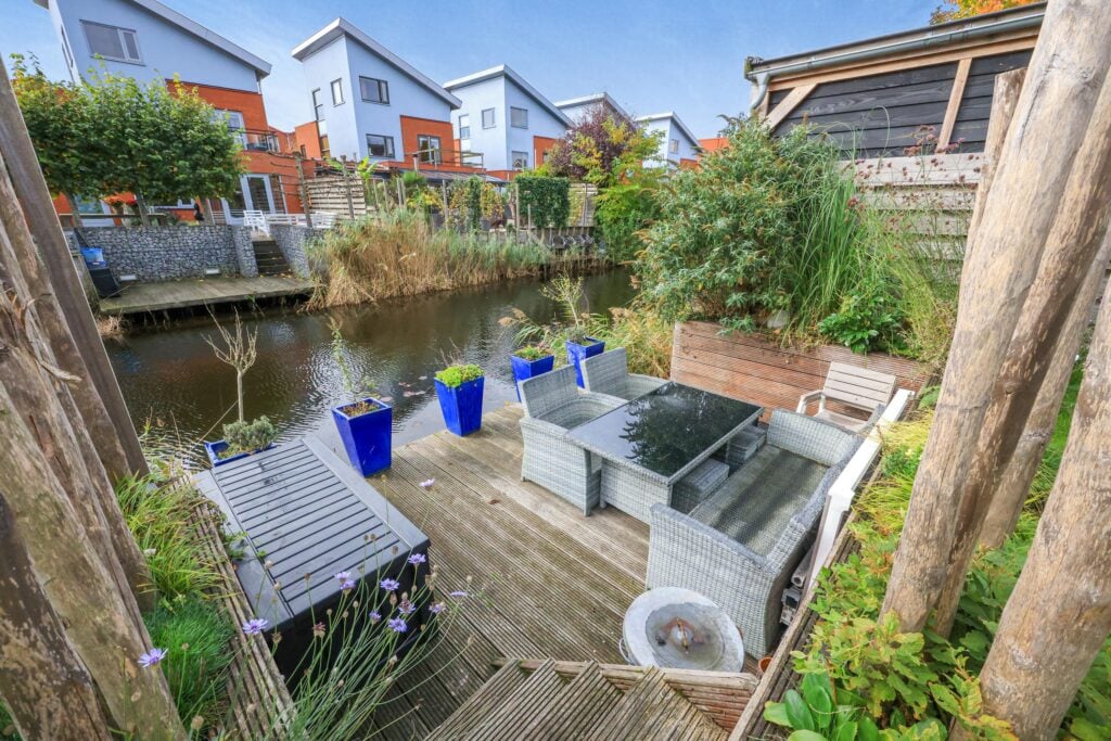 De achtertuin is werkelijk een plaatje. Direct achter de woning ligt de royale serre, daarachter een zonnig gazon en aan het einde een houten vlonder aan het water. De tuin is verzorgd aangelegd met veel privacy en een gunstige zonligging. Aan de voorzijde beschik je over een eigen oprit en een stenen garage.