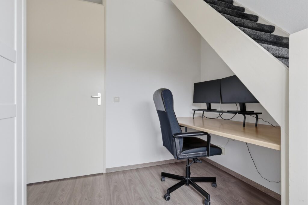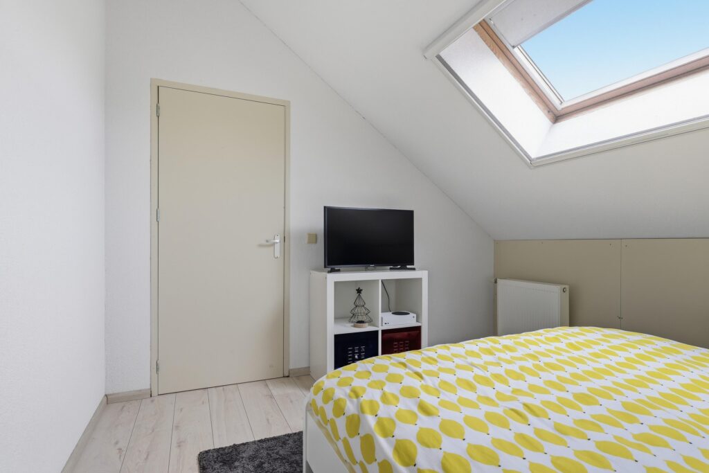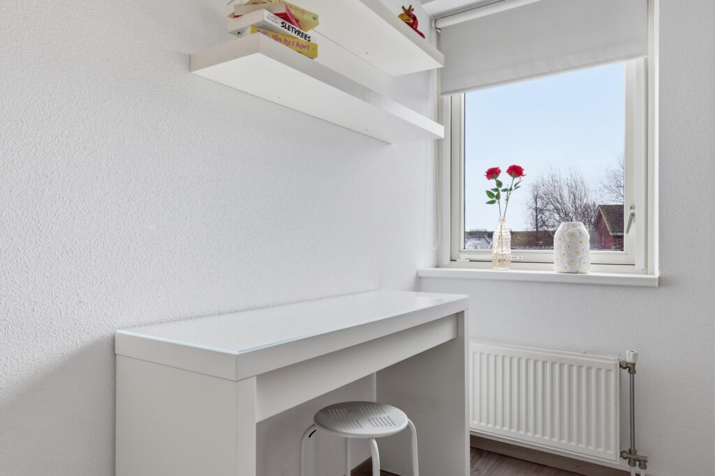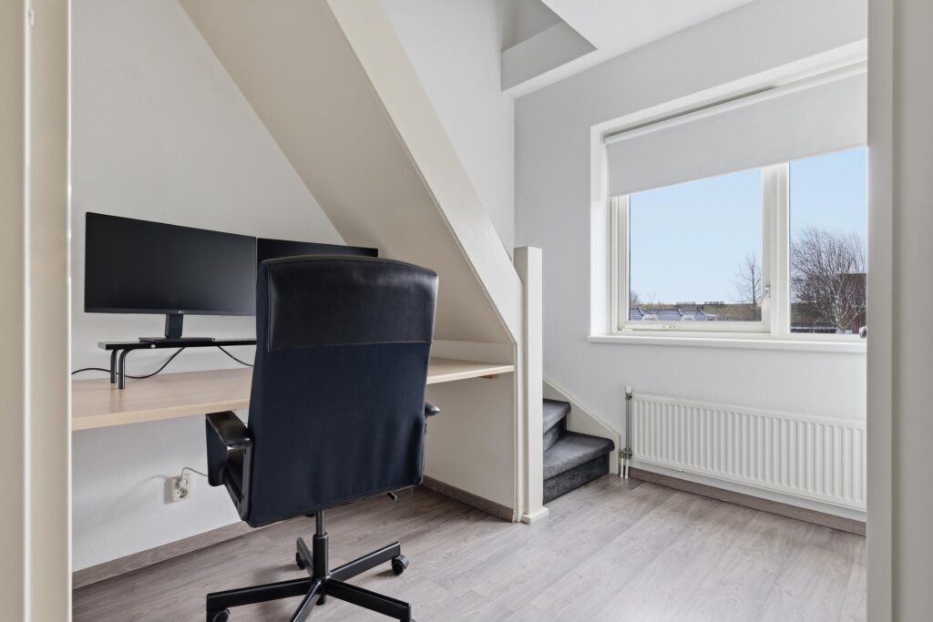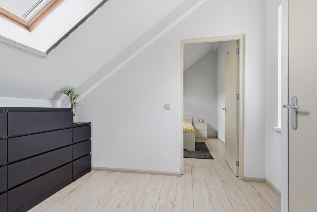 Op de tweede verdieping treft u een extra slaapkamer, aangevuld met een overloop waar ruimte is voor een werkplek. Deze verdieping biedt extra flexibiliteit, bijvoorbeeld als extra/of logeerkamer of een studeerruimte.