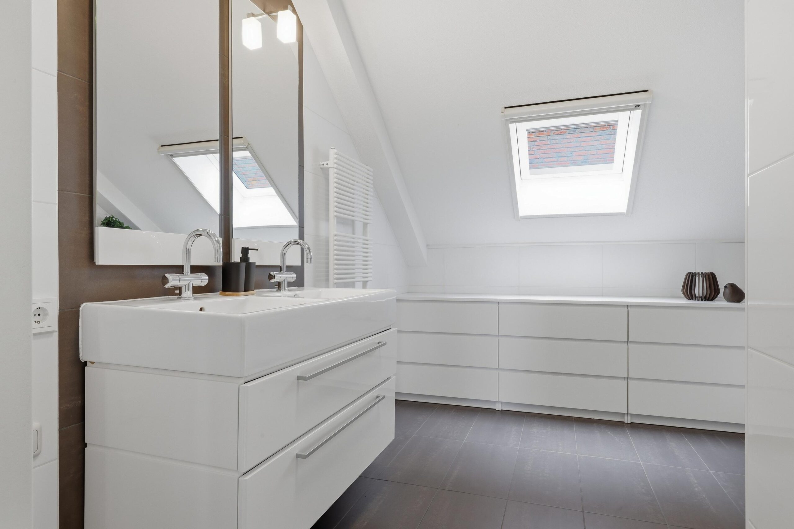 De eerste verdieping bestaat uit drie comfortabele slaapkamers, waarvan één is voorzien van een praktische kastenwand. Hier vindt u tevens een stijlvolle badkamer die is uitgerust met een aparte douche, dubbele wastafel en een modern hangend toilet.