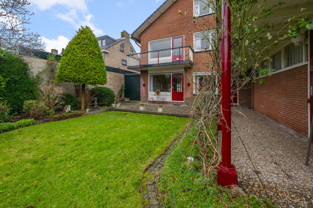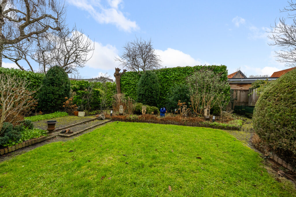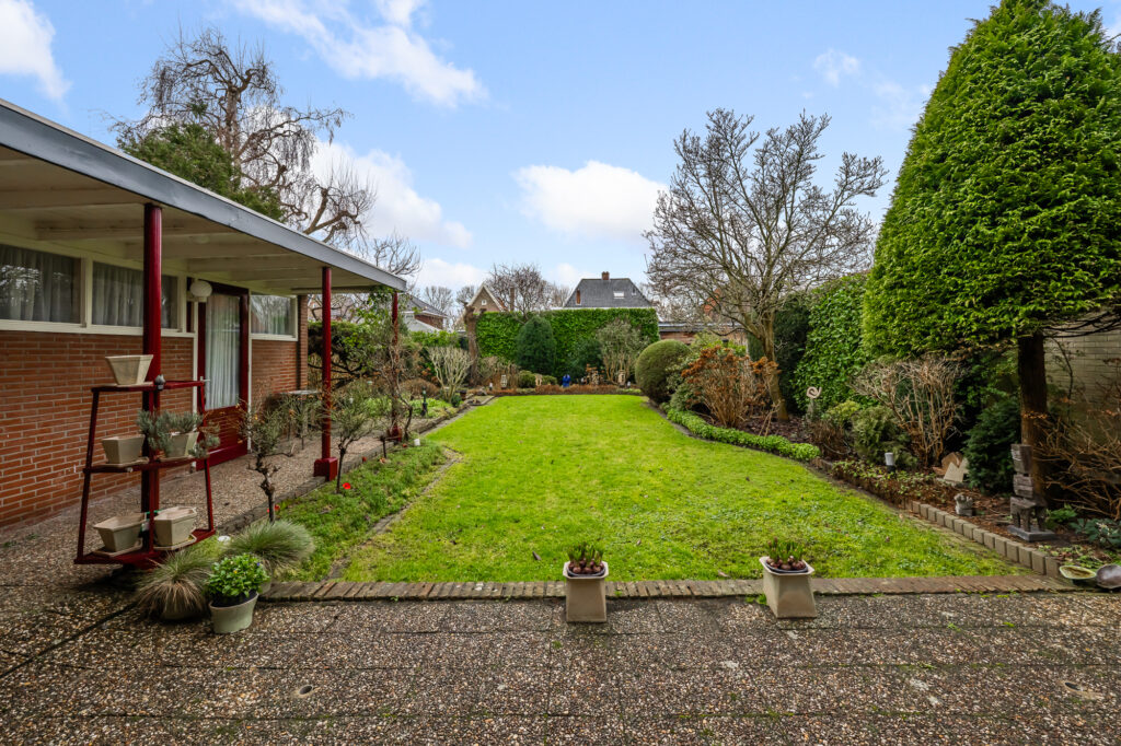 De woning beschikt over een voortuin en een eigen oprit voor meerdere auto’s en een ruime achtertuin van circa 286 m². Deze biedt volop privacy en mogelijkheden om heerlijk buiten te genieten. Deze buitenruimte heeft een perfecte zonligging op het zuiden en biedt genoeg zitplekken in de schaduw door de aanwezigheid van een grote overkapping. Daarnaast is er een vrijstaande stenen garage van circa 18 m², voorzien van een elektrische garagedeur.