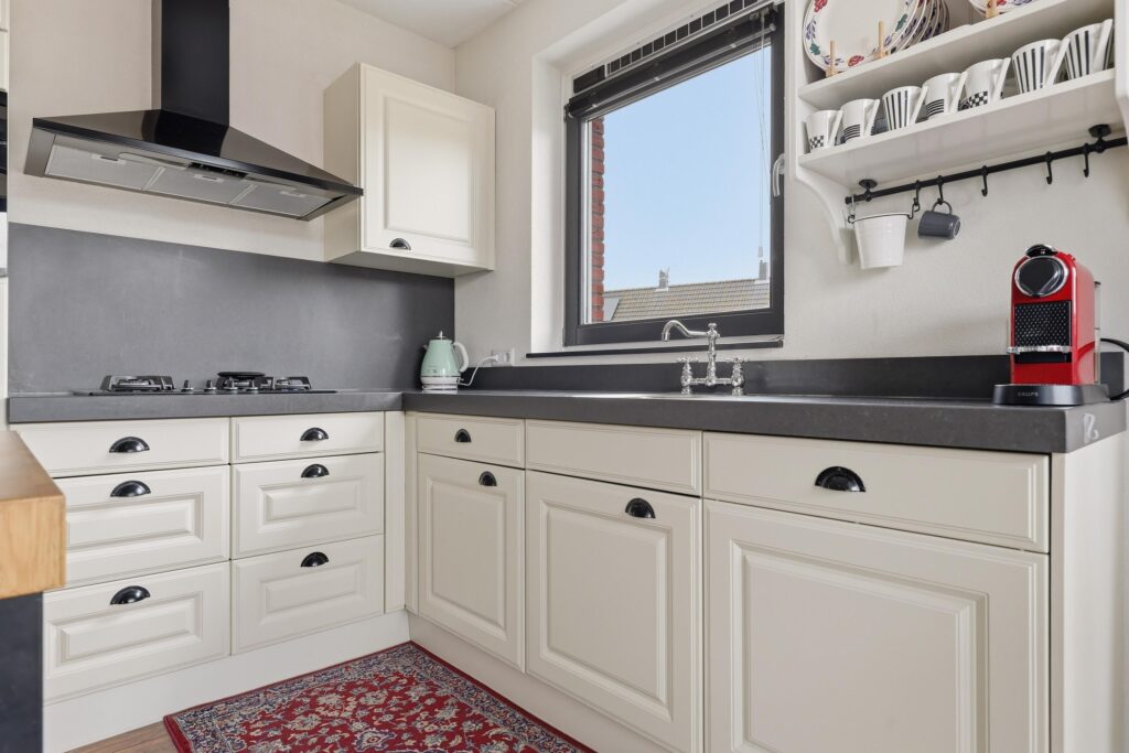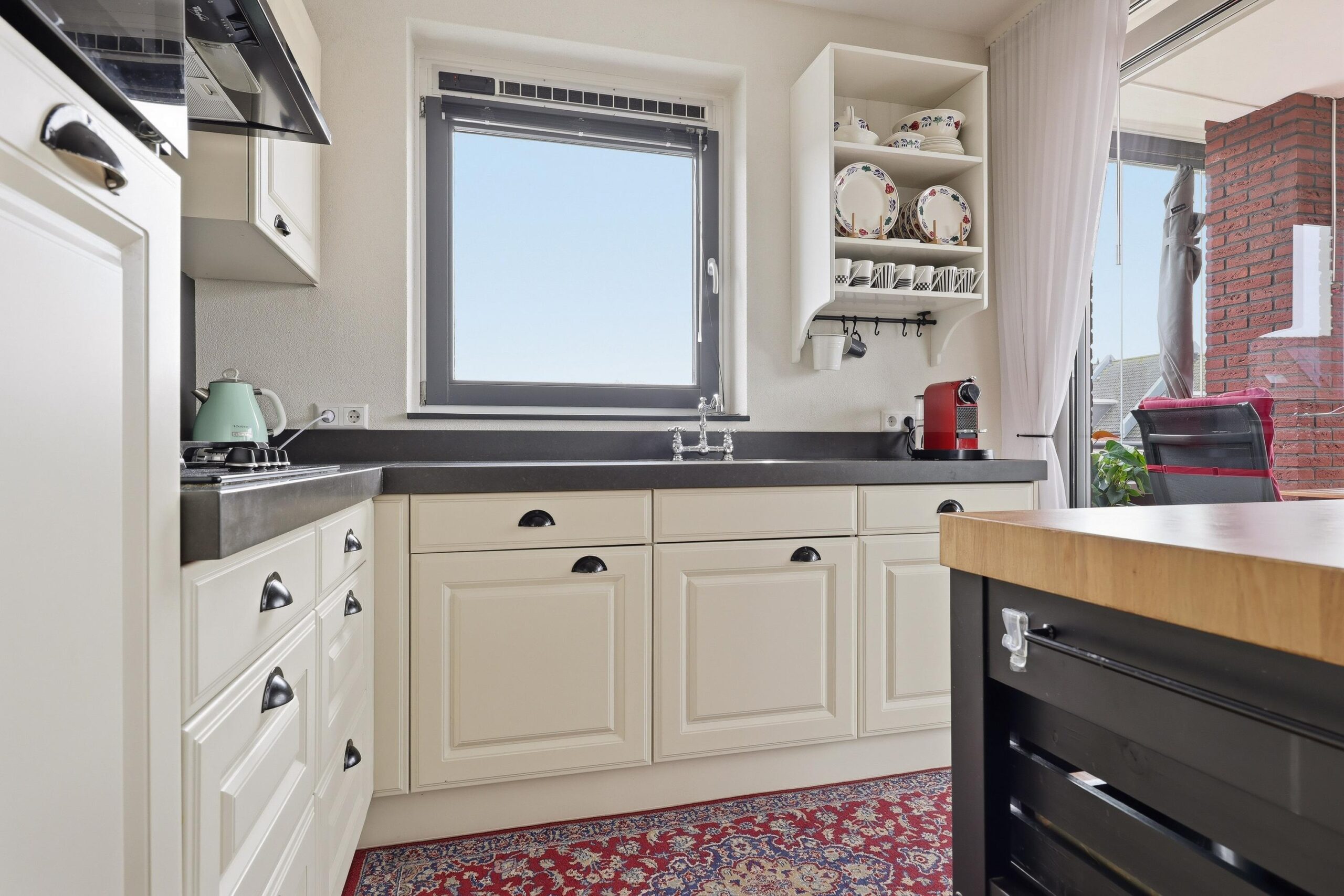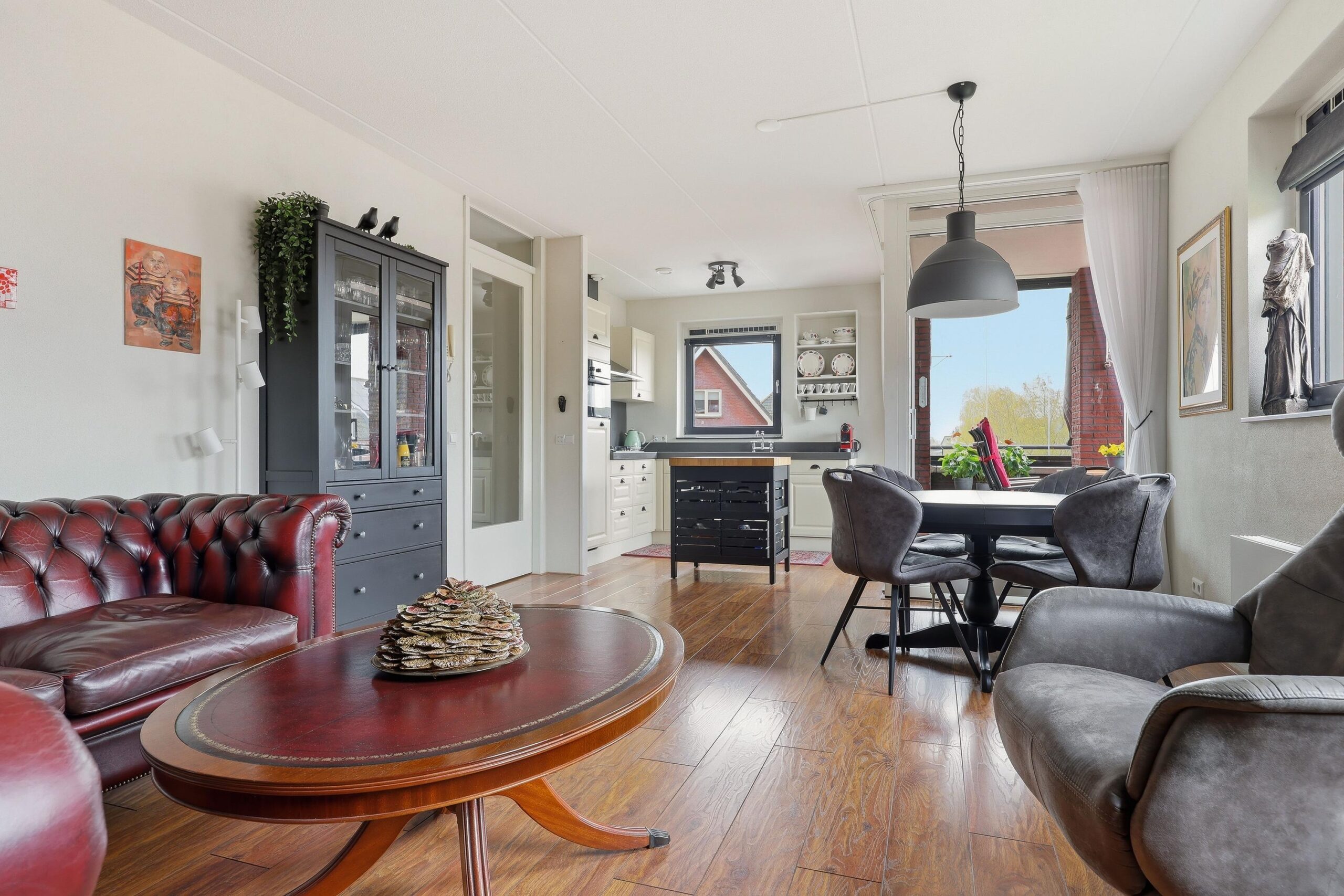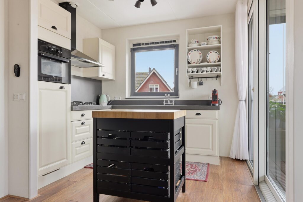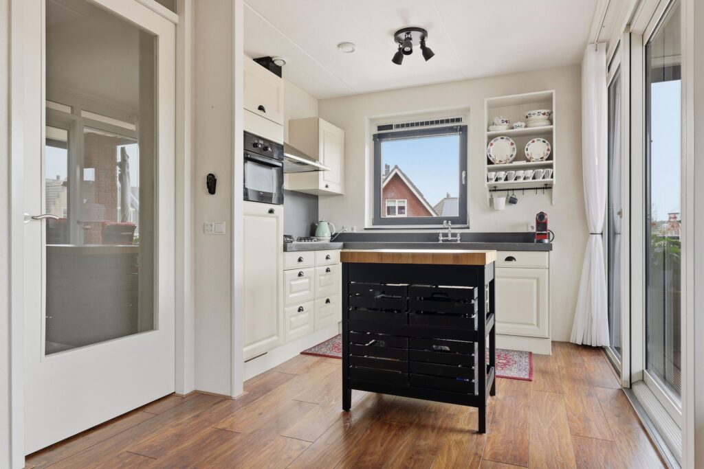De woonkamer is prettig en gezellig. De ruimte biedt volop mogelijkheden voor een comfortabele zithoek en een gezellige eethoek. Aansluitend vind je de moderne open keuken in landelijke stijl, voorzien van diverse inbouwapparatuur.