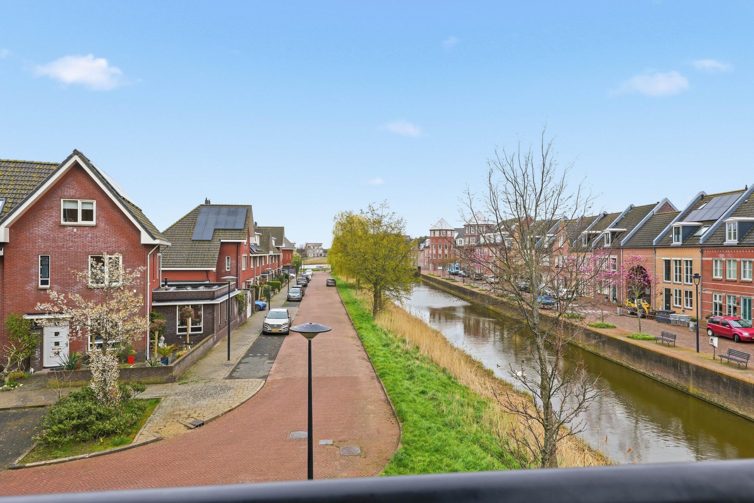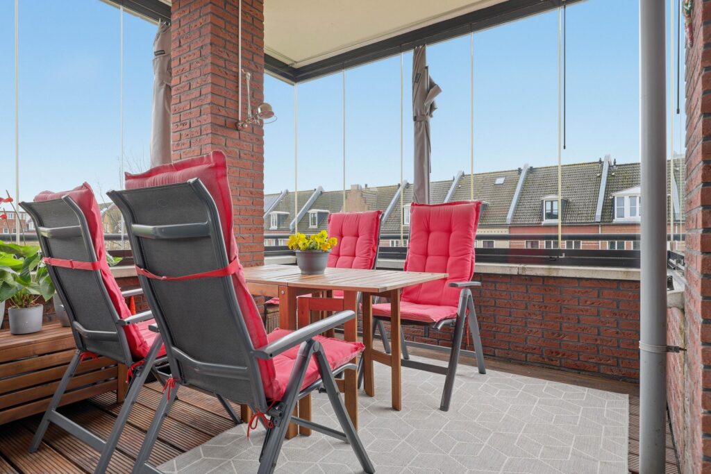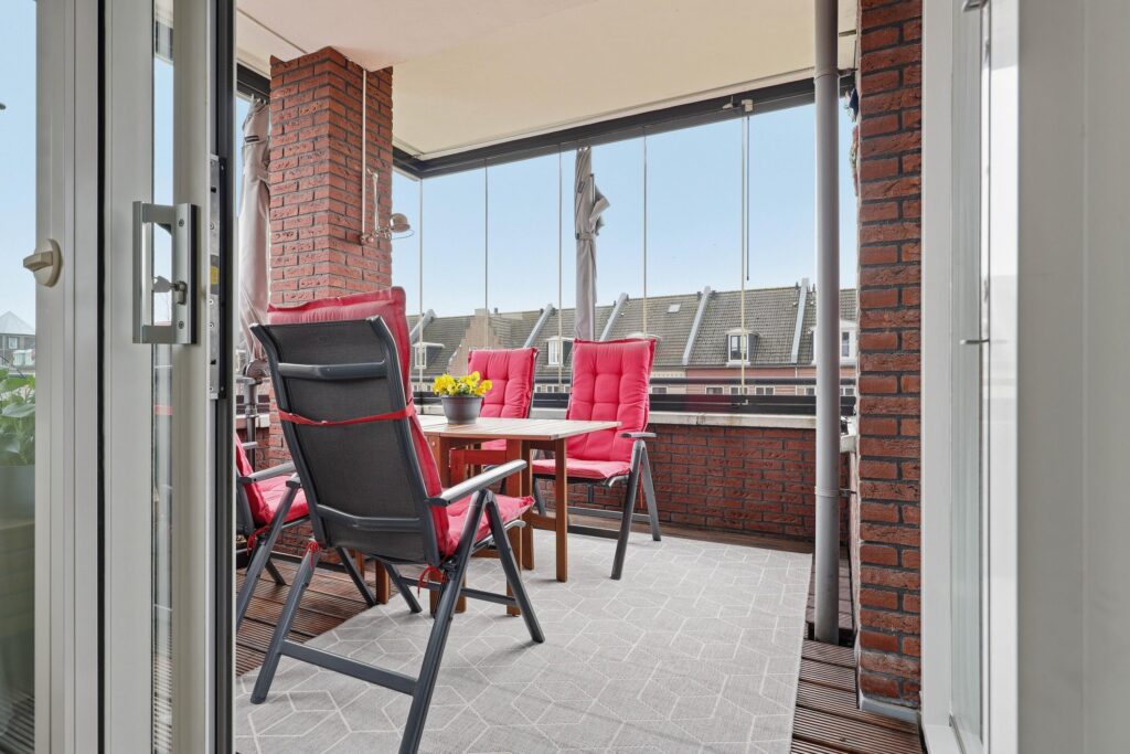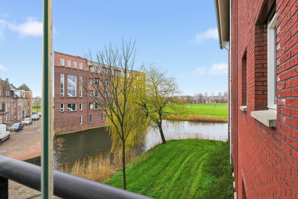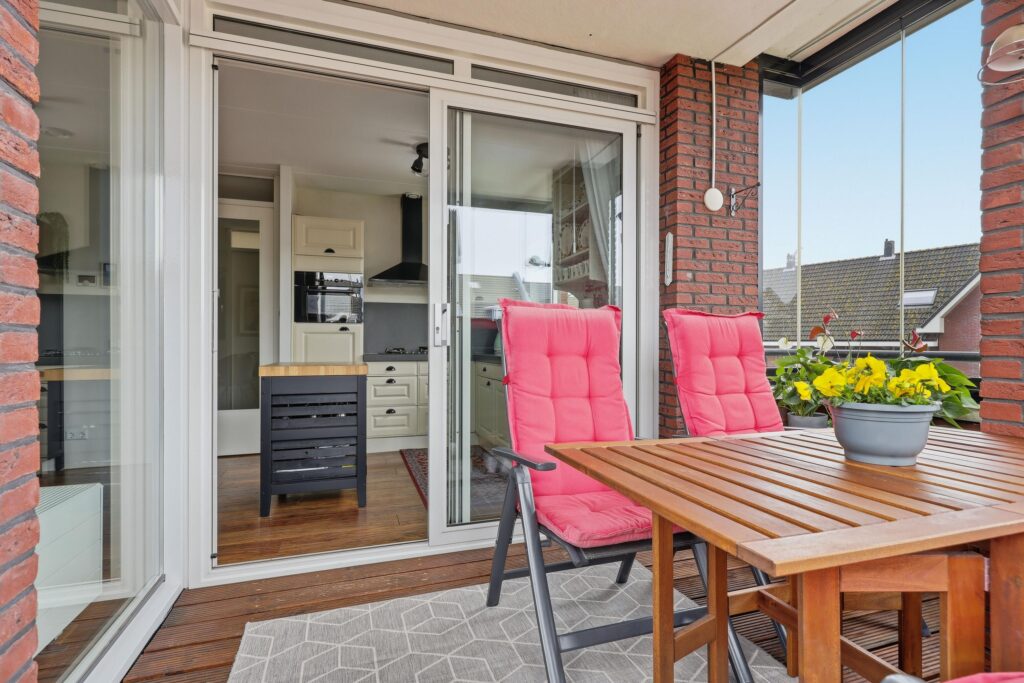 Vanuit de woonkamer stap je zo het ruime balkon op het zuidoosten op, dat is voorzien van glazen schuiframen. Hierdoor kun je al vroeg in het jaar en tot laat in het seizoen genieten van deze fijne buitenruimte, met uitzicht over het water en de groene omgeving.