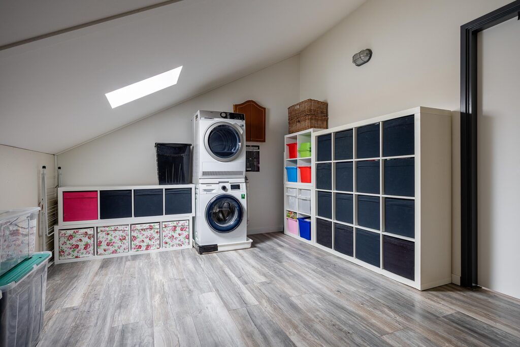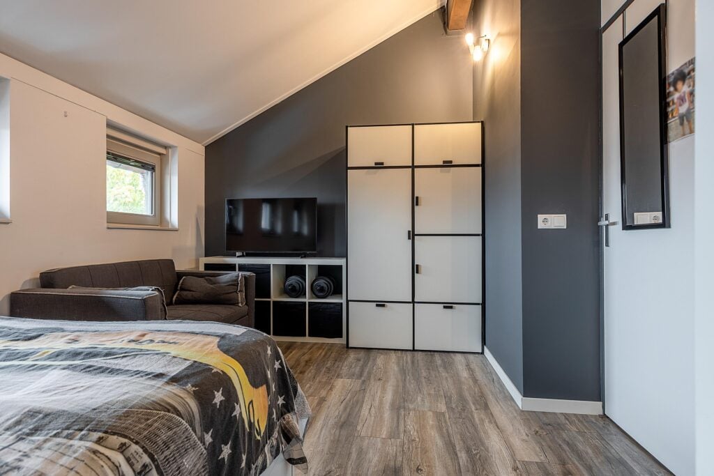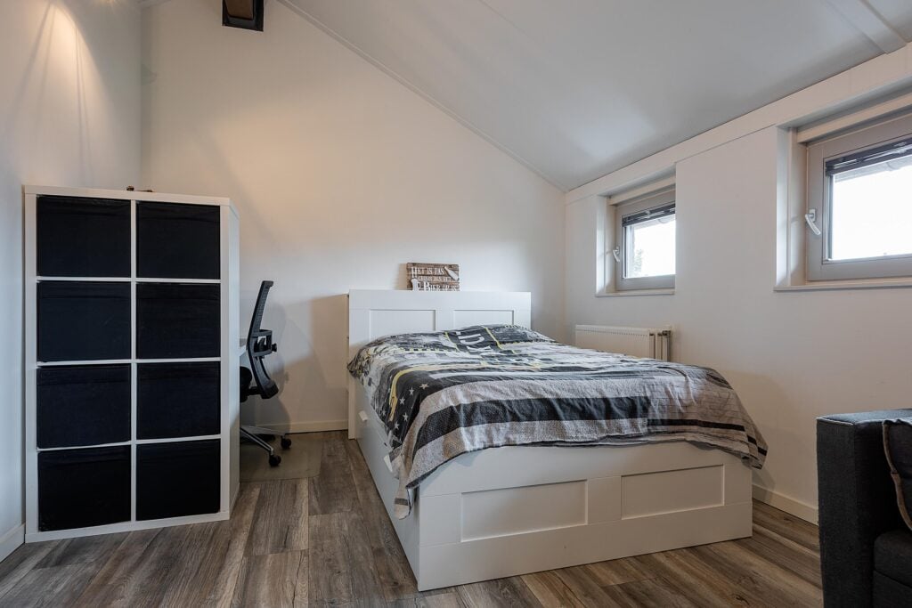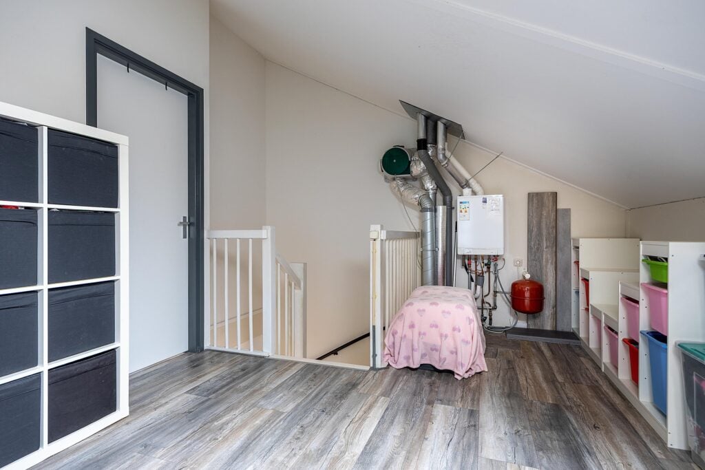 De tweede verdieping verrast met nog een ruime vierde slaapkamer die dankzij de verhoogde nok is deze verdieping zeer royaal en heerlijk licht is en bovendien diverse mogelijkheden biedt. Denk aan een royale ouderslaapkamer, een fijne tienerkamer of juist een rustige werkplek om thuis te kunnen werken. De kamer is ruim genoeg voor zowel een bed als een bureau of kastenwand en voelt door de hoogte extra ruimtelijk aan. Daarnaast is er een praktische overloop, waar de aansluitingen voor wasmachine en droger netjes zijn weggewerkt. Hier kun je gemakkelijk een aparte washoek creëren, zonder dat het ten koste gaat van de leefruimte. Ook is er volop extra bergruimte achter de knieschotten en op de vliering, ideaal voor koffers, seizoensspullen of sportmateriaal. Met optioneel het plaatsen van een dakkapel wordt deze ruimte nog breder inzetbaar.