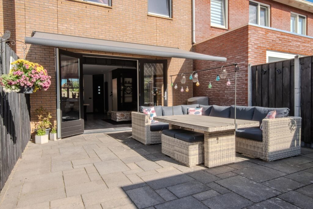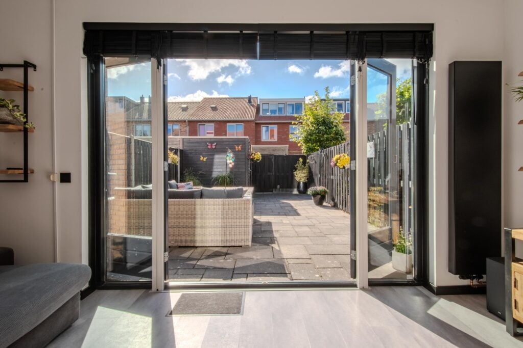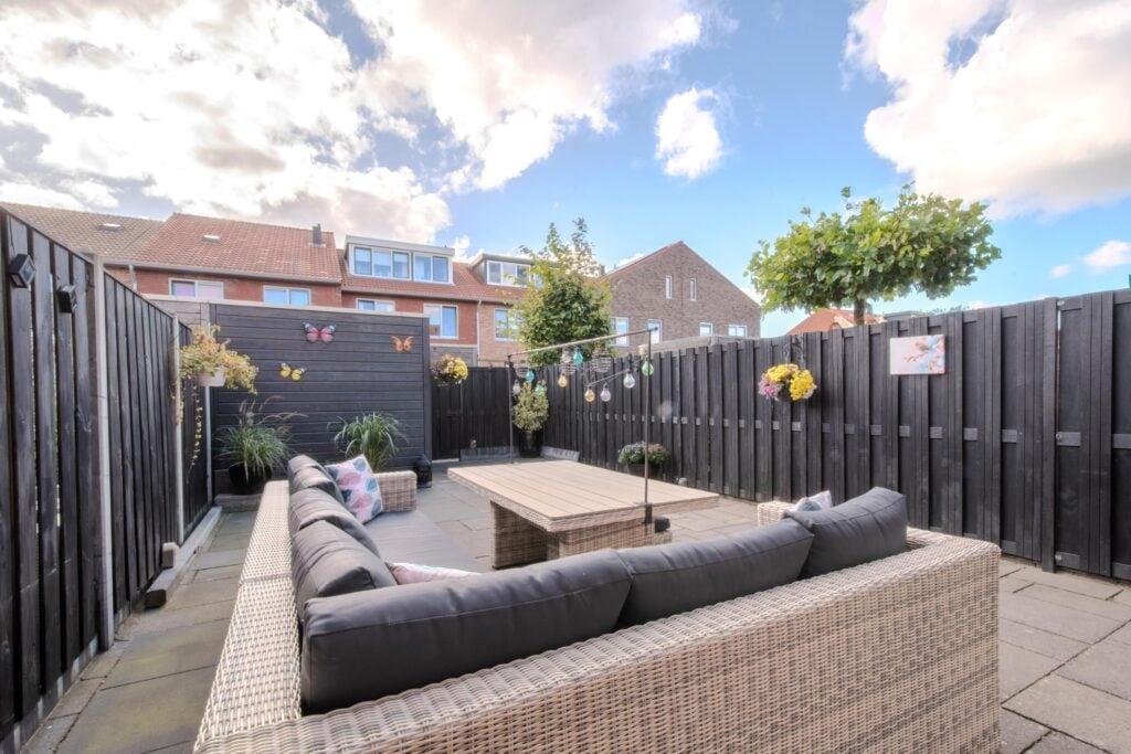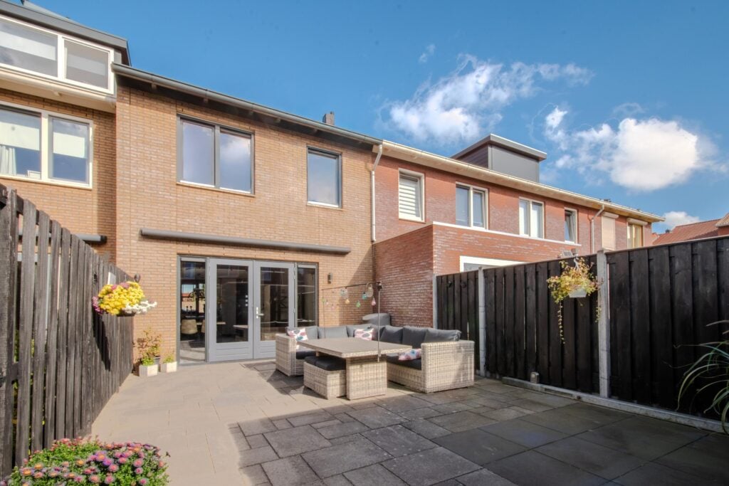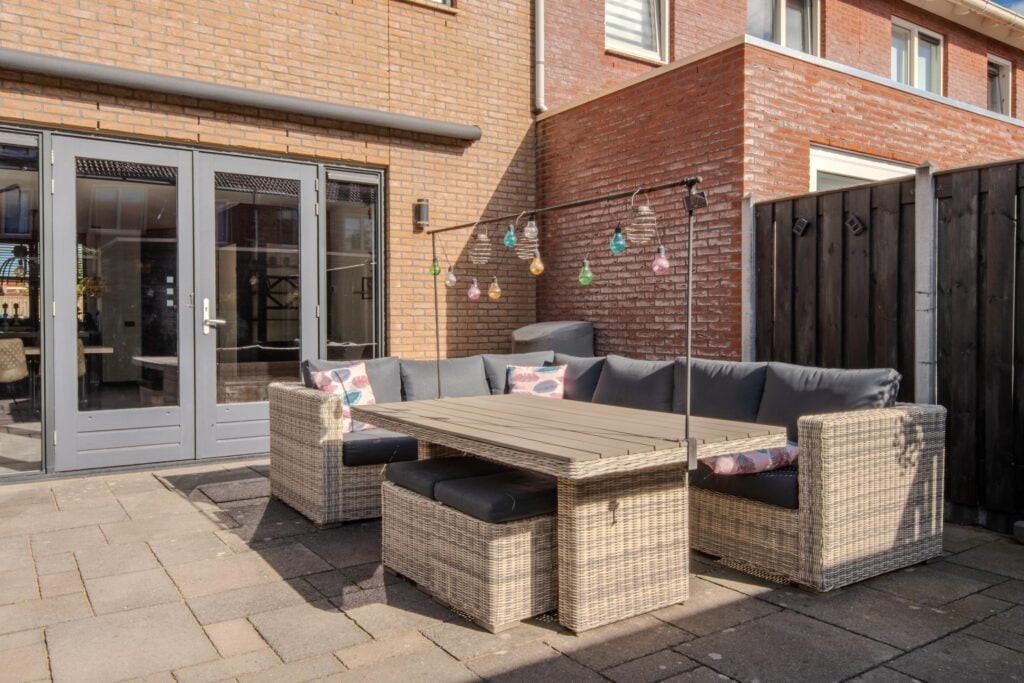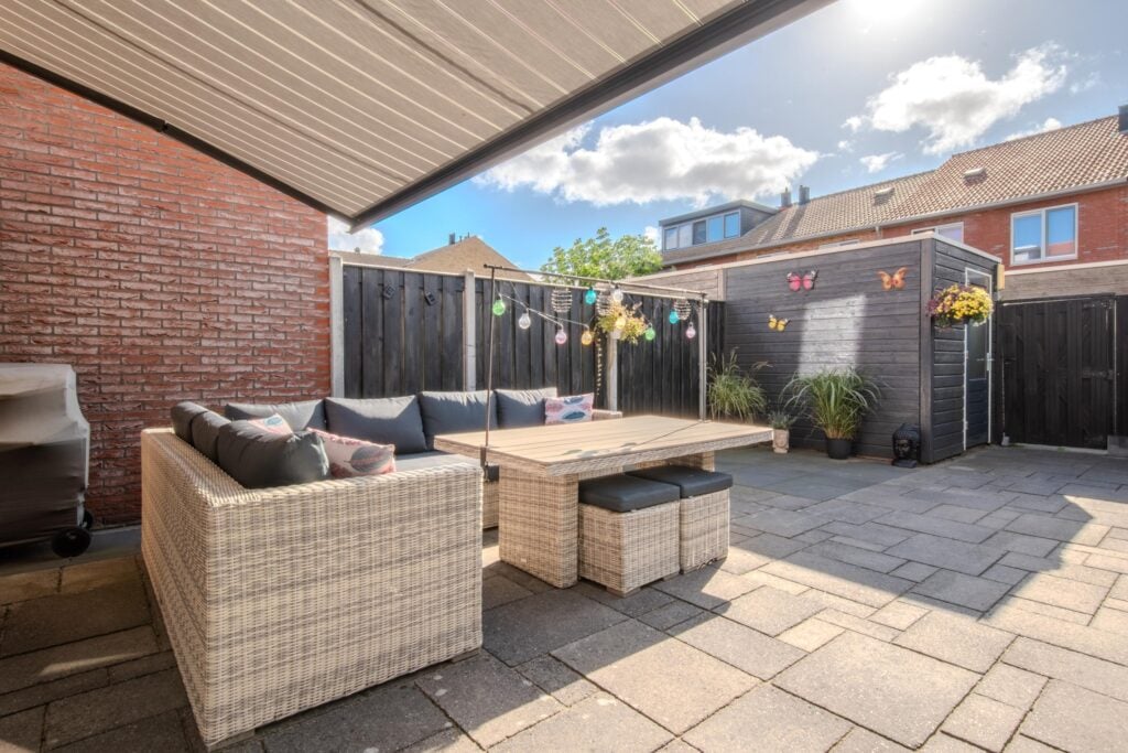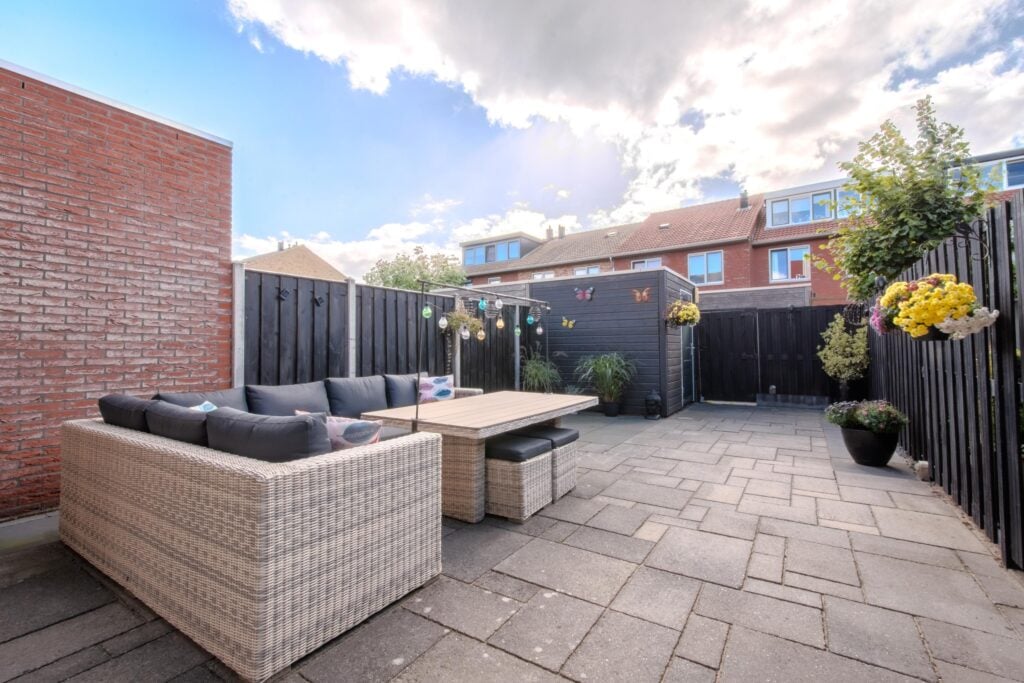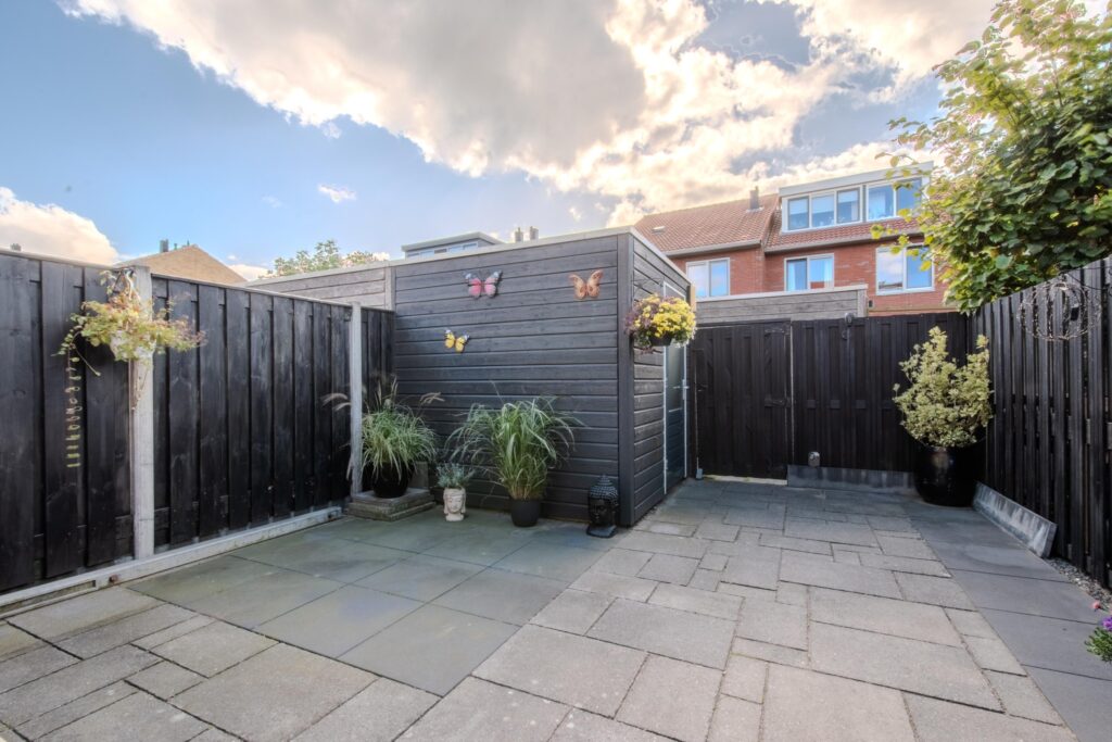 Achter de deuren wacht een zonnige tuin van circa 51 m² op het zuidwesten. Een plek waar je eindeloos kunt genieten: ontbijten in de ochtendzon, loungen of barbecueën in de avondzon, of een fijne speelplek voor de kinderen creëren. Achterin de tuin staat een houten berging, ideaal voor fietsen, tuingereedschap en extra opslag.