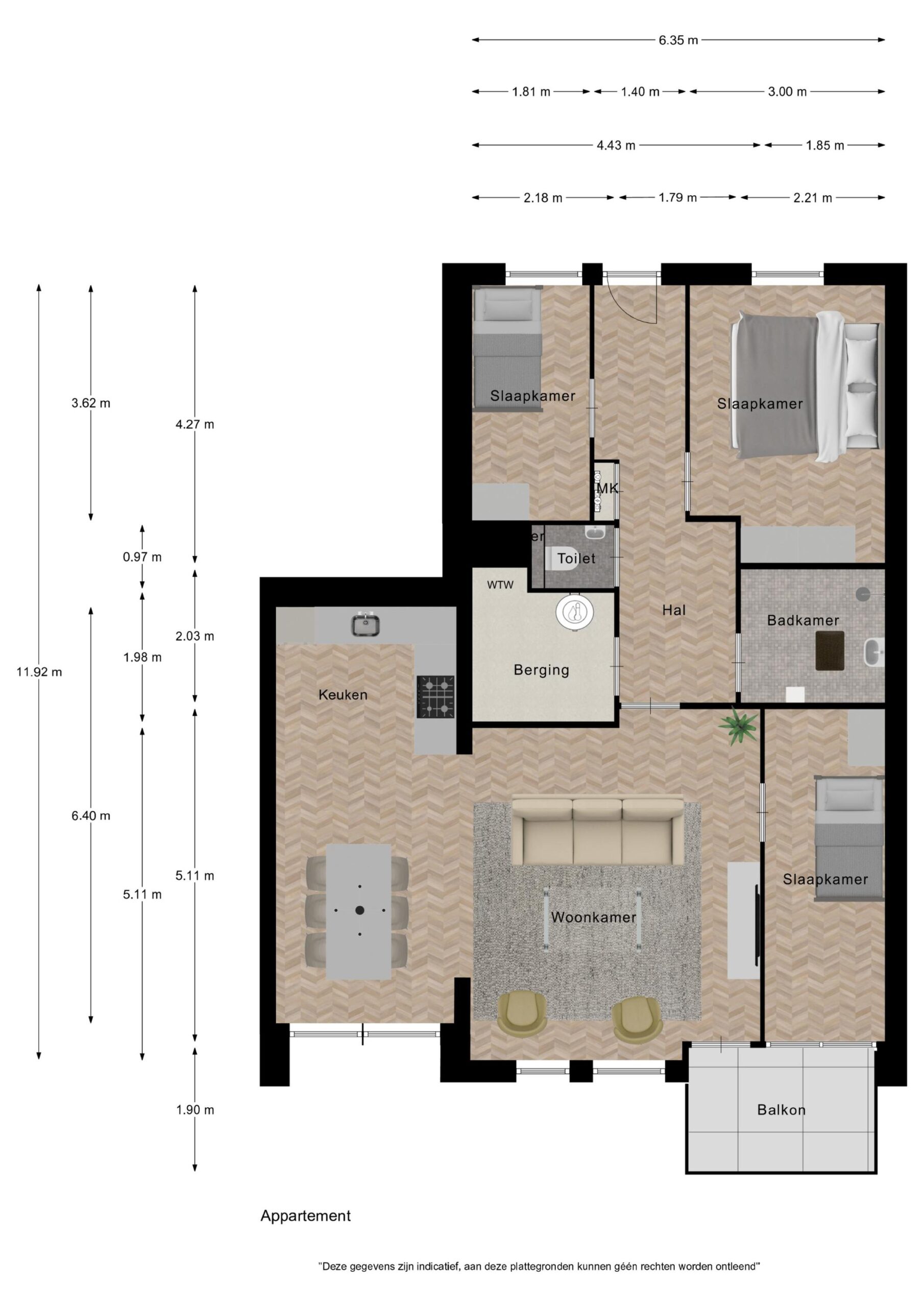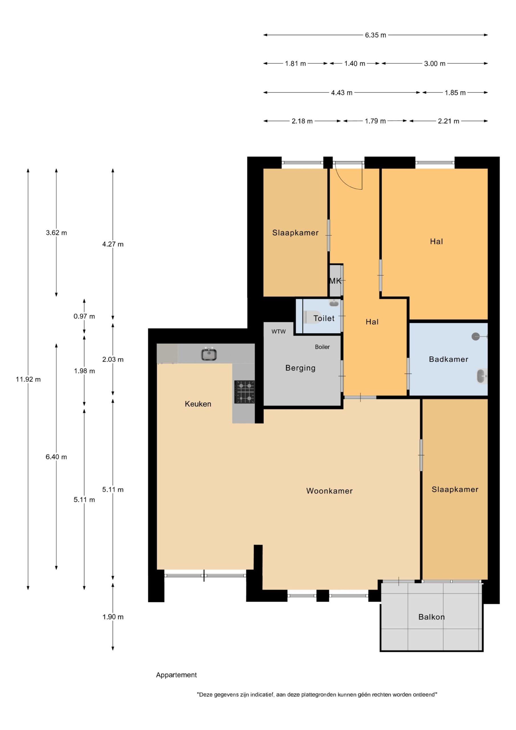 Vanuit de hal is er toegang tot alle vertrekken. Het appartement beschikt over drie slaapkamers, een ruime badkamer met wastafel, inloopdouche en design handdoekradiator en een open keuken met diverse inbouwapparatuur. Het gehele appartement is voorzien van vloerverwarming en de woning is gas loos.