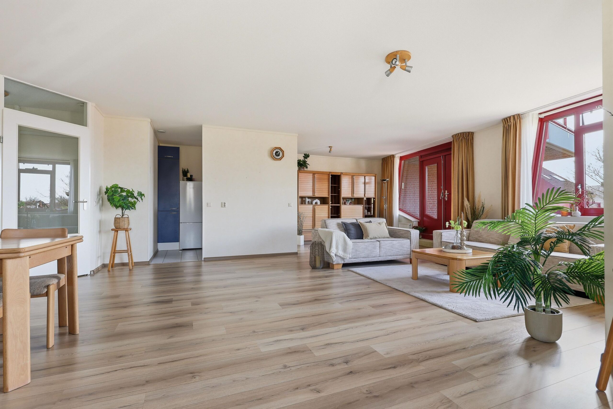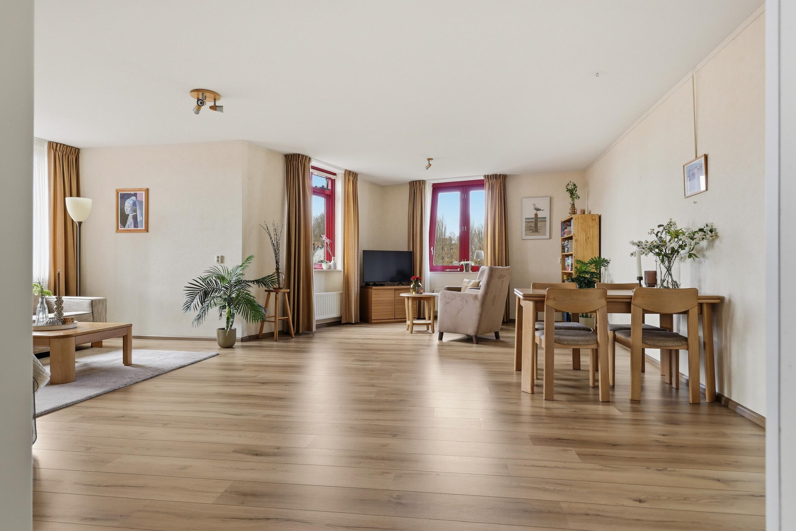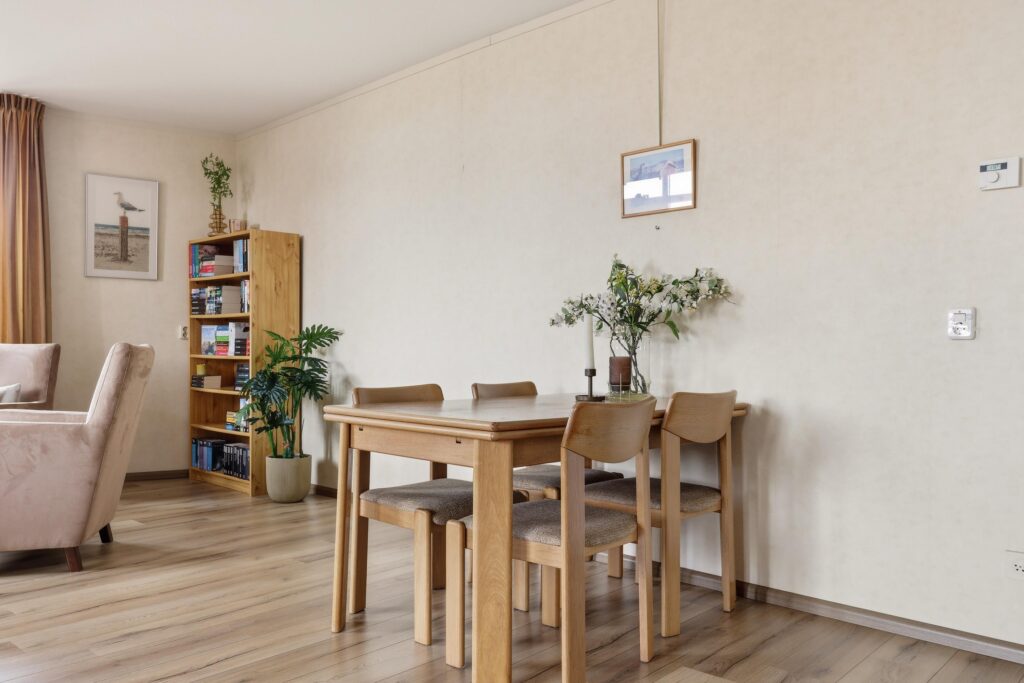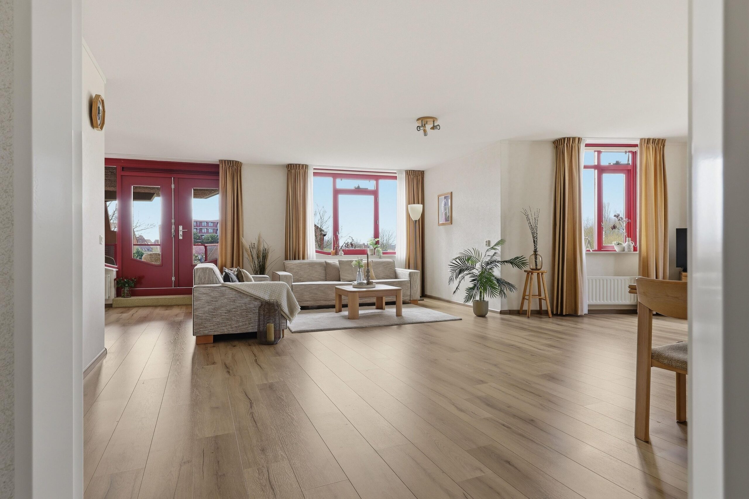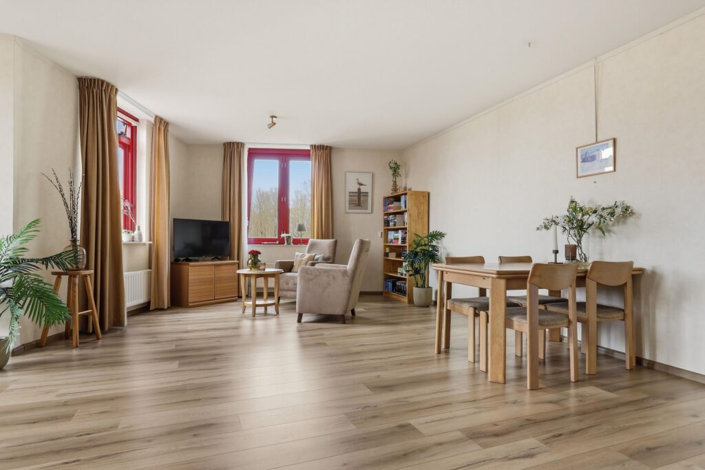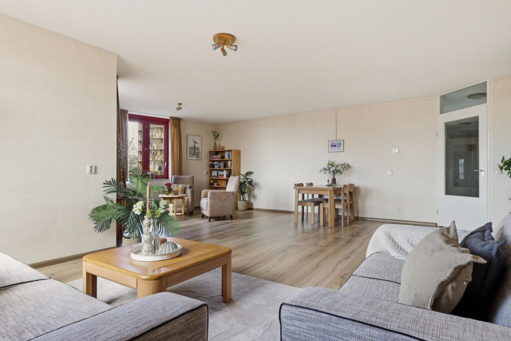 De woonkamer is opvallend ruim en heeft een fijne verbinding naar het balkon. De nette laminaatvloer en rustige afwerking geven het geheel een warme uitstraling en maken het eenvoudig om hier een comfortabele zit- en eethoek te creëren. Het balkon is ruim opgezet en biedt een vrij uitzicht over de omgeving, een fijne plek om te ontspannen.