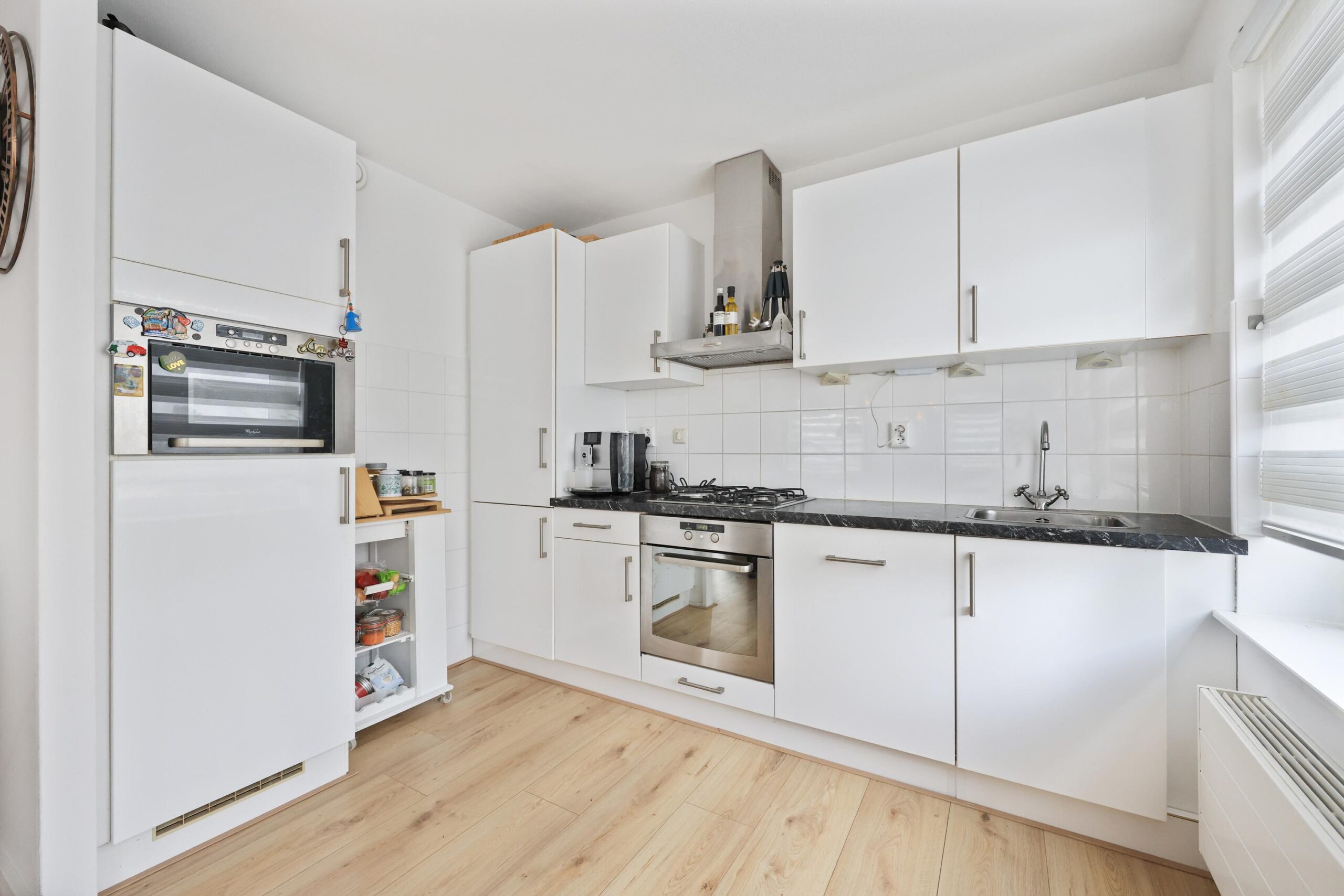 De open keuken uit 2008 is praktisch ingericht en voorzien van de benodigde inbouwapparatuur en kastruimte. Het appartement beschikt over twee slaapkamers. De hoofdslaapkamer is ruim en comfortabel. De tweede slaapkamer wordt momenteel gebruikt als kastenkamer, maar kan ook prima dienen als werk-, logeer- of kinderkamer.