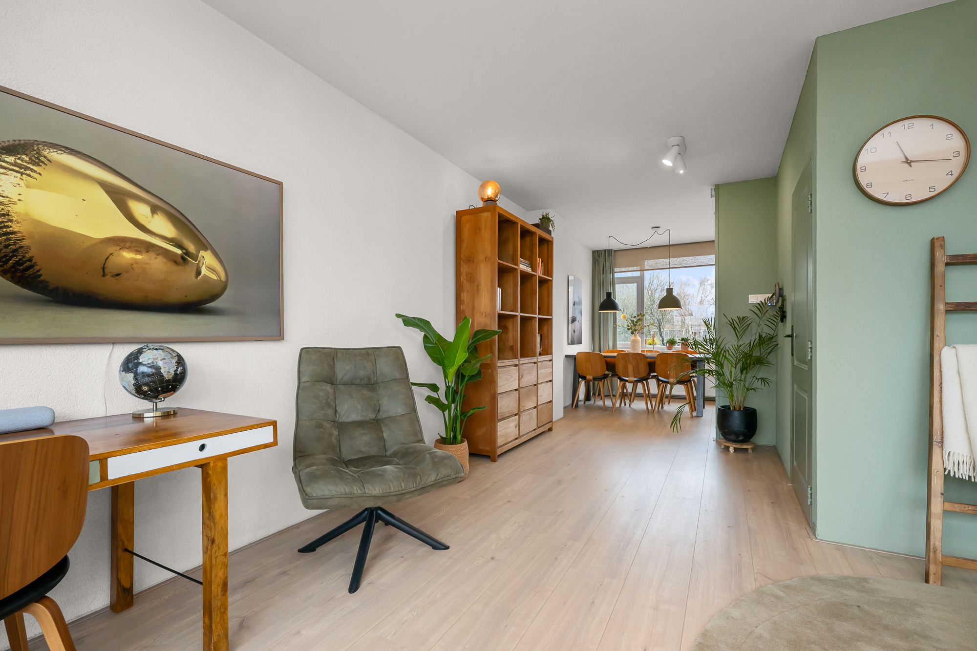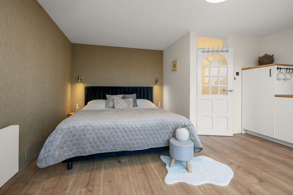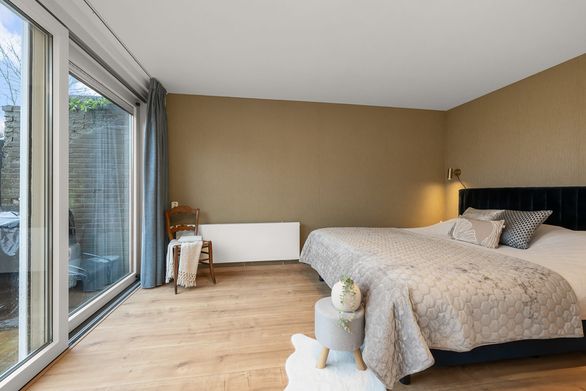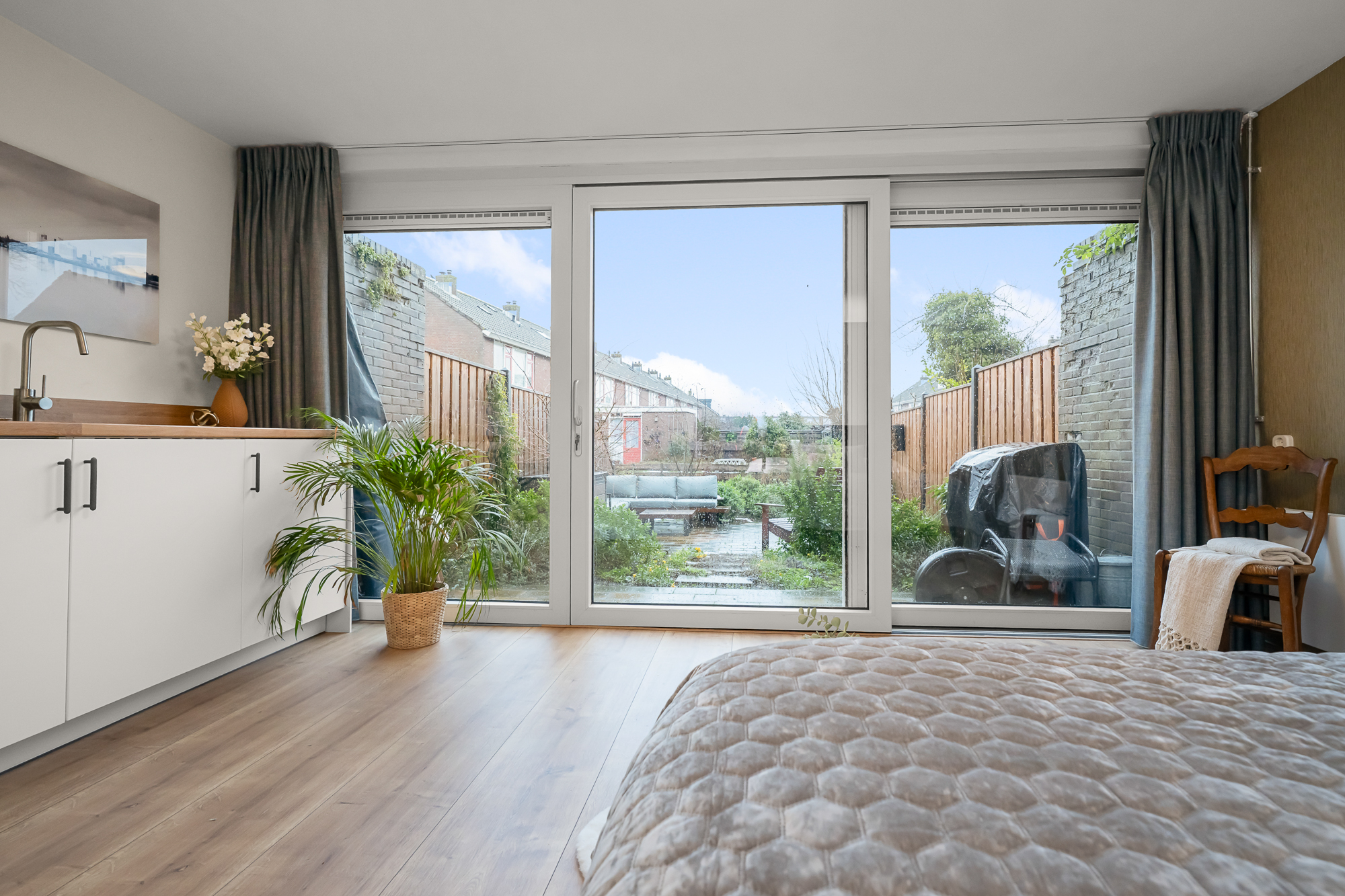 Via de entree kom je in de hal met toilet, meterkast, toegang tot de garage en trapopgang. Vanuit hier is er toegang tot de slaapkamer/werkkamer met pantry, die dankzij de raampartijen prettig licht is. Aan de achterzijde is in 2023 een schuifpui geplaatst, waardoor de kamer mooi in verbinding staat met de tuin.