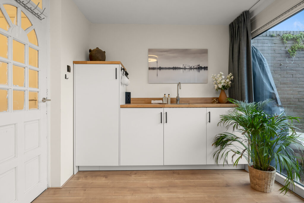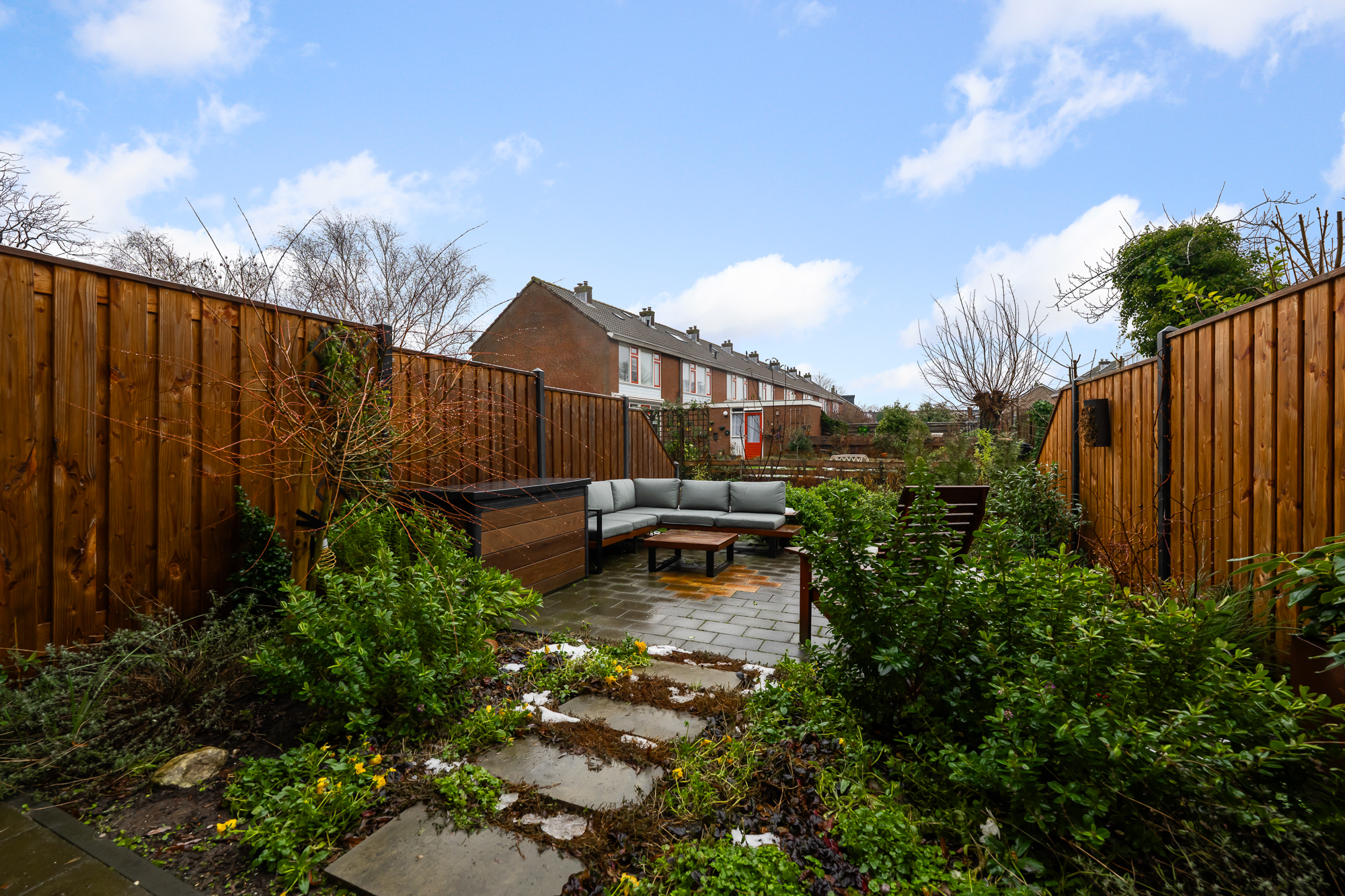 Buiten beschikt de woning over een achtertuin van circa 50 m², gelegen aan vaarwater met een directe verbinding tot het Wormer- en Jisperveld. De tuin biedt ruimte voor zitgelegenheid en buitenleven. Daarnaast is er een inpandige garage aanwezig, geschikt voor opslag of andere praktische doeleinden en voorzien van een elektrische garagedeur.