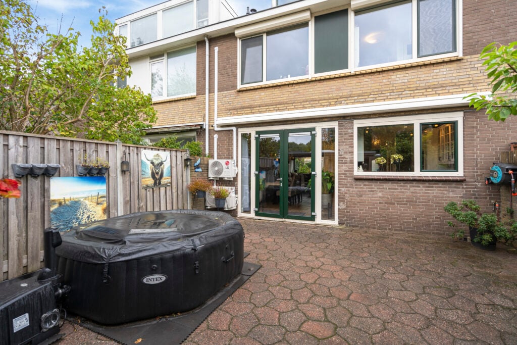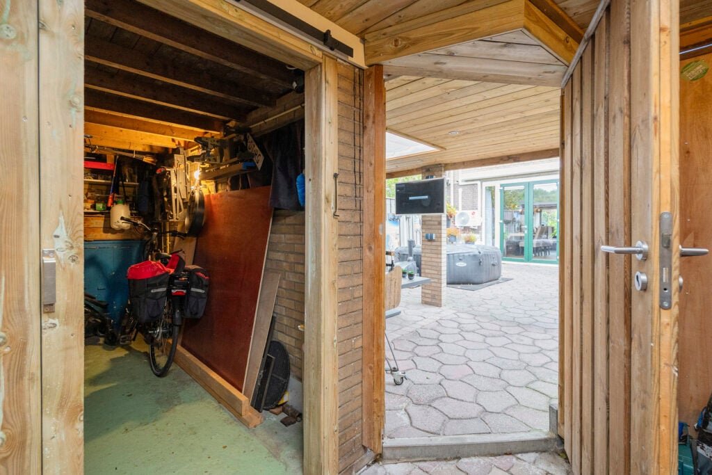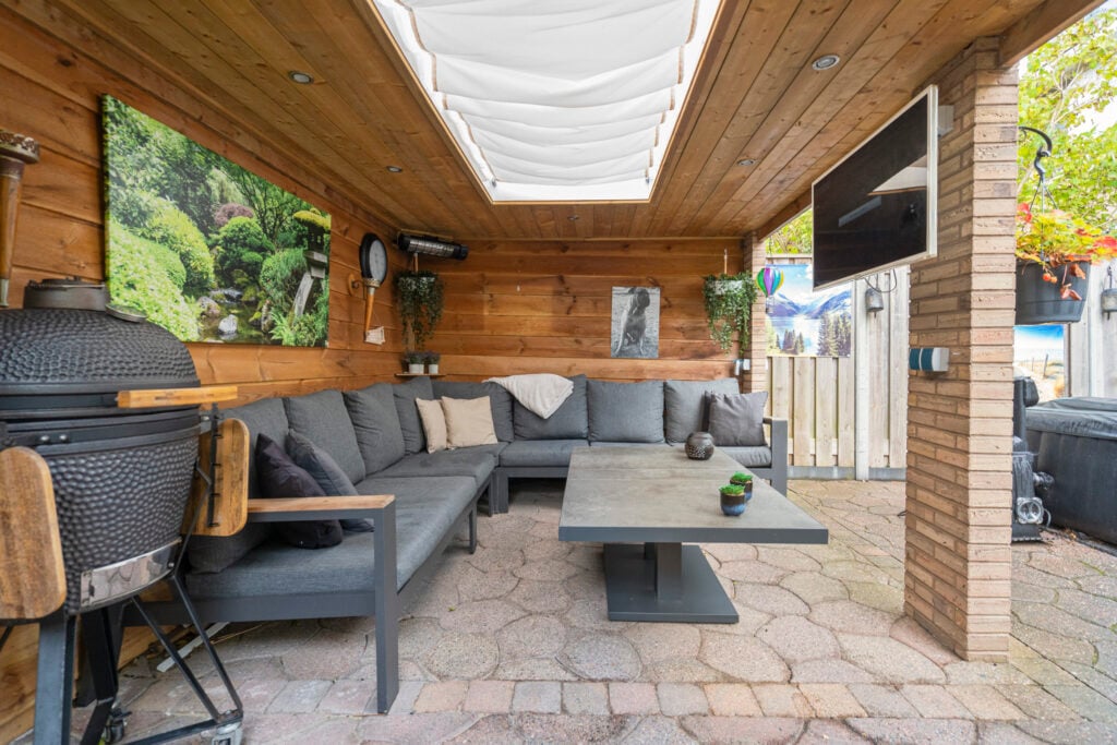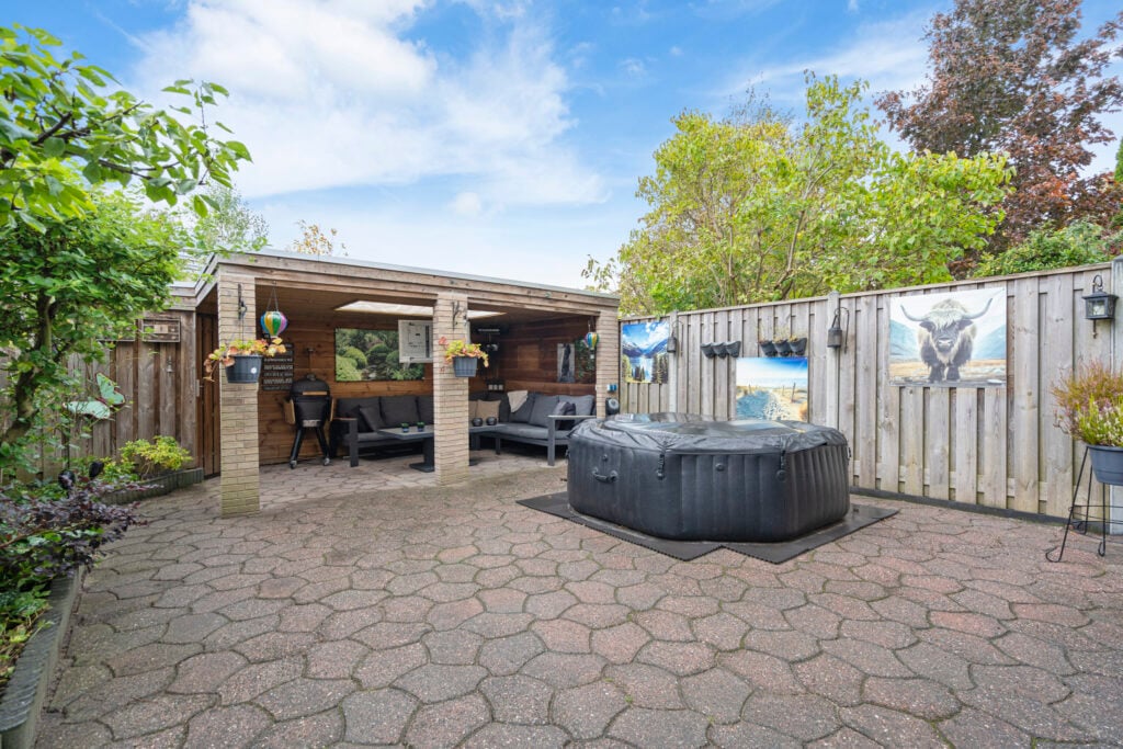 De op het westen gerichte achtertuin biedt, net als de woning, veel ruimte en een zonnige ligging. Een overkapping, compleet met inbouwspotjes en elektriciteitsaansluitingen, creëert de ideale setting voor zomerse avonden. Bovendien beschikt de woning over een eigen achterom en een aparte buitenberging.