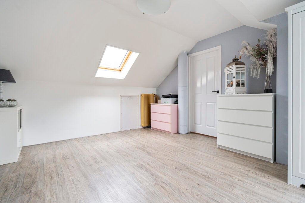 De tweede verdieping is een open en royale ruimte die uitstekend dienstdoet als master bedroom. Extra ruimte is verkregen door de toevoeging van een dakkappel, wat de kamer nog imposanter maakt. Tevens is hier een handige voorzolder met bergruimte, en de cv-ketel en wasmachine zijn netjes in een kast weggewerkt.
