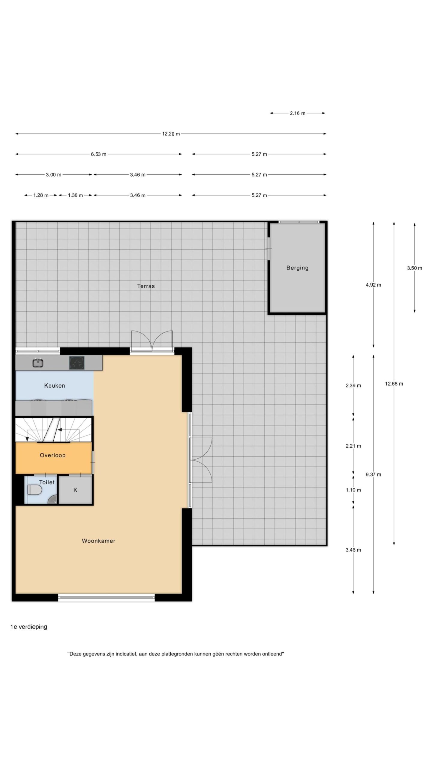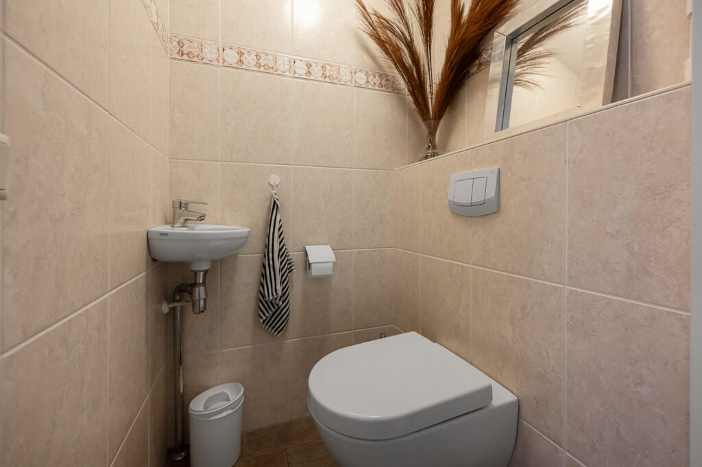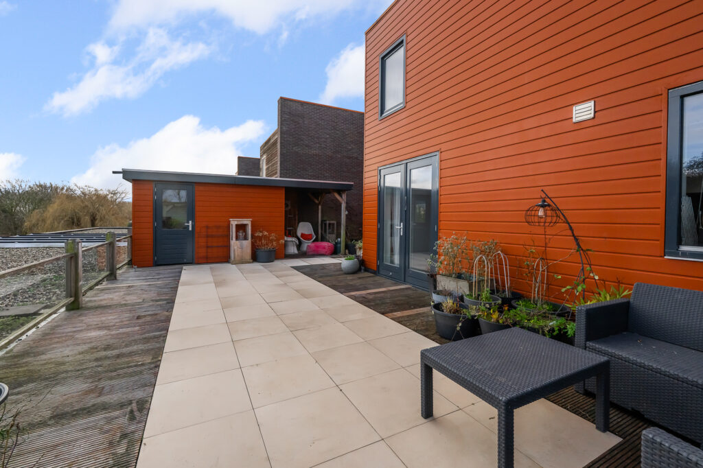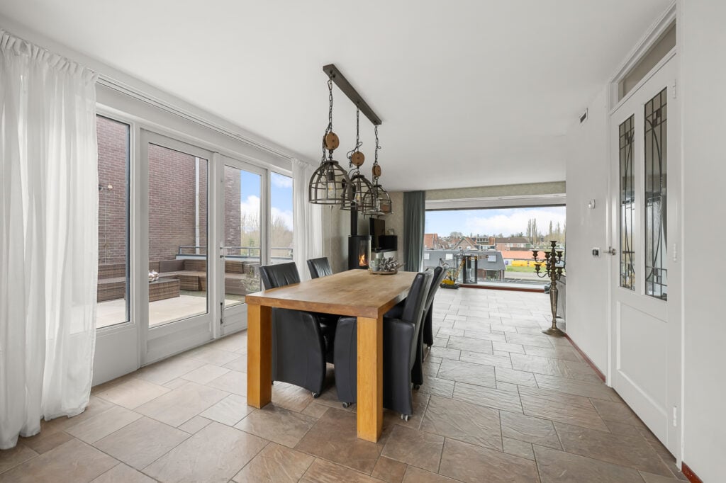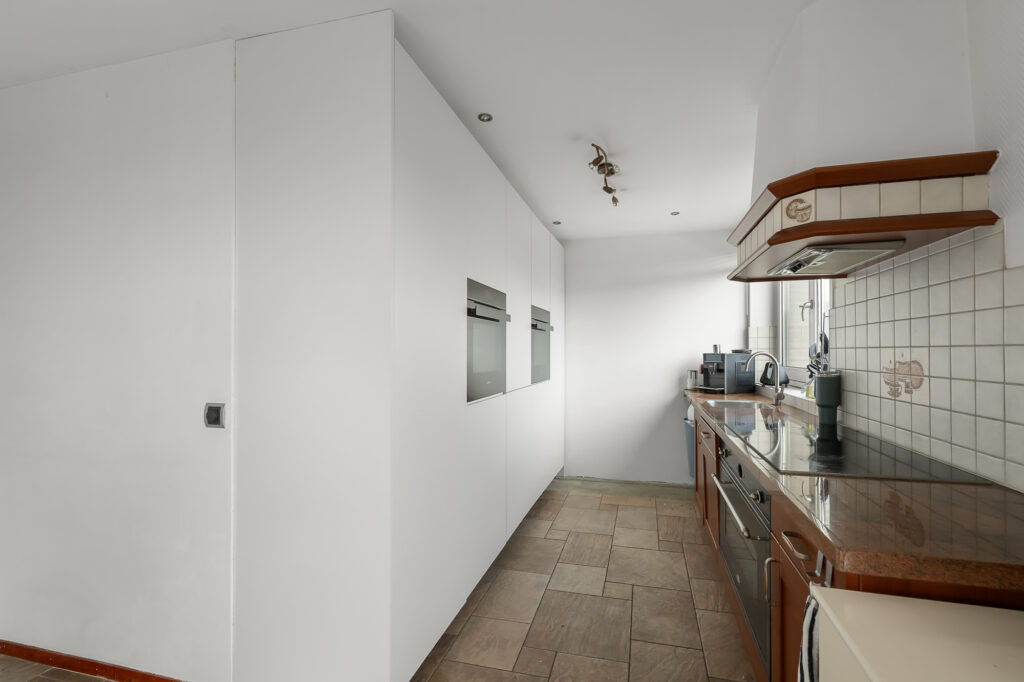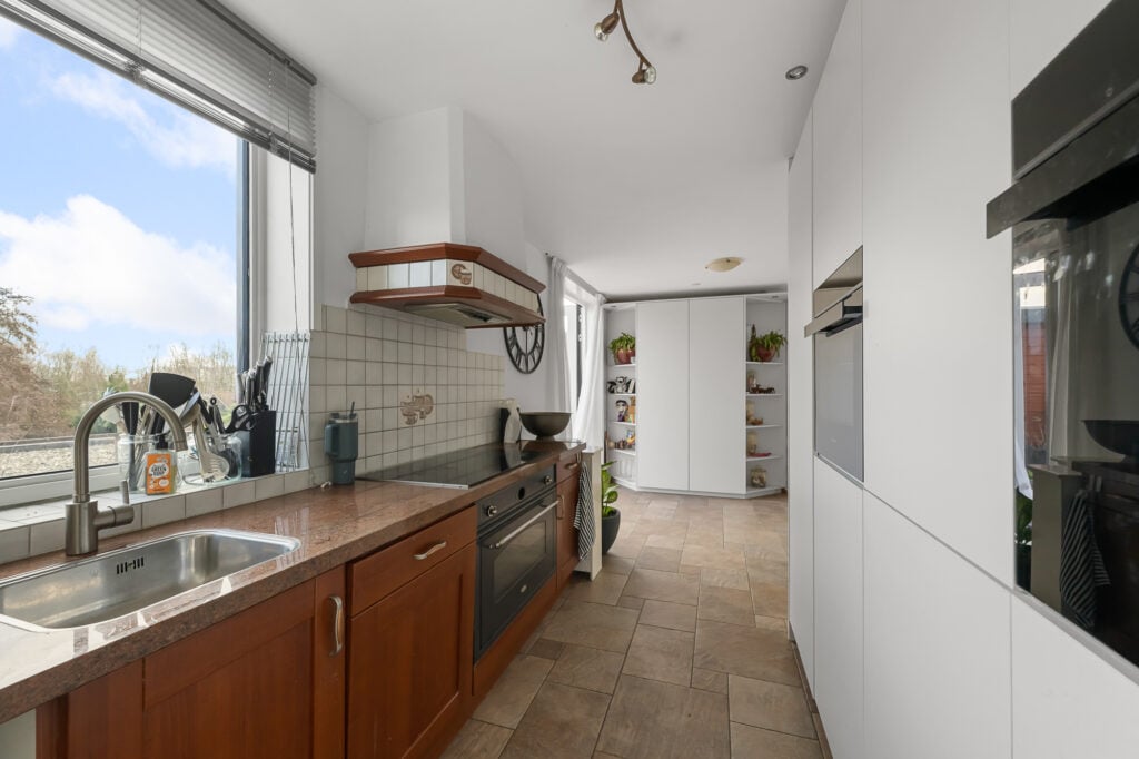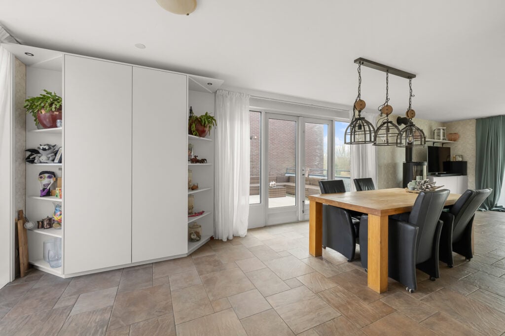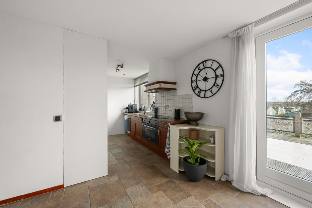 Op de eerste verdieping kom je uit op de overloop, waar zich het toilet bevindt. Vanuit hier stap je de woonverdieping binnen. Aan de voorzijde van de woning ligt de woonkamer, een prettige leefruimte met een fijne lichtinval. Centraal in de woning bevindt zich het eetgedeelte, dat de woonkamer en keuken op natuurlijke wijze met elkaar verbindt. De keuken is aan de achterzijde gesitueerd en praktisch ingericht, met aan de ene zijde kasten en aan de andere zijde het werkblad. Zowel via het eetgedeelte als via de keuken is het royale dakterras bereikbaar. Dit is een absolute eyecatcher van de woning, een groot buitenverblijf waar je in alle rust kunt zitten, eten of ontspannen.