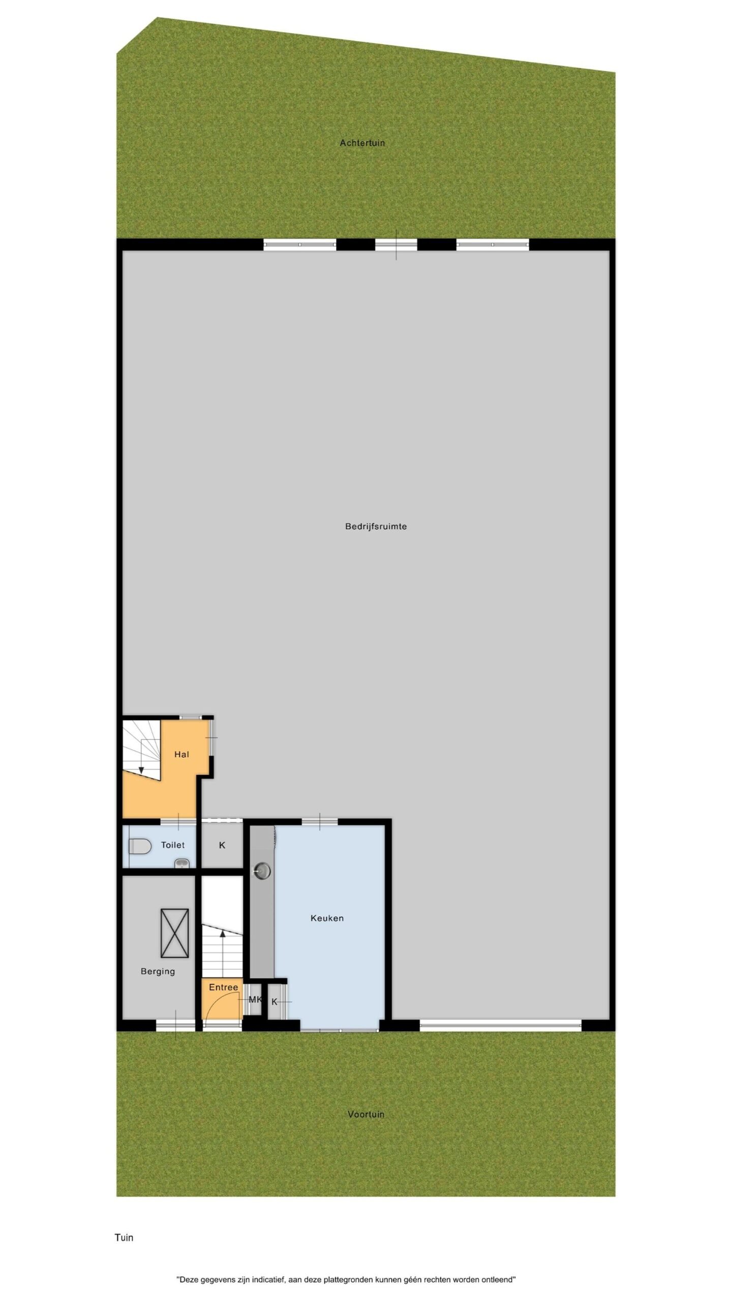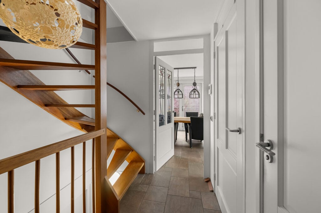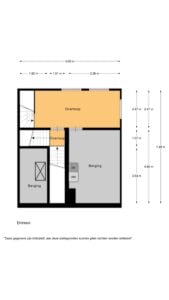 De begane grond is praktisch en doordacht ingericht. Aan de voorzijde bevindt zich de voordeur, waar je binnenkomt in een hal met direct toegang tot de trap naar de woonverdieping. Daarnaast is er een inpandige berging met een eigen entree, ideaal voor extra opslag of dagelijks gemak.