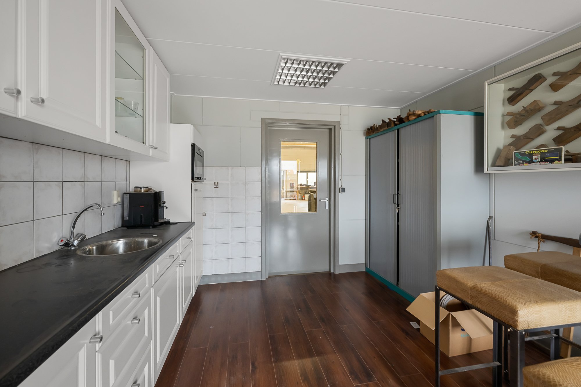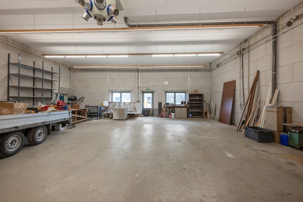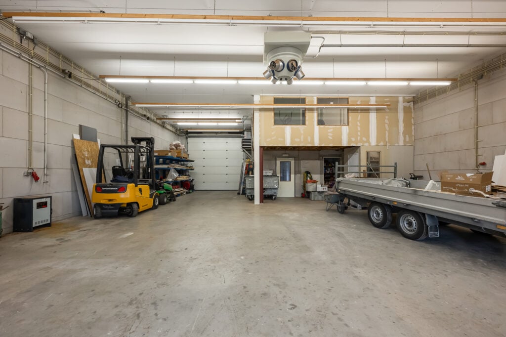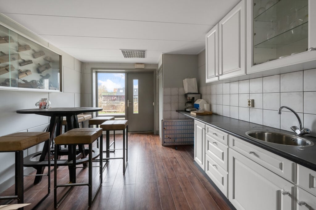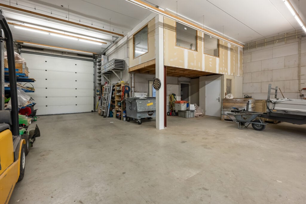 De garagedeur leidt naar de indrukwekkende bedrijfsruimte. Deze werkruimte, loods of bedrijfsruimte is ruim van opzet en biedt talloze gebruiksmogelijkheden. Binnen is een keukentje, ofwel kantine, aanwezig en vanuit deze ruimte is er directe toegang tot de (mandelige) achtertuin. Hierdoor is het een fijne plek om te werken, met voldoende comfort en daglicht.