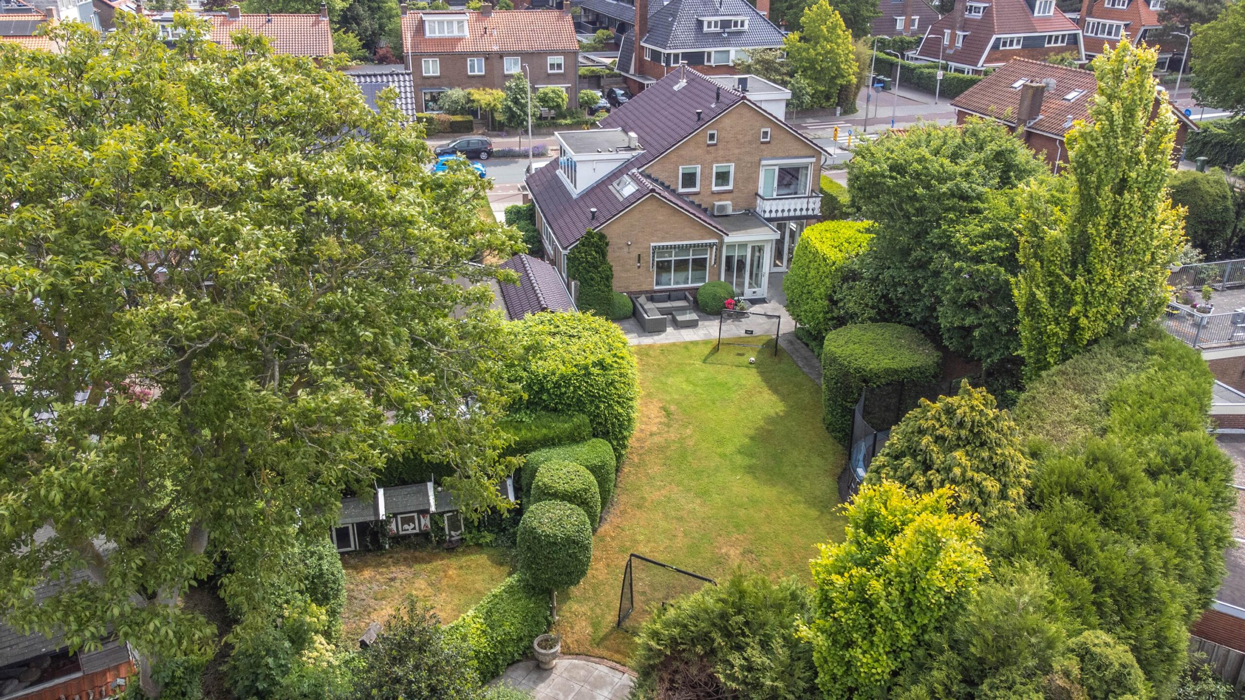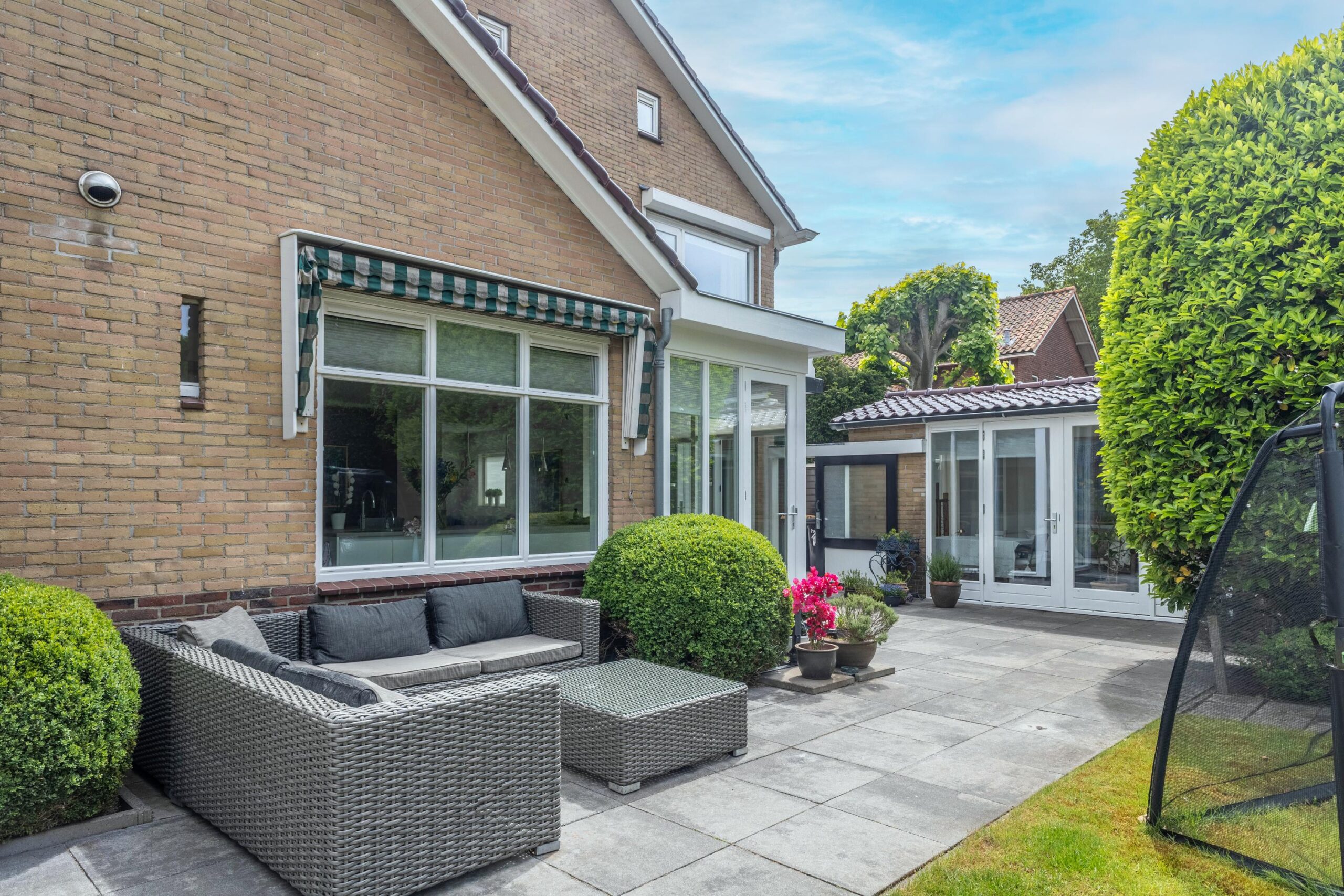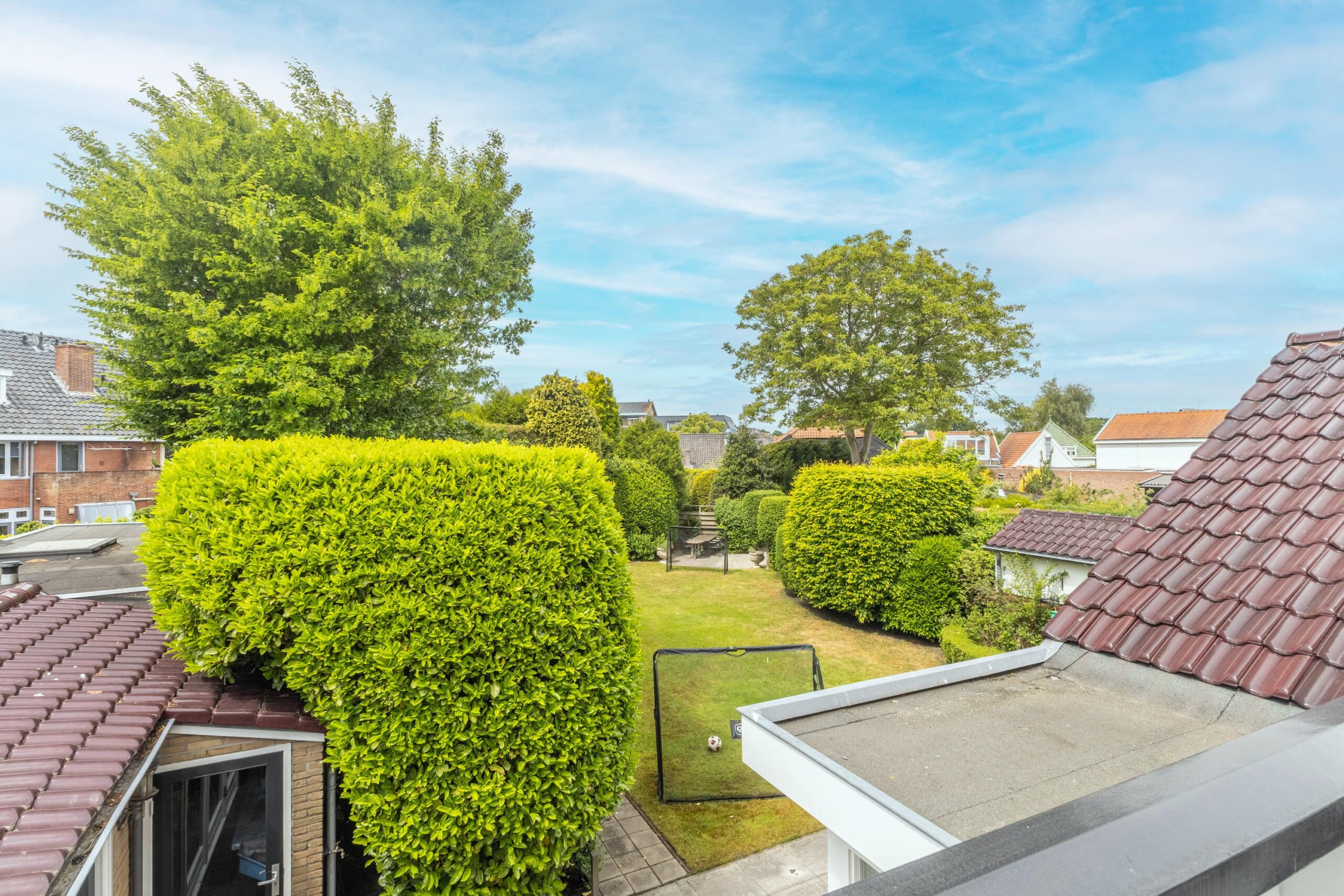 The impressive and sunny backyard, spanning no less than 470 m², is an idyllic space where you can relax, garden, or spend time with your family. This garden offers complete privacy and features two sheds, a heated garden house with electricity and heating, and an automatic irrigation system. The beautiful open view makes this the perfect spot to unwind.
