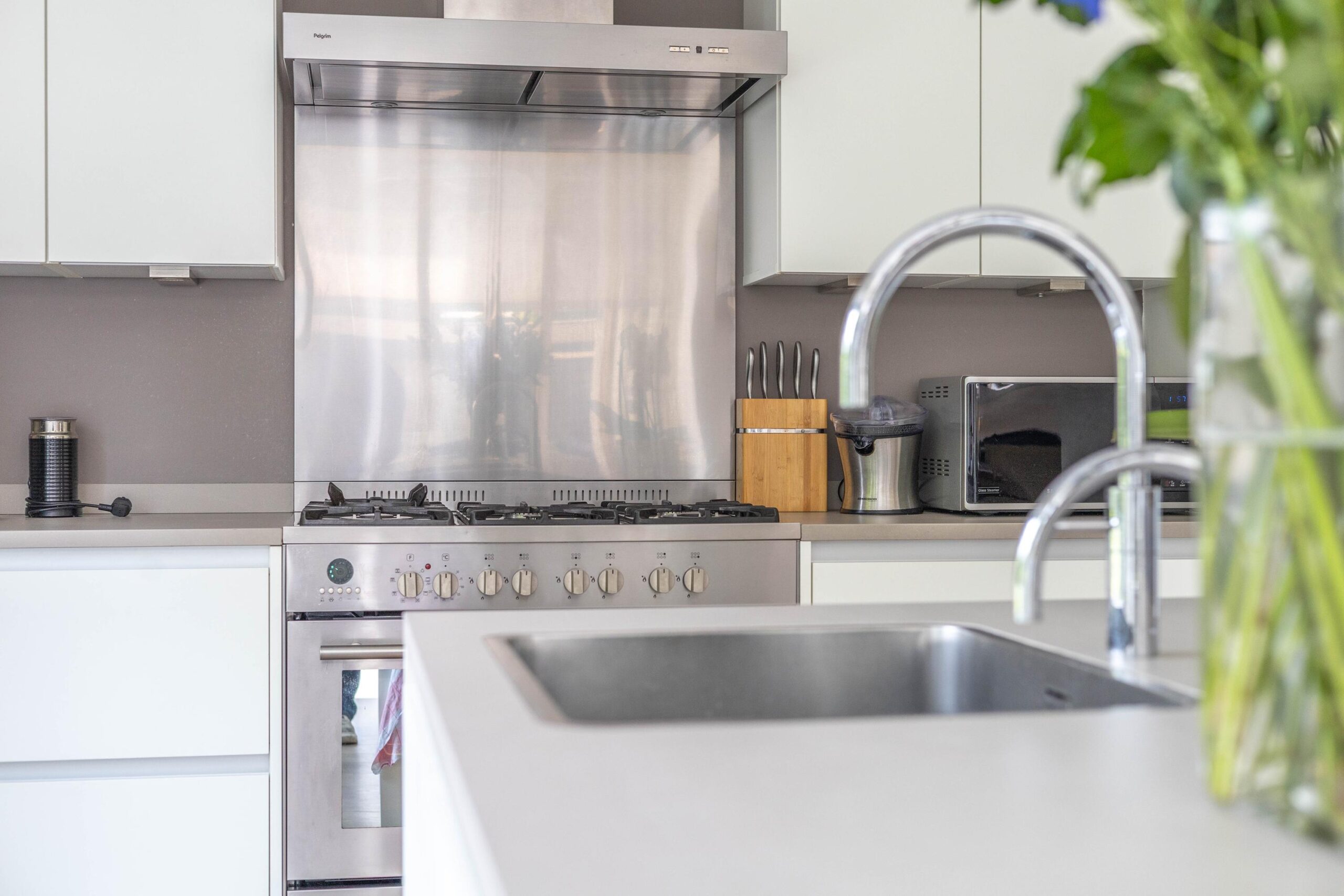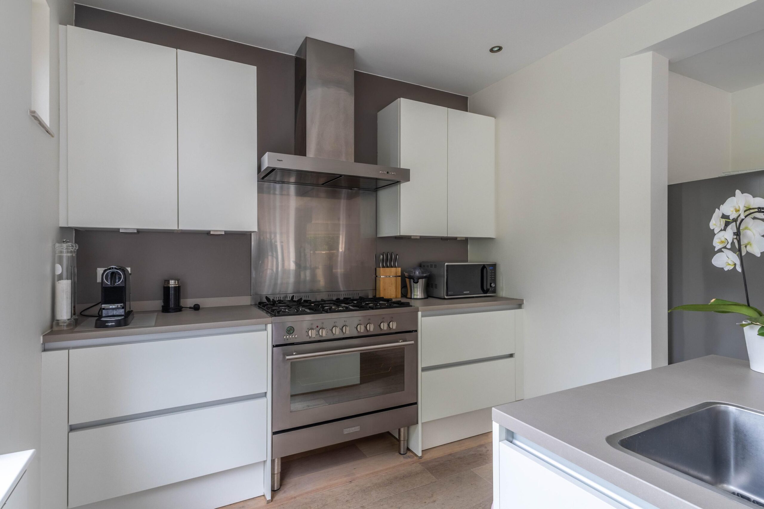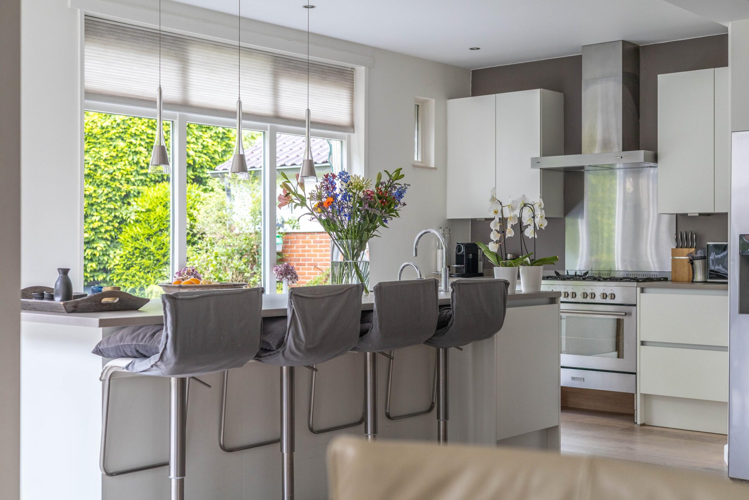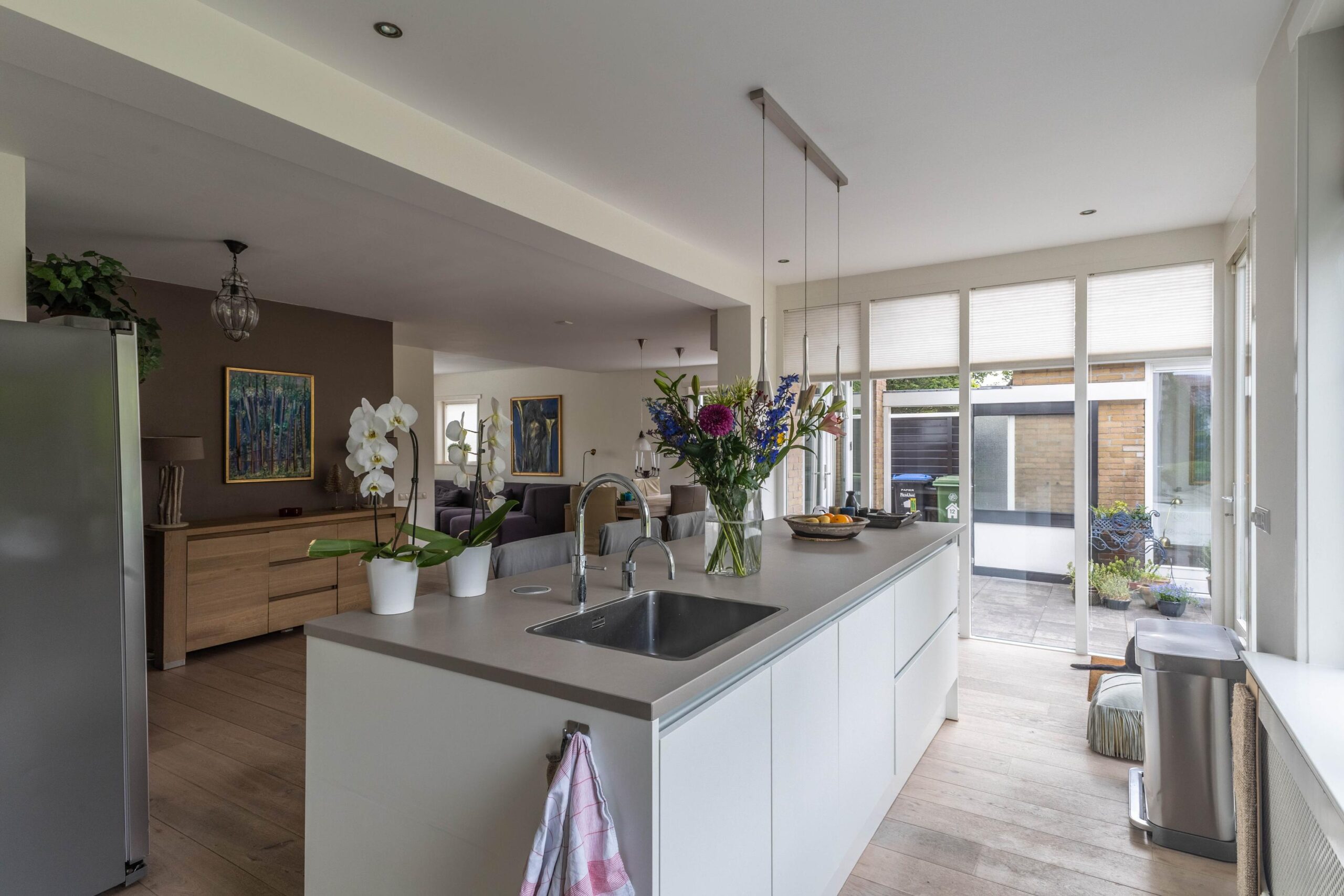 Upon entering the villa, you’ll step into a spacious hallway that provides access to the bathroom, a storage closet, and the charming living room. The living room, equipped with a soapstone wood-burning stove, flows into the dining room and a modern open kitchen. The kitchen features a cooking island, a six-burner gas stove, and various built-in appliances, including a Quooker, dishwasher, and oven. The large French doors create a stunning connection between the indoors and the expansive backyard.