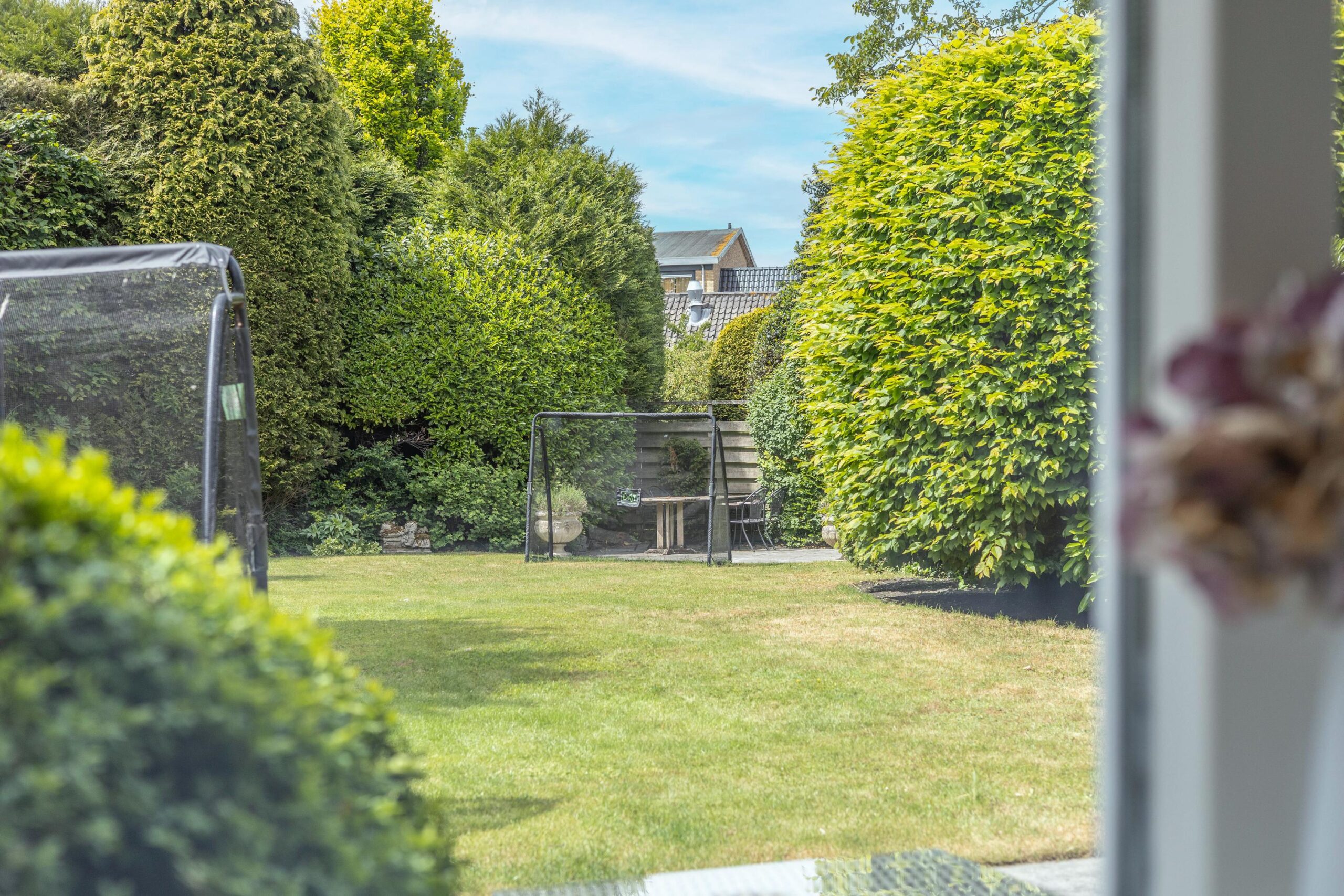 De indrukwekkende en zonnig gelegen achtertuin van maar liefst 470 m² is een idyllische ruimte waar je heerlijk kunt ontspannen, tuinieren of tijd doorbrengen met het gezin. Deze tuin biedt volledige privacy en is ingericht met twee schuren, een verwarmd tuinhuis met elektra en verwarming én een automatisch sproeisysteem. Een heerlijk vrij uitzicht maakt dit tot een perfecte plek om tot rust te komen.