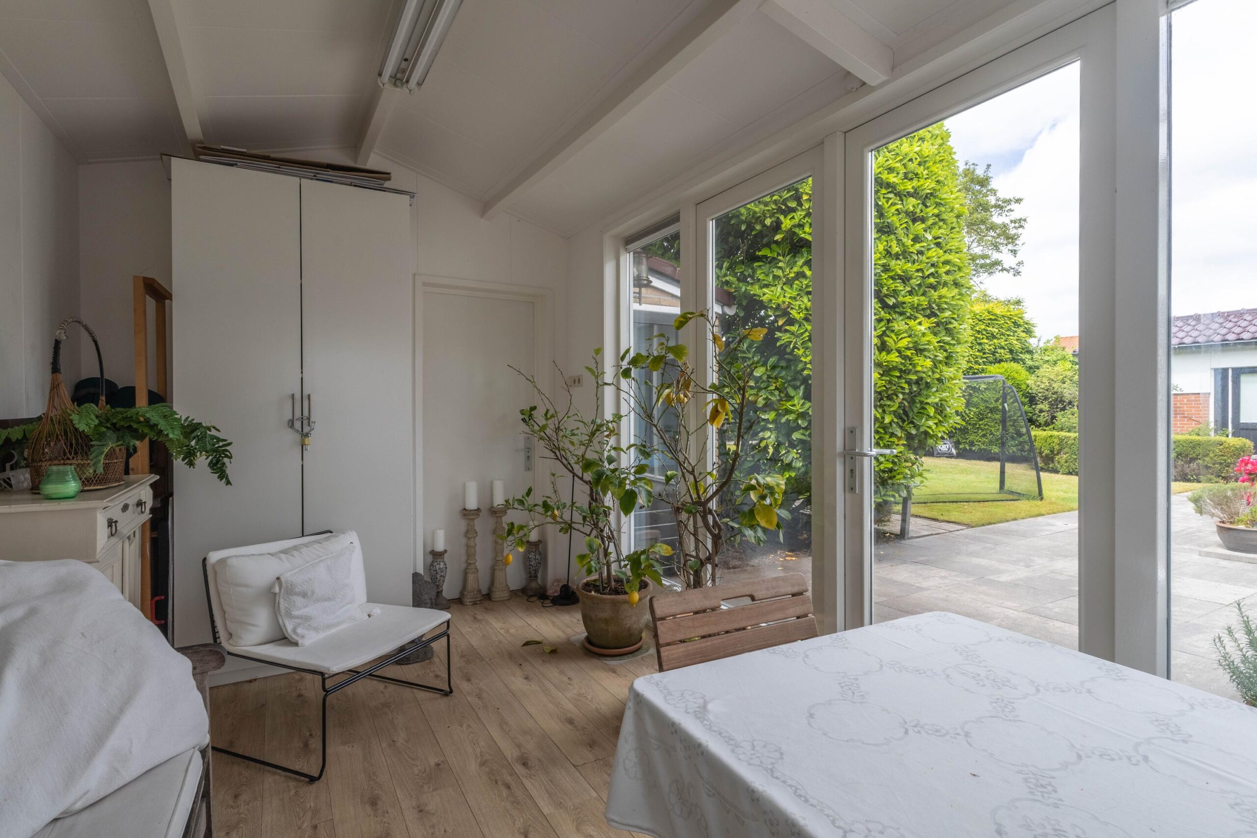 – Geïsoleerd, verwarmd tuinhuis met verwarming en elektra: ideaal als hobbyruimte, werkruimte of extra opslag.