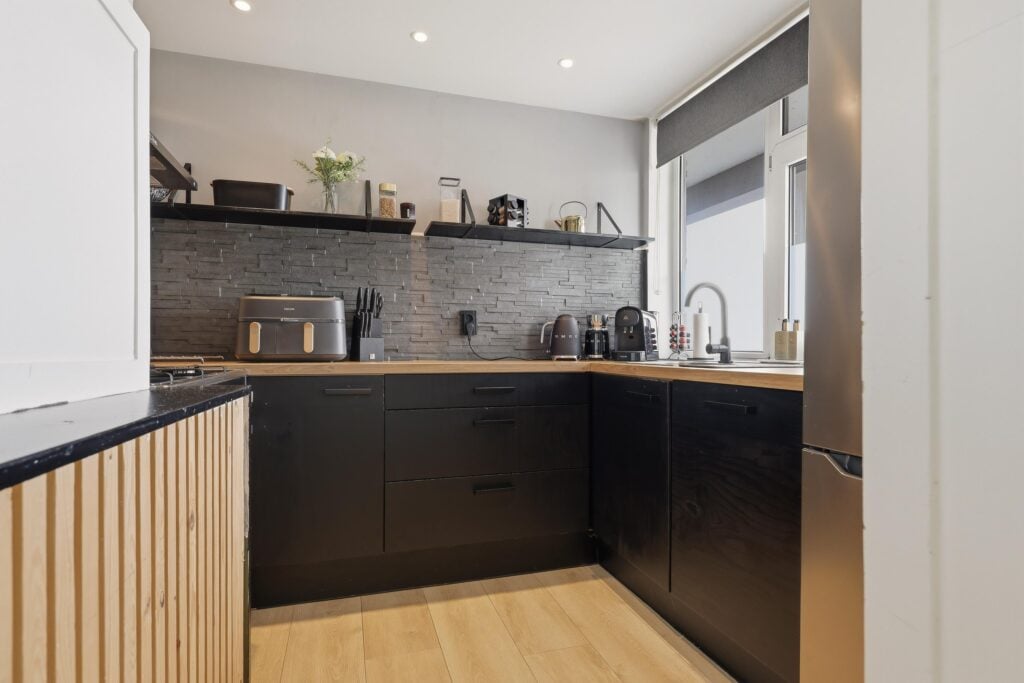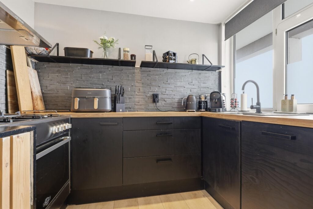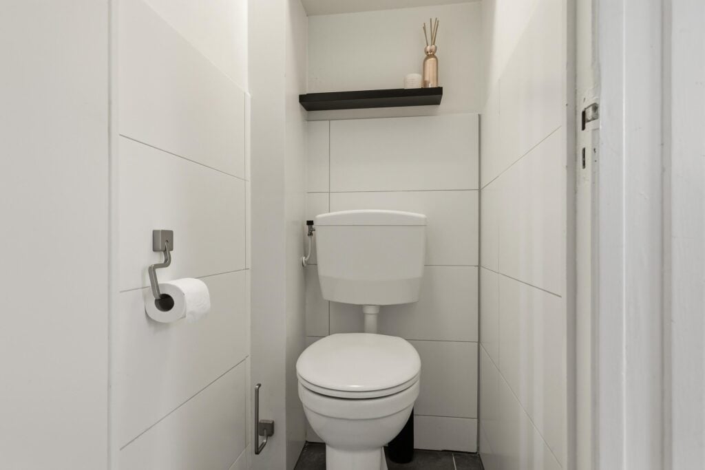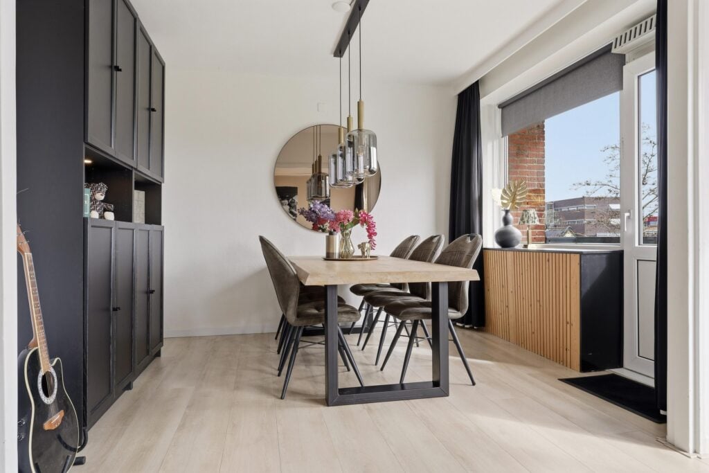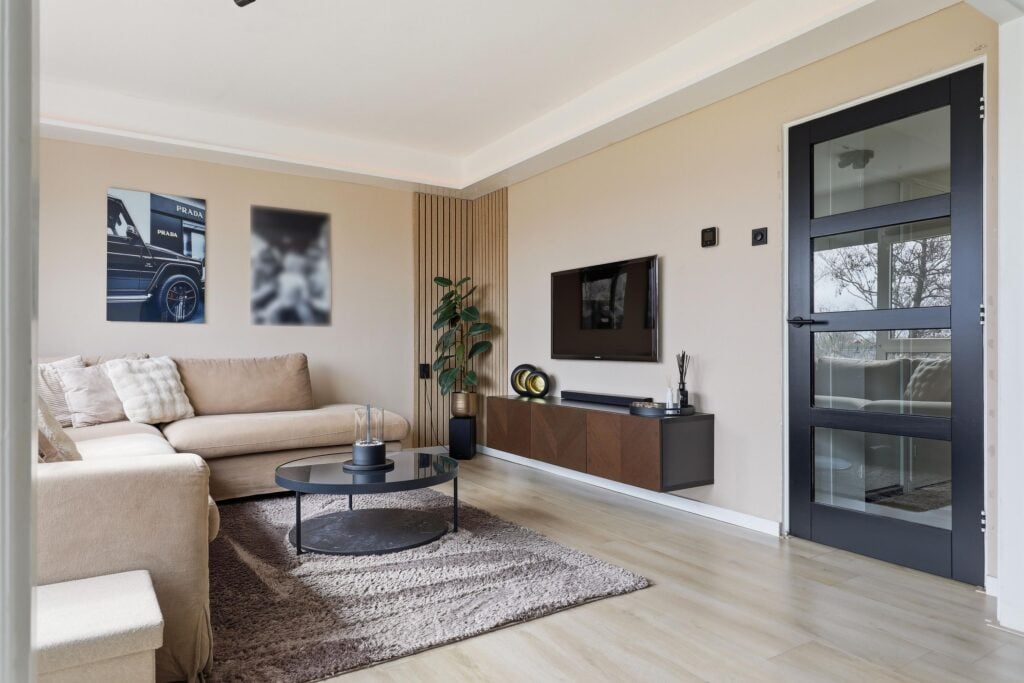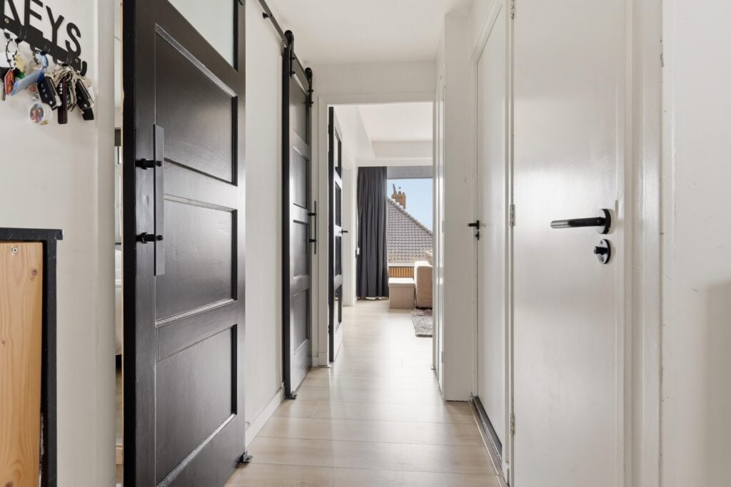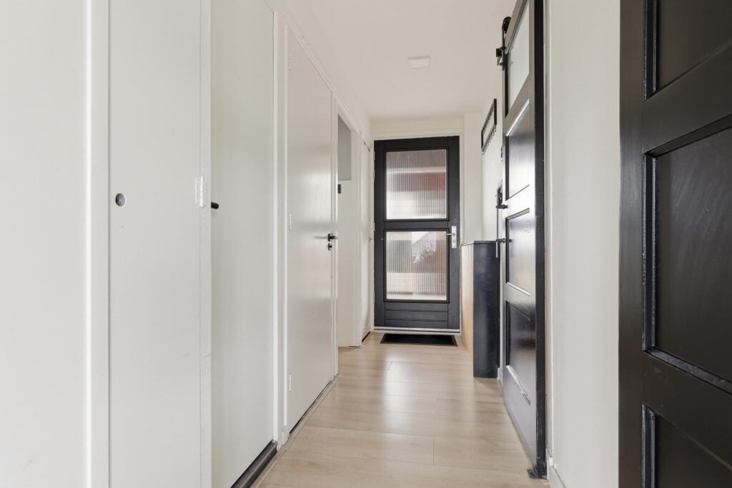 De woning is keurig afgewerkt met een nette vloer en strakke wand- en plafondafwerking. De zwarte binnendeuren geven het geheel een moderne en stijlvolle uitstraling, wat zorgt voor een strak en samenhangend geheel. Je merkt aan alles dat de huidige bewoners hier met veel zorg en aandacht hebben gewoond en de woning altijd netjes hebben onderhouden.