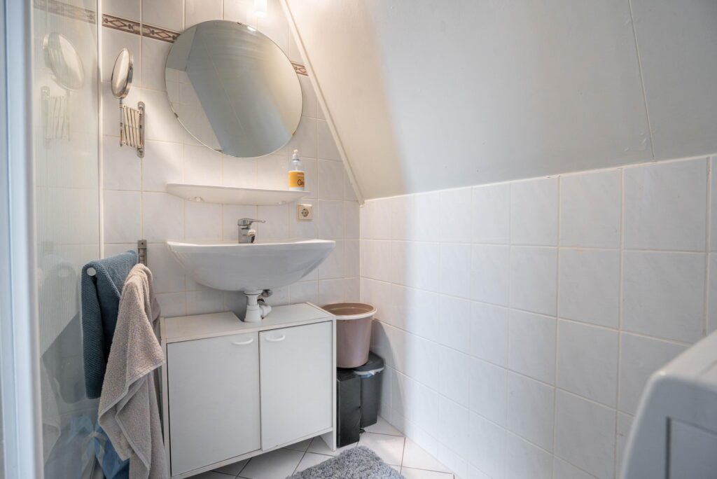 Op de bovenste verdieping bevinden zich twee goede slaapkamers, stuk voor stuk prettig van formaat en multifunctioneel te gebruiken als slaap-, werk- of hobbykamer. De badkamer is netjes uitgevoerd met douche en wastafel.