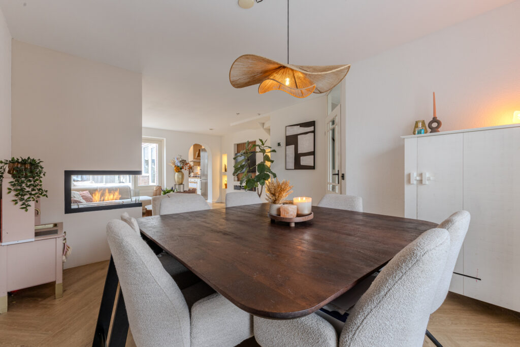 De cinewall met geïntegreerde tv-opstelling vormt een stijlvolle blikvanger in de zithoek, terwijl de sfeervolle bio-ethanol haard tussen de bank en de eethoek zorgt voor een warme, gezellige verbinding tussen beide ruimtes. De zithoek biedt ruimte voor een royale bank, en aan de voorzijde is er volop ruimte voor een grote eettafel waar je heerlijk lang kunt tafelen met familie en vrienden. Dankzij de open indeling voelt de begane grond licht, ruim en uitnodigend aan.