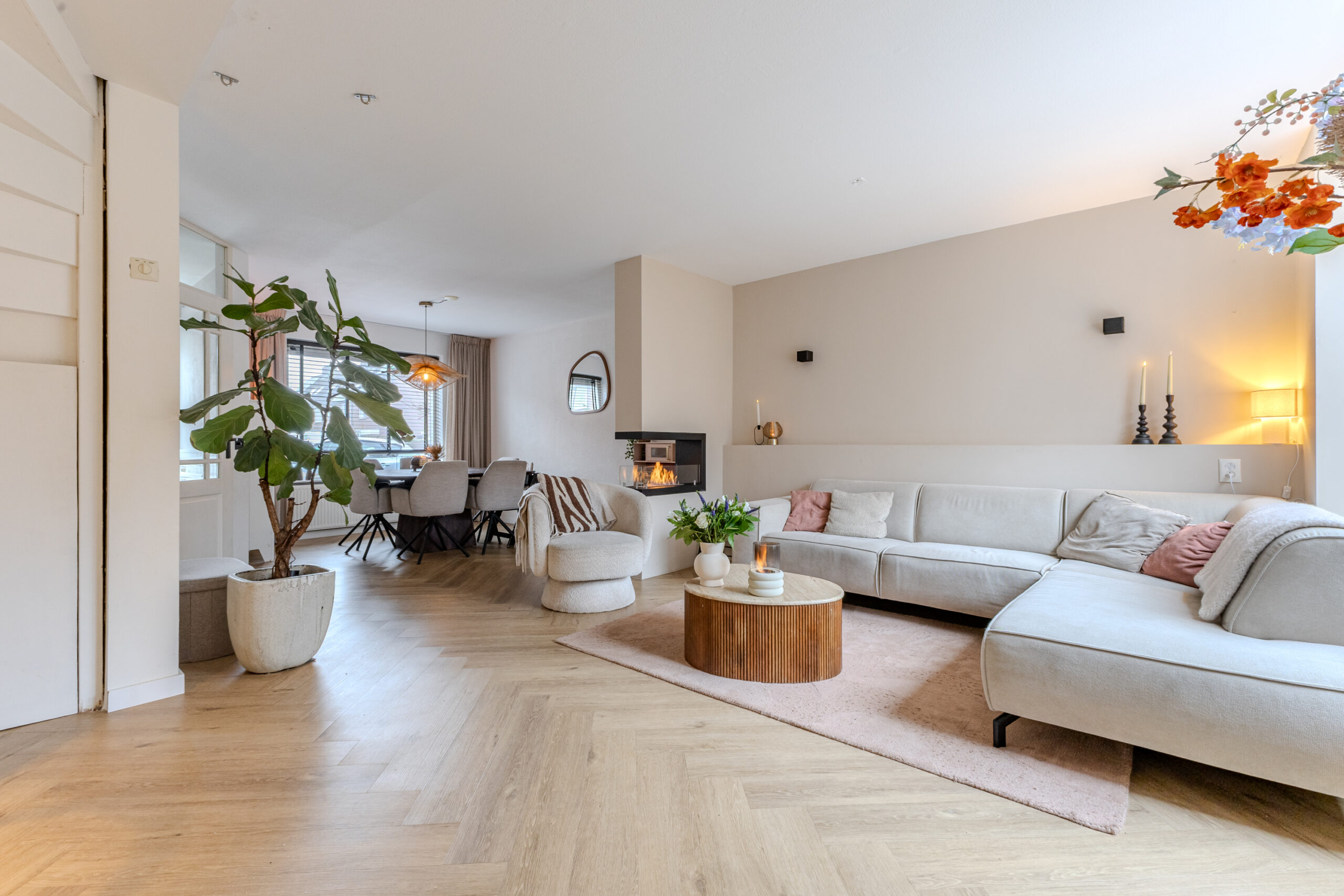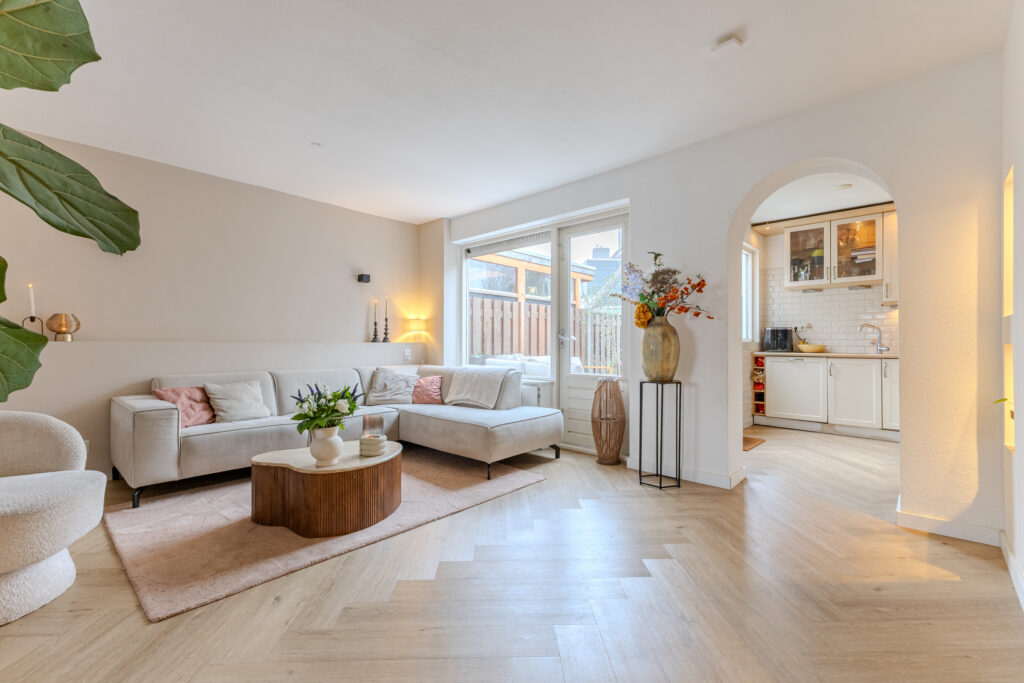 In de hal vind je de garderobe, toegang tot het toilet en de doorgang naar de woonkamer. Zodra je binnenstapt, proef je de sfeer van de recent gemoderniseerde woonkamer. De luxe visgraat PVC-vloer en strak gestuukte wanden en plafonds vormen een rustige, moderne basis.