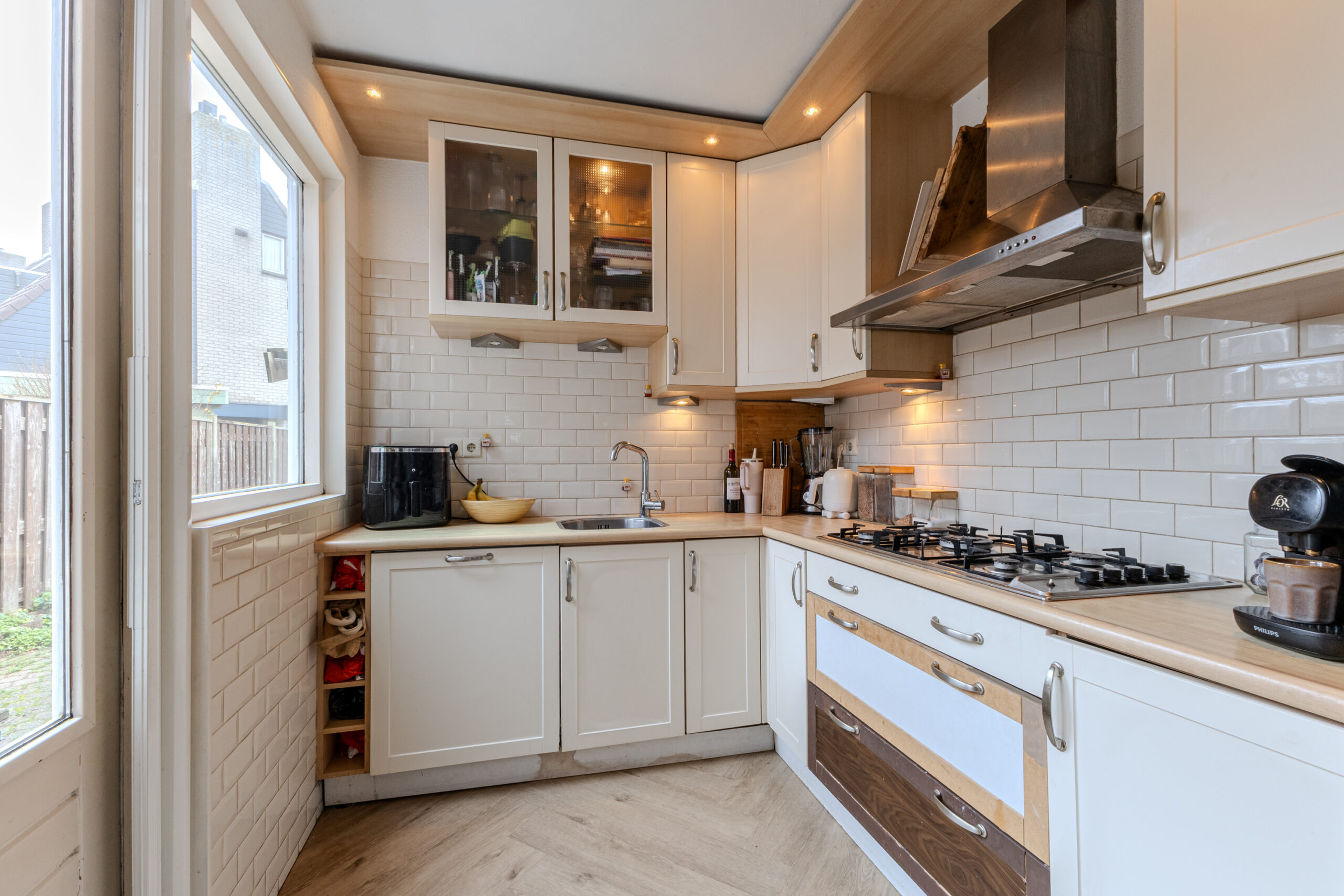 Aan de tuinzijde ligt de open keuken. Vanuit hier loop je op zomerse dagen zó de achtertuin in, ideaal wanneer binnen en buiten in elkaar overlopen.