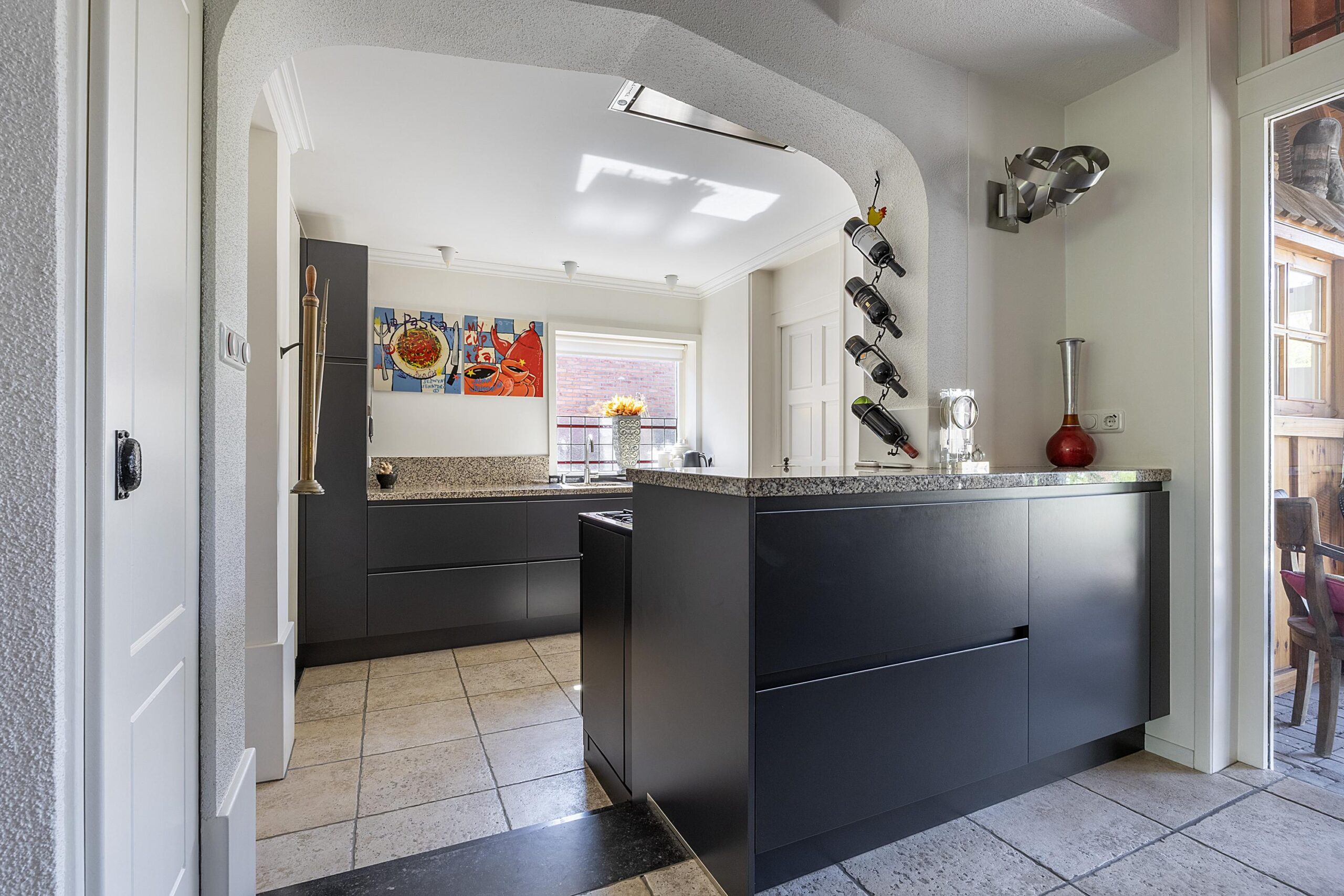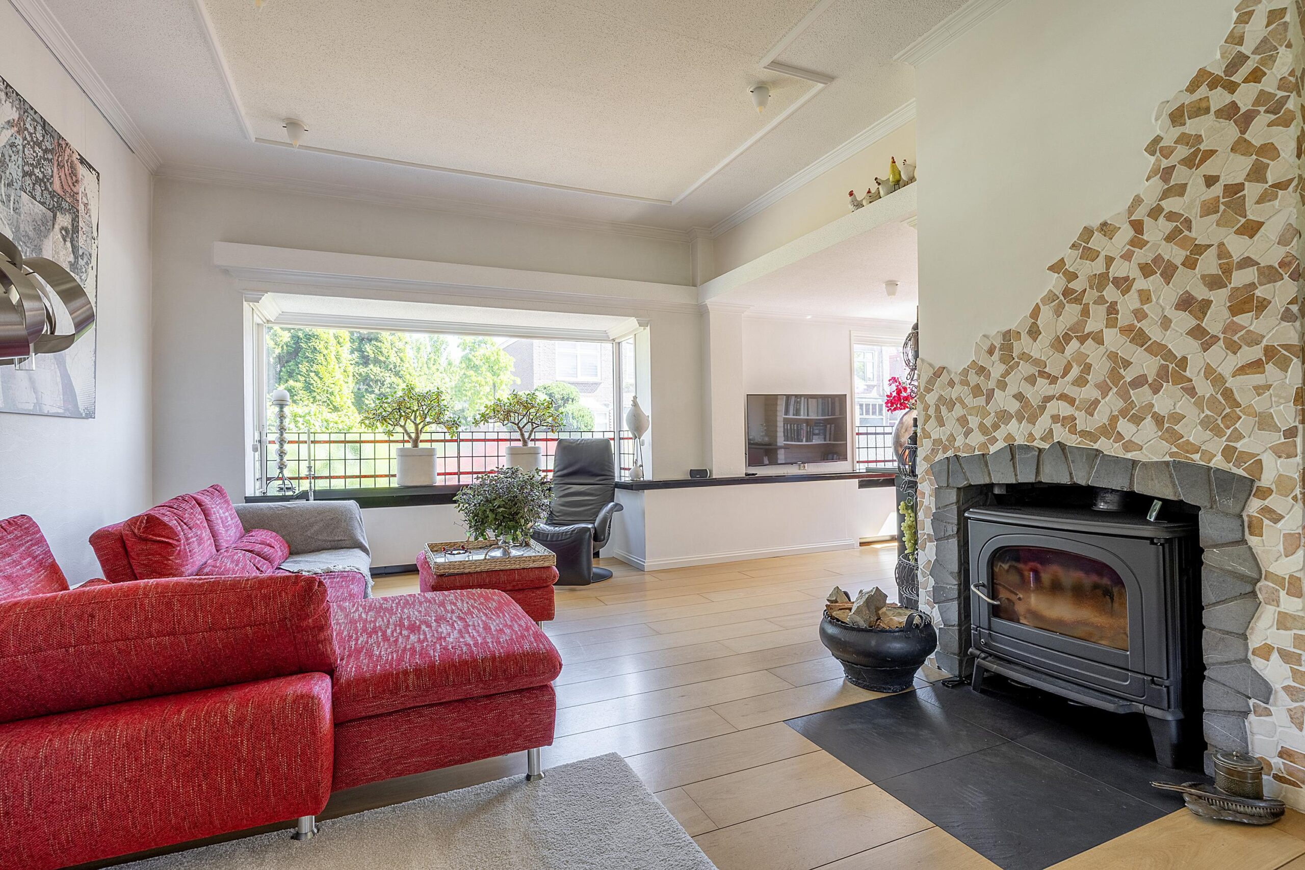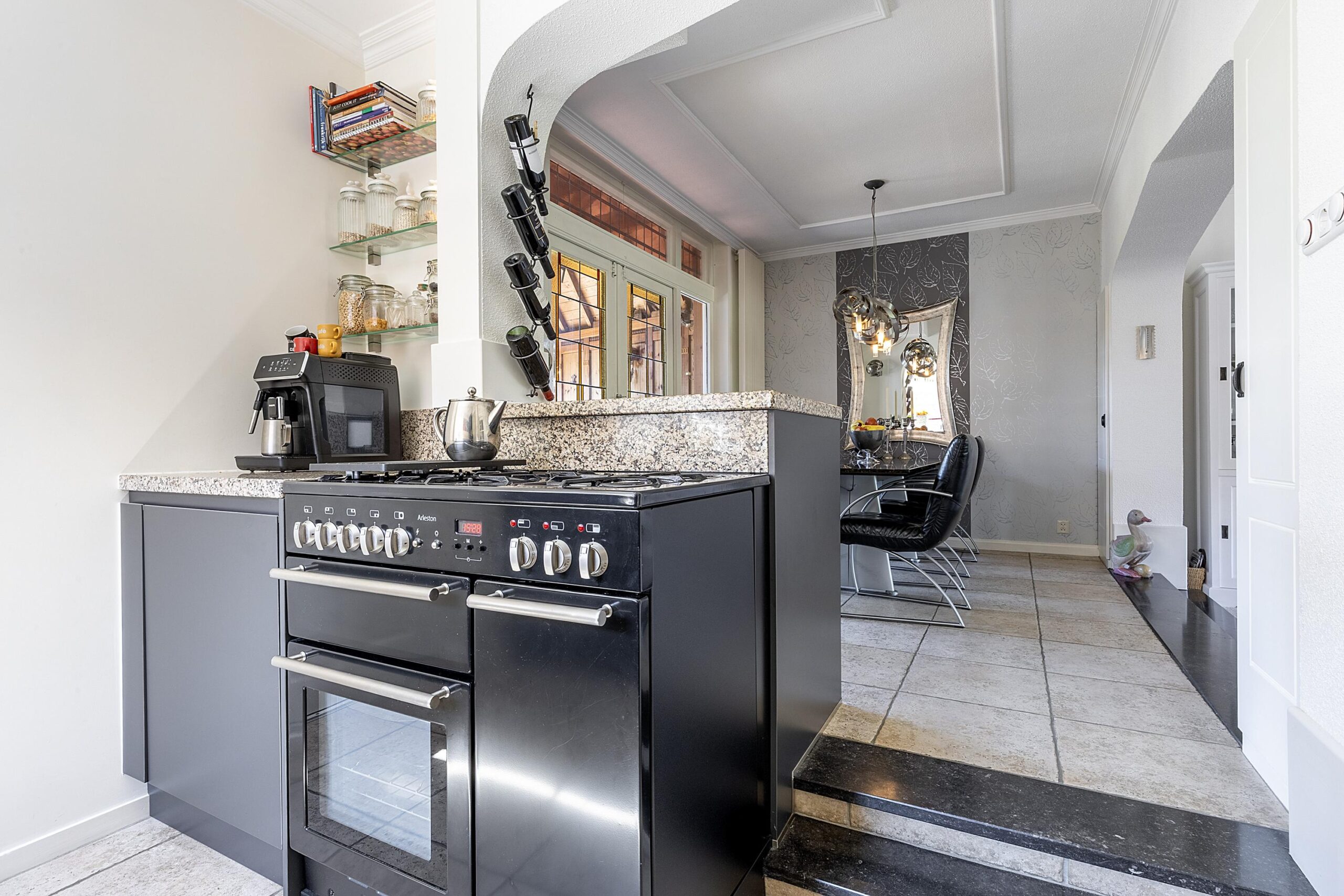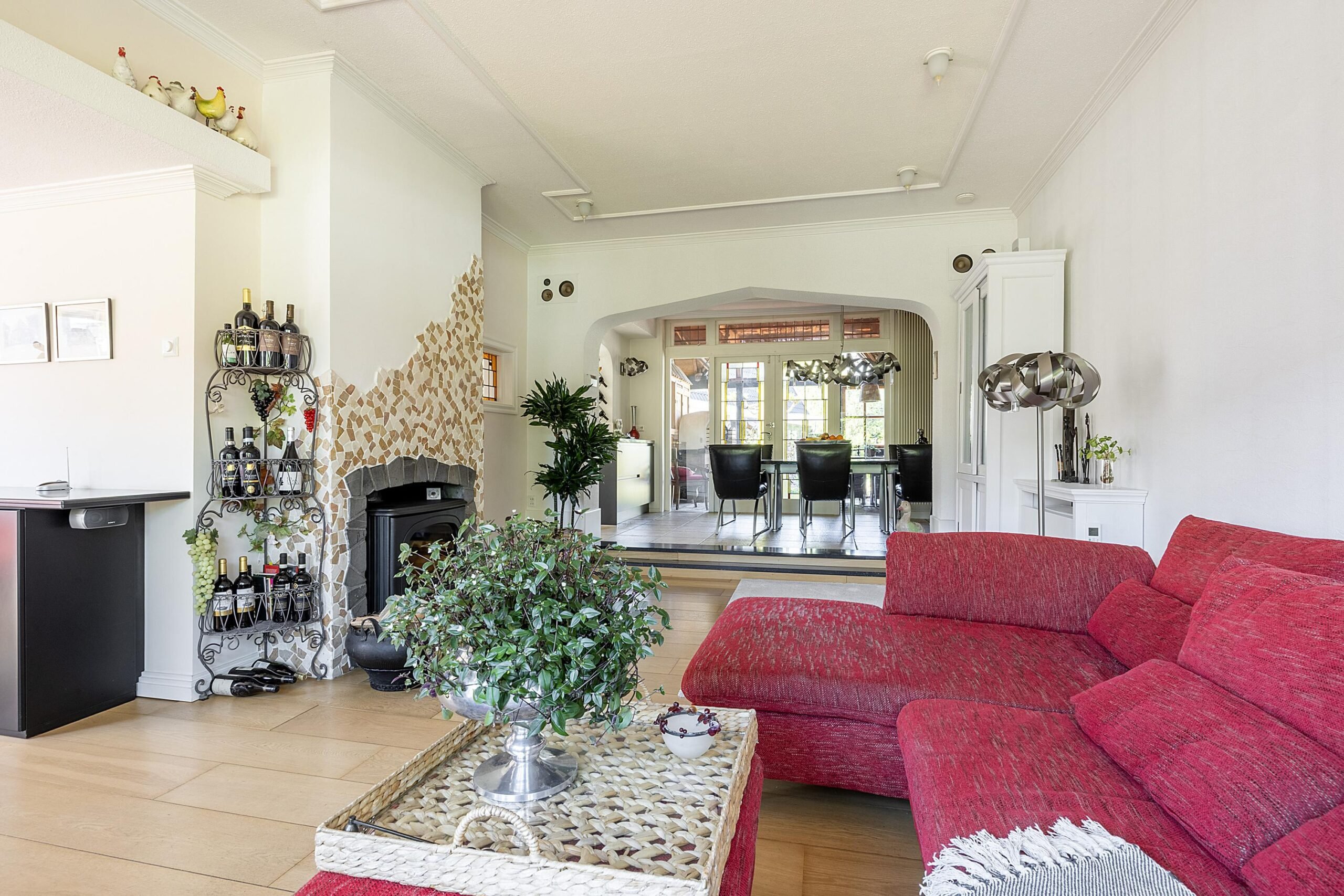 Via de hal stap je direct in de open keuken (2018) met prachtig gasfornuis van Arleston, afzuigkap, vaatwasser en voldoende opbergruimte. Ook heb je toegang tot de bijkeuken met wasmachine aansluiting. Via de open keuken stap je 2 kleine treden omhoog naar het verhoogde eetgedeelte. Altijd fijn om tijdens het koken in contact te staan met de gasten aan de eettafel. Liever ontspannen met de warmte van de houtkachel? Een niveau lager heb je een heerlijke ruime living met veel lichtinval door de grote raampartijen.
