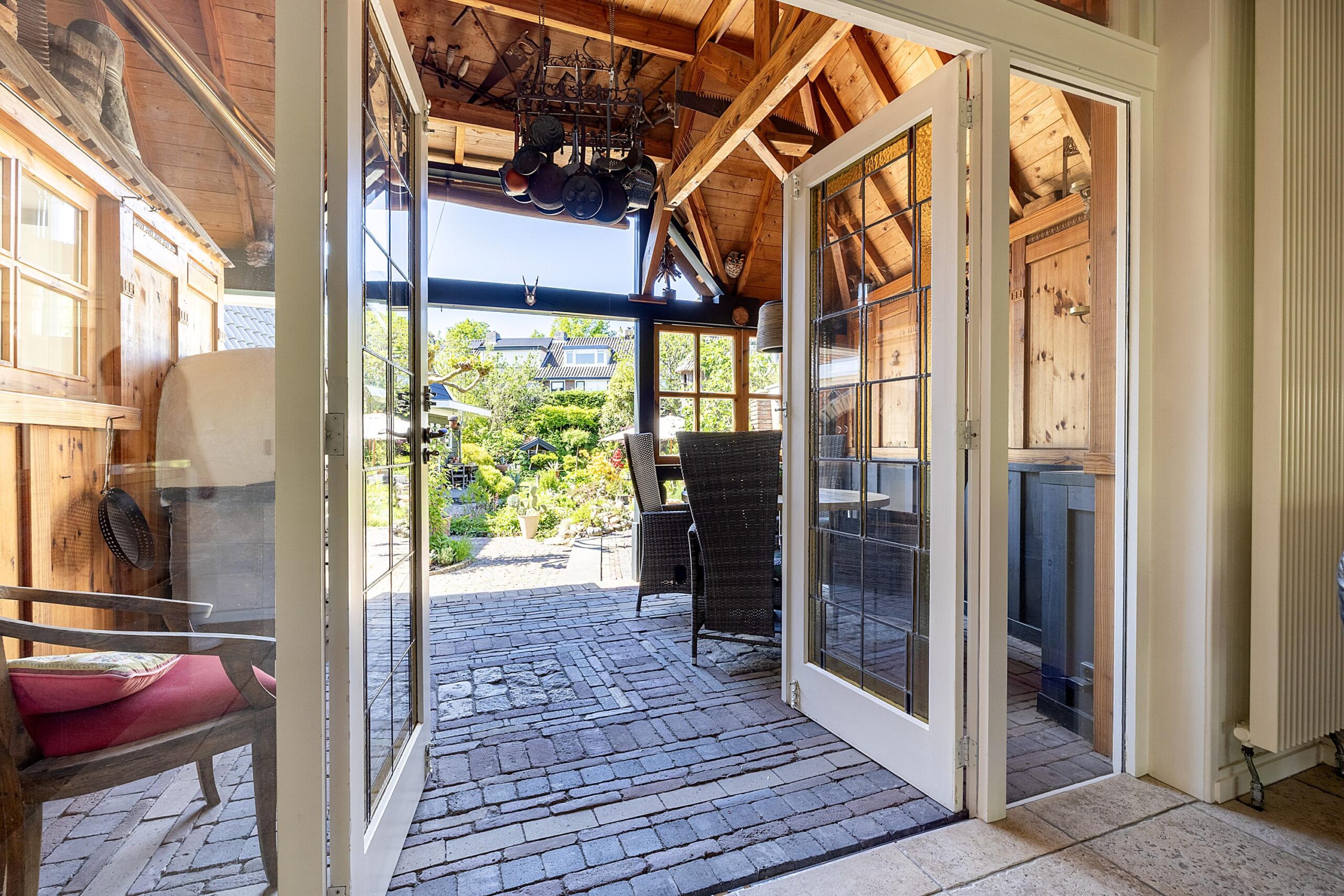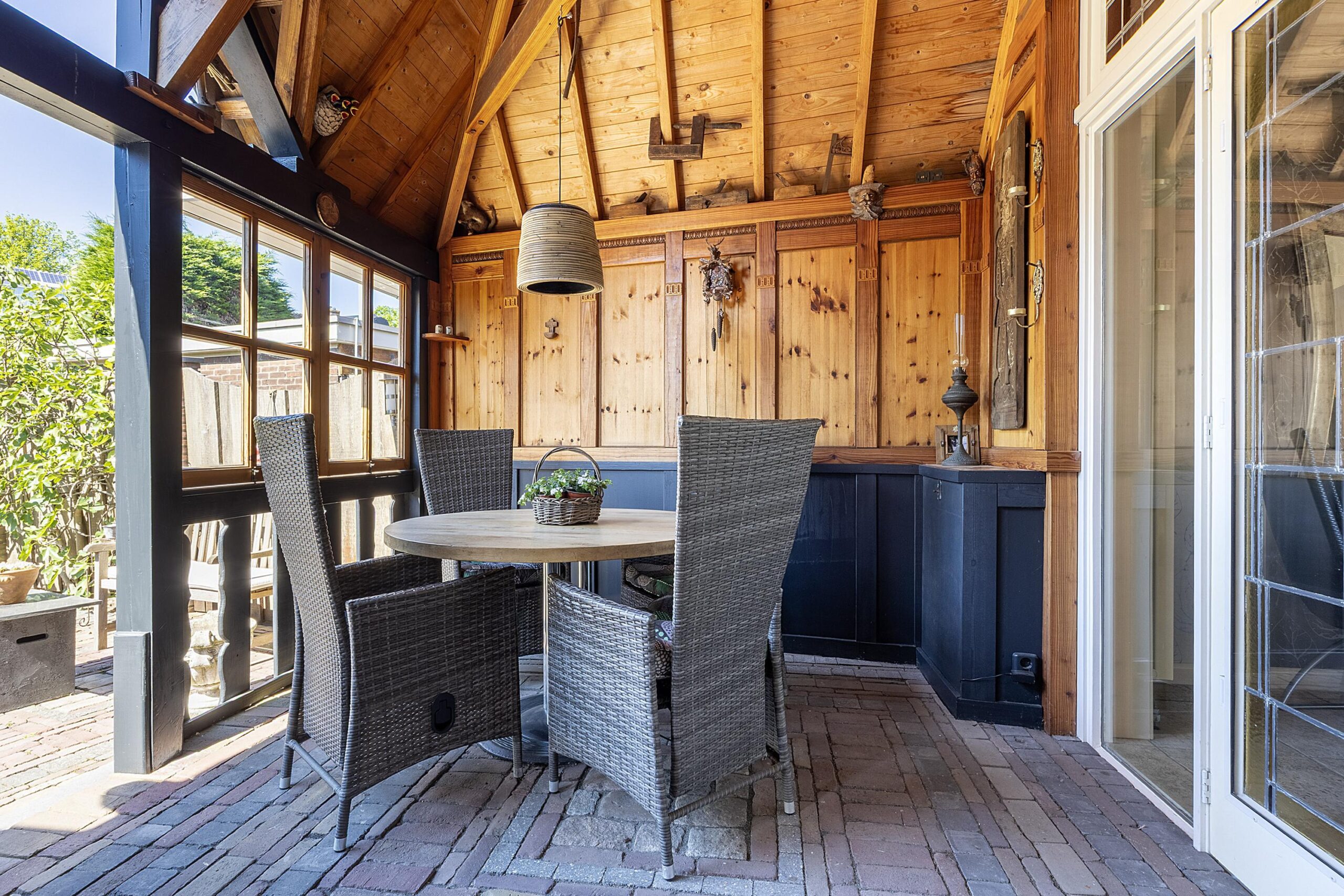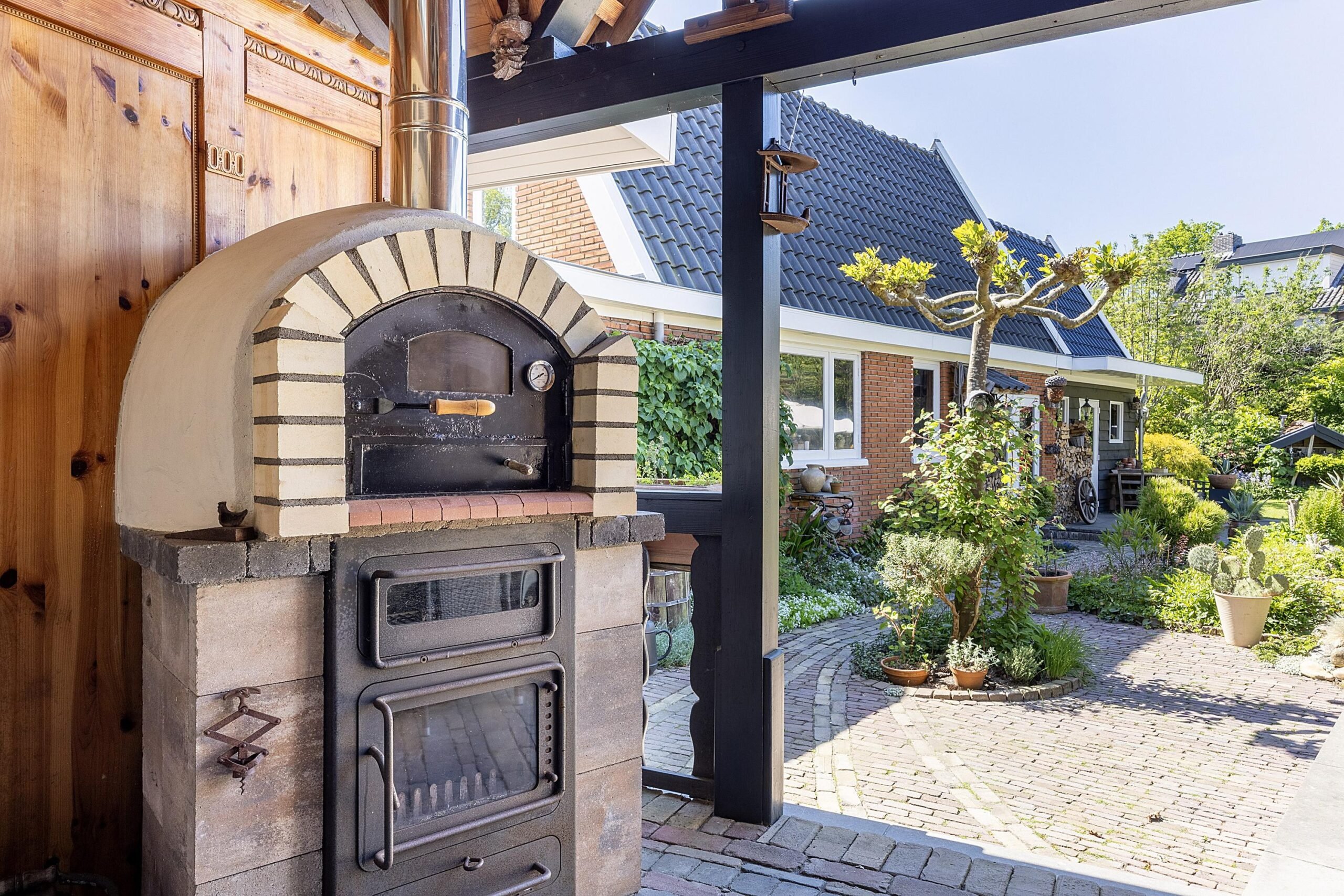 Via de openslaande deuren sta je direct onder de zelf gemaakte houten overkapping mét vaste pizza oven/BBQ. Huidig eigenaar heeft de houten overkapping zelf nagemaakt naar hun geliefde skihut waar zij graag kwamen. Leuk voor een feestje of om heerlijk in de schaduw te ontspannen en te genieten van de rustige privacy volle tuin. Want wat een prachtuitzicht heb je vanaf dit punt. De keurig verzorgde achtertuin van maar liefst 17 meter diep is een plaatje om te zien. Wat heeft deze tuin niet? Beschutting door middel van de groene wand aan bomen en struiken, een stuk gras om de kinderen te laten spelen of een potje te voetballen en een heerlijk terras voor de ouders om te genieten van een een heerlijke pizza uit de pizza oven.