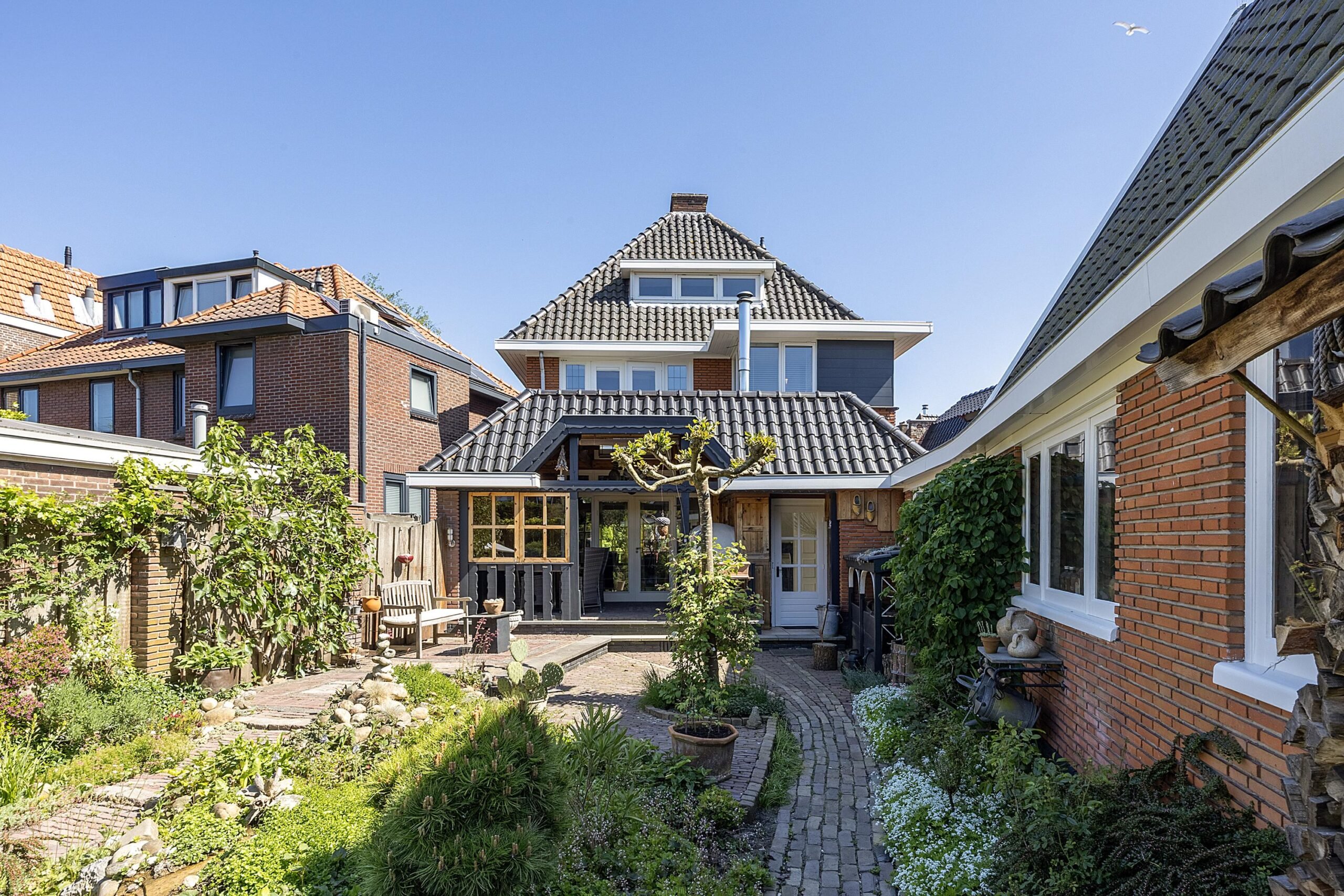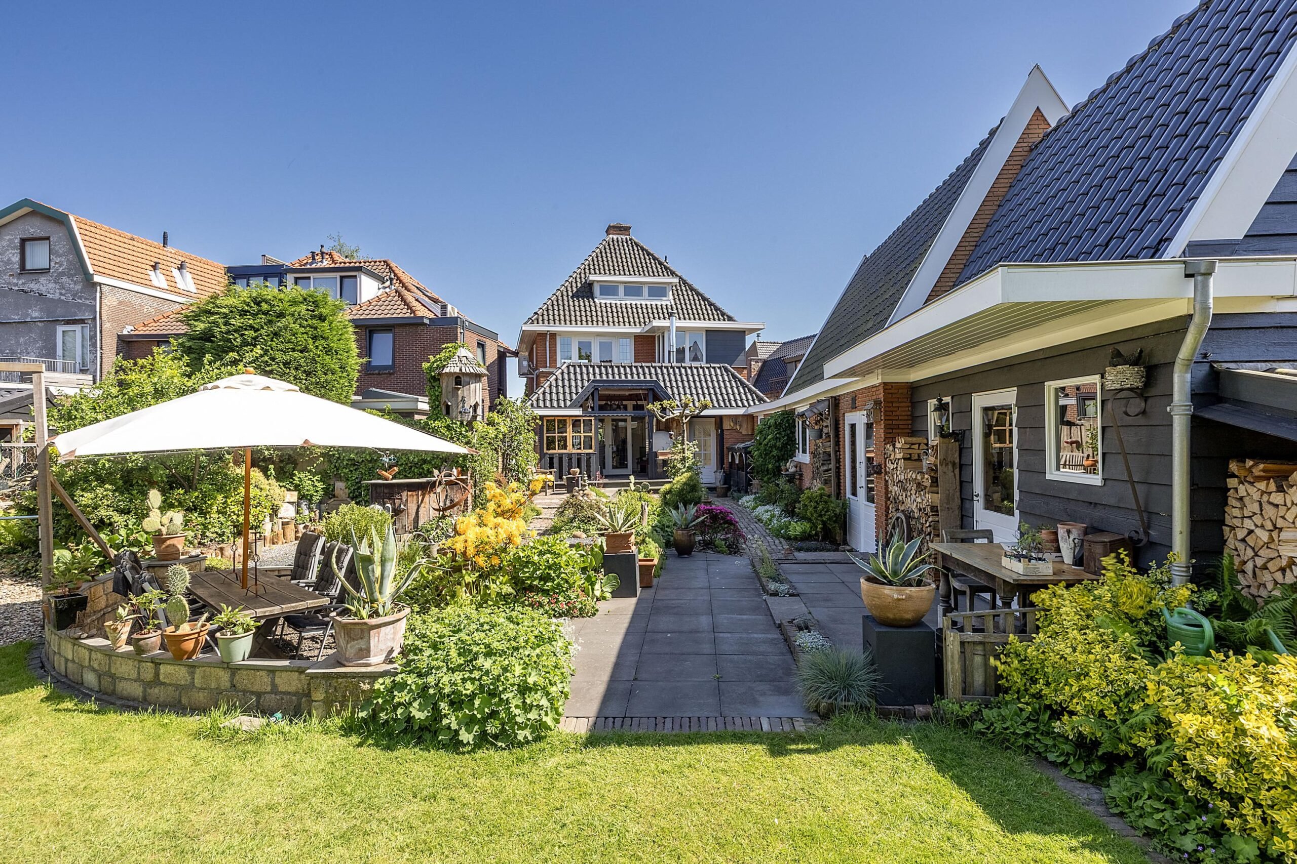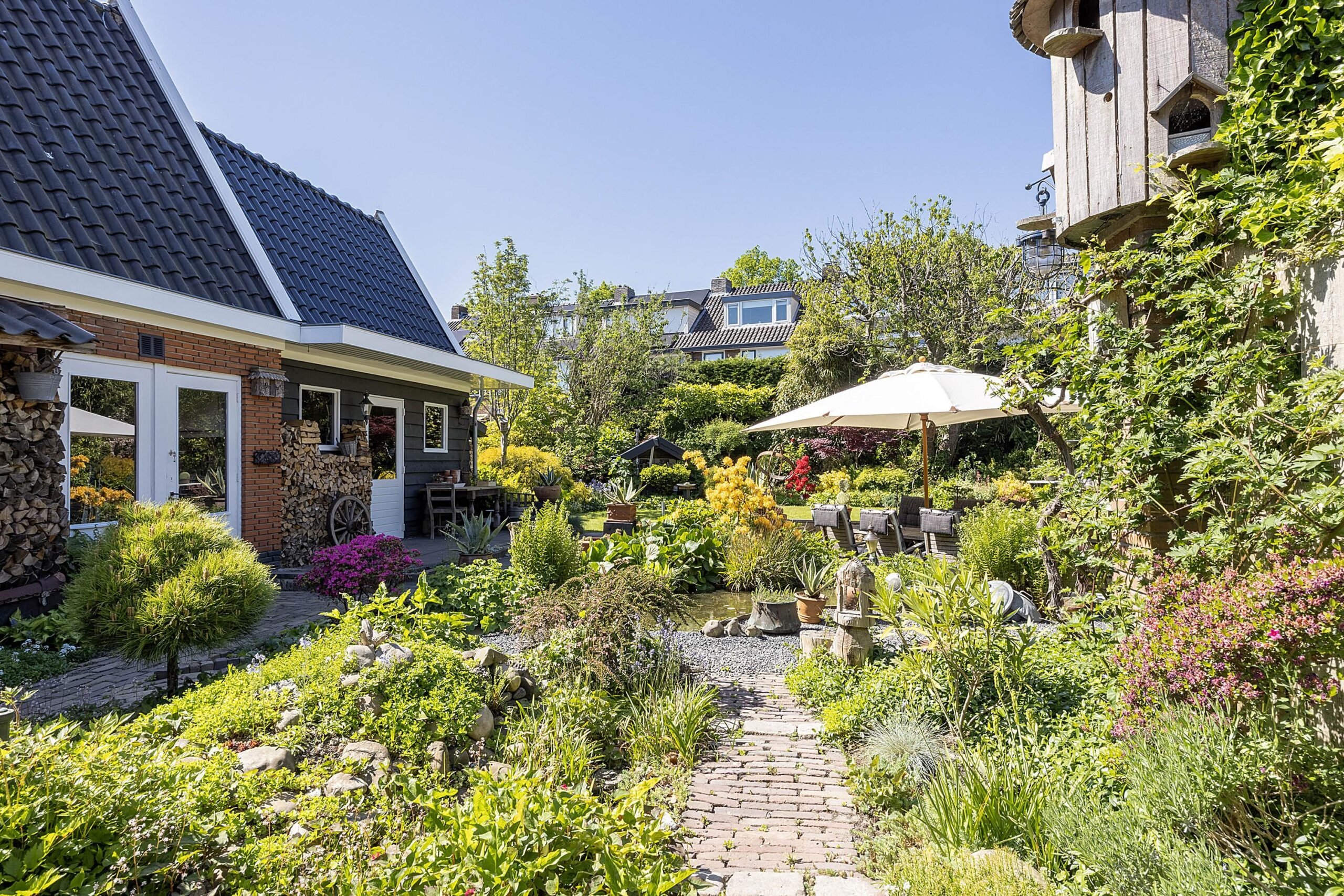 De woning, met een woonoppervlakte van maar liefst 140 m2, is altijd keurig net onderhouden en het afwerkingsniveau is hoog; kan ook niet anders met een eigen aannemersbedrijf! En dan de tuin… wauw! De foto’s spreken voor zich maar wat een kleurrijk plaatje is dit.