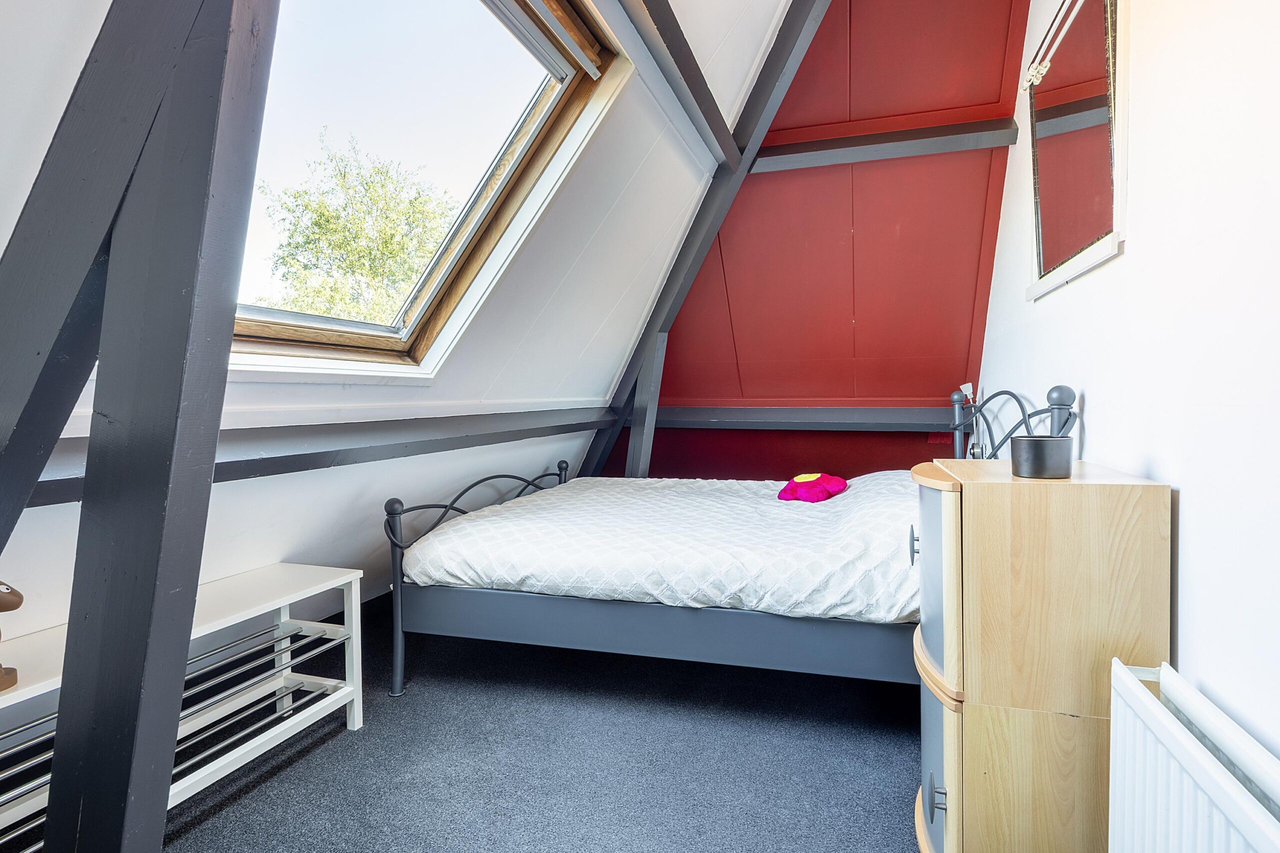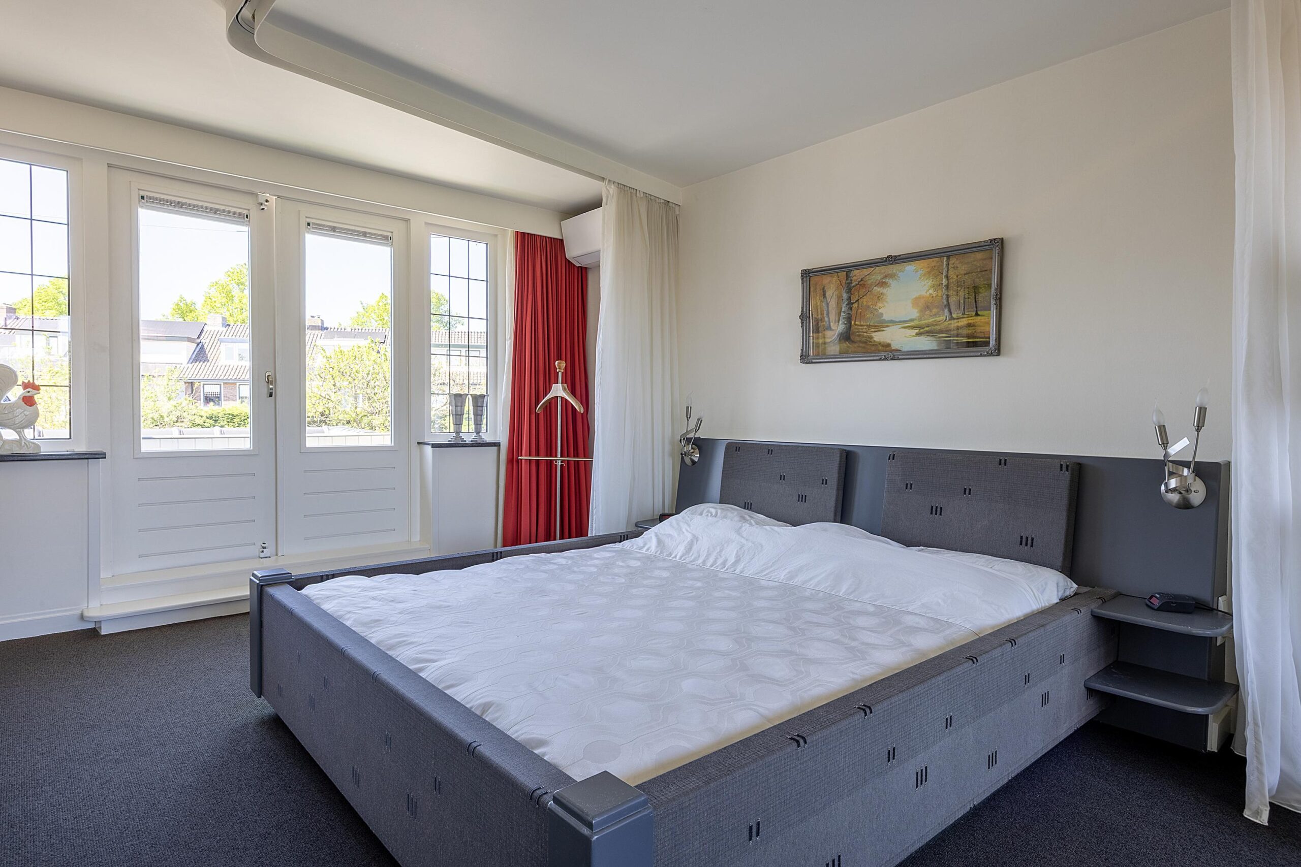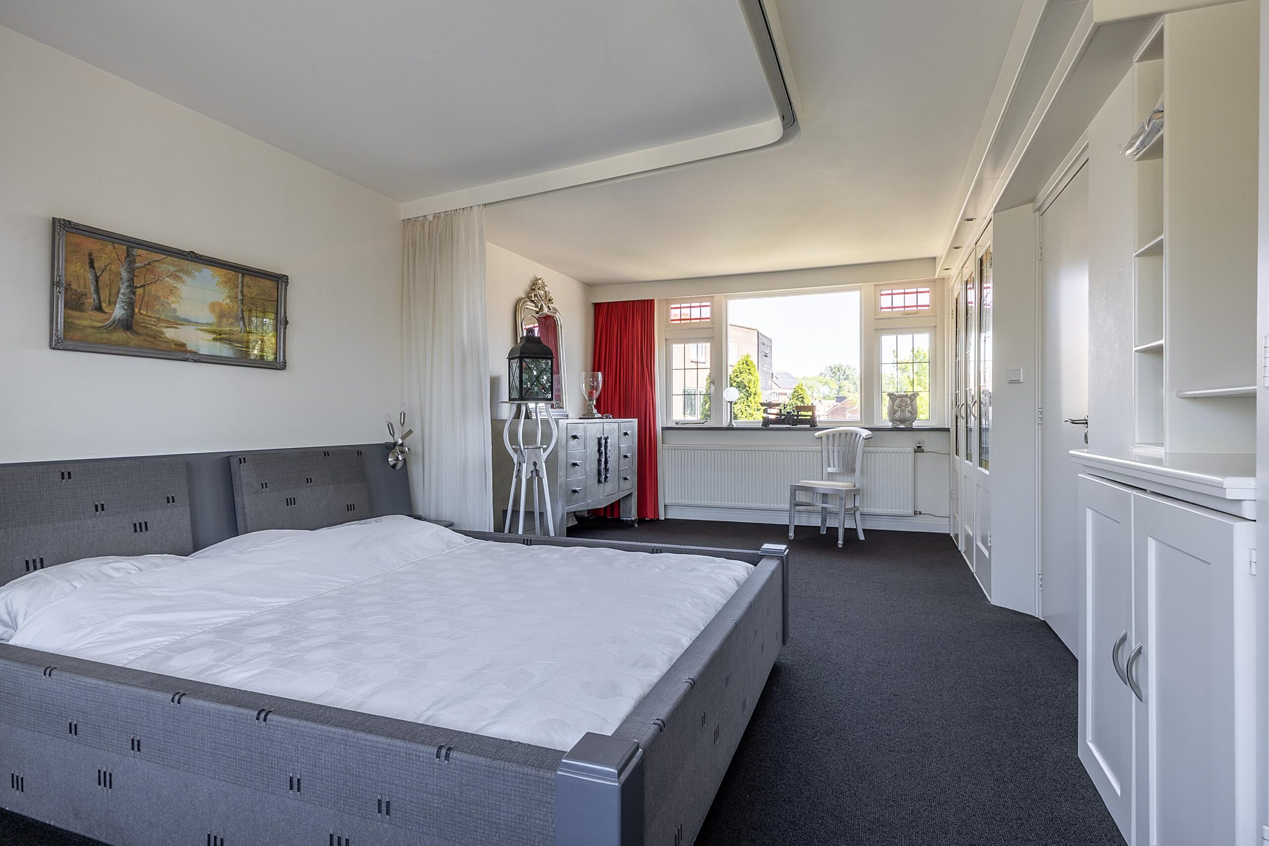 Via de prachtige trap lopen we naar de eerste verdieping met toegang tot een keurig kantoor en de hoofdslaapkamer. Deze kamer bestond oorspronkelijk uit 2 slaapkamers; deze zijn samengevoegd tot 1 grote ruimte. De slaapkamer is voorzien van airco en geeft door middel van de openslaande deur toegang tot het balkon. Ook heeft deze slaapkamer een badkamer ensuite (2022) voorzien van een toilet, wastafelmeubel en grote inloopdouche met sunshower. Op de tweede verdieping tref je op de overloop een wastafel en nog 2 slaapkamers met een praktische CV ruimte waar ook voldoende bergruimte aanwezig is.