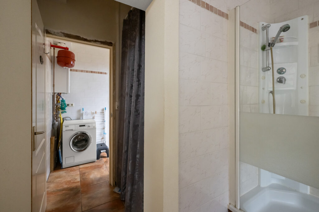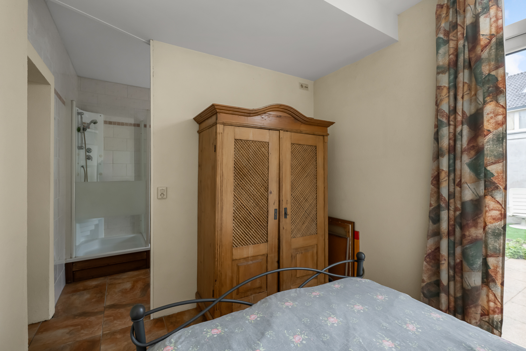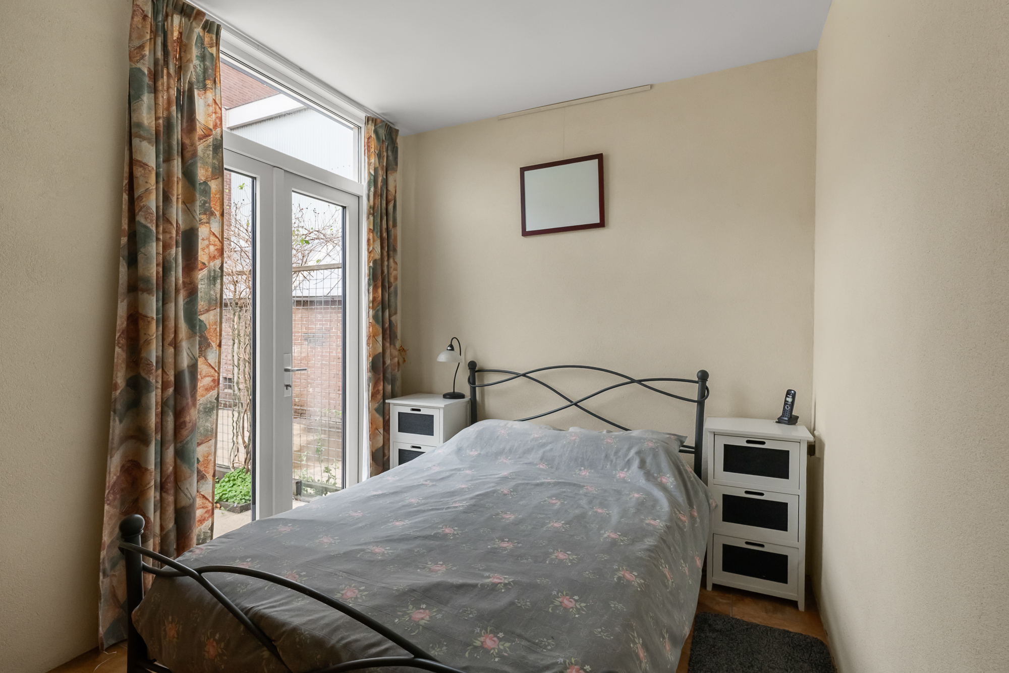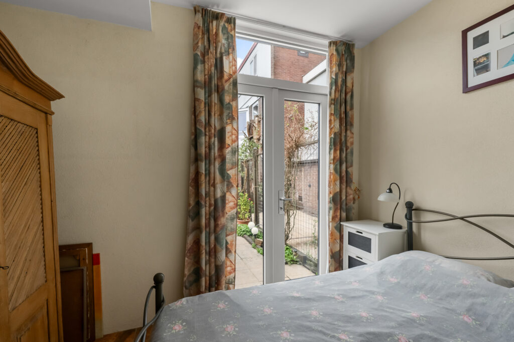 Aan de achterzijde van de woning bevindt zich de slaapkamer, een rustige en comfortabele ruimte met direct contact met de tuin. De badkamer is verzorgd uitgevoerd en voorzien van onder andere een douche, wastafel en een bad.
