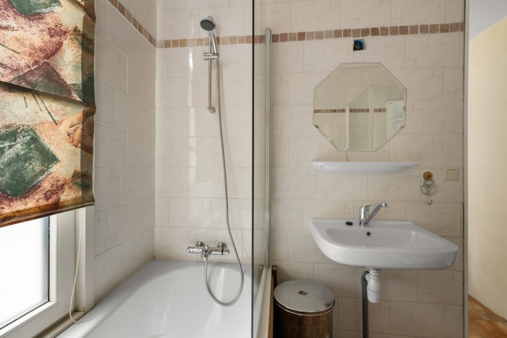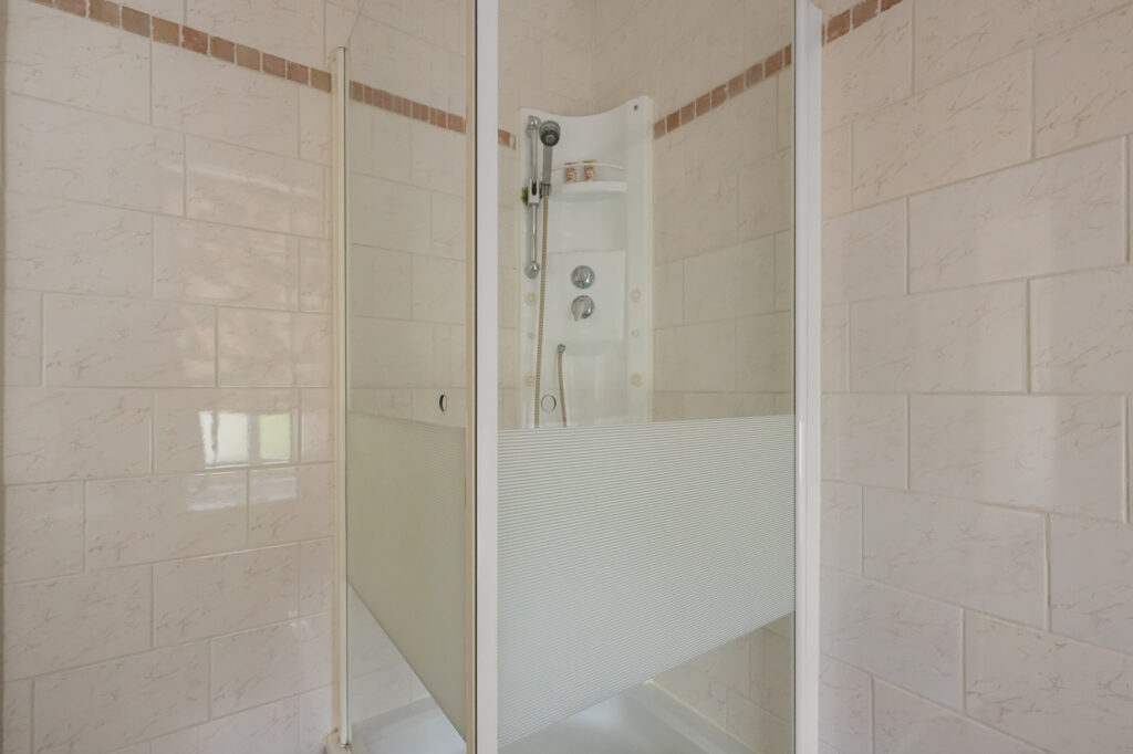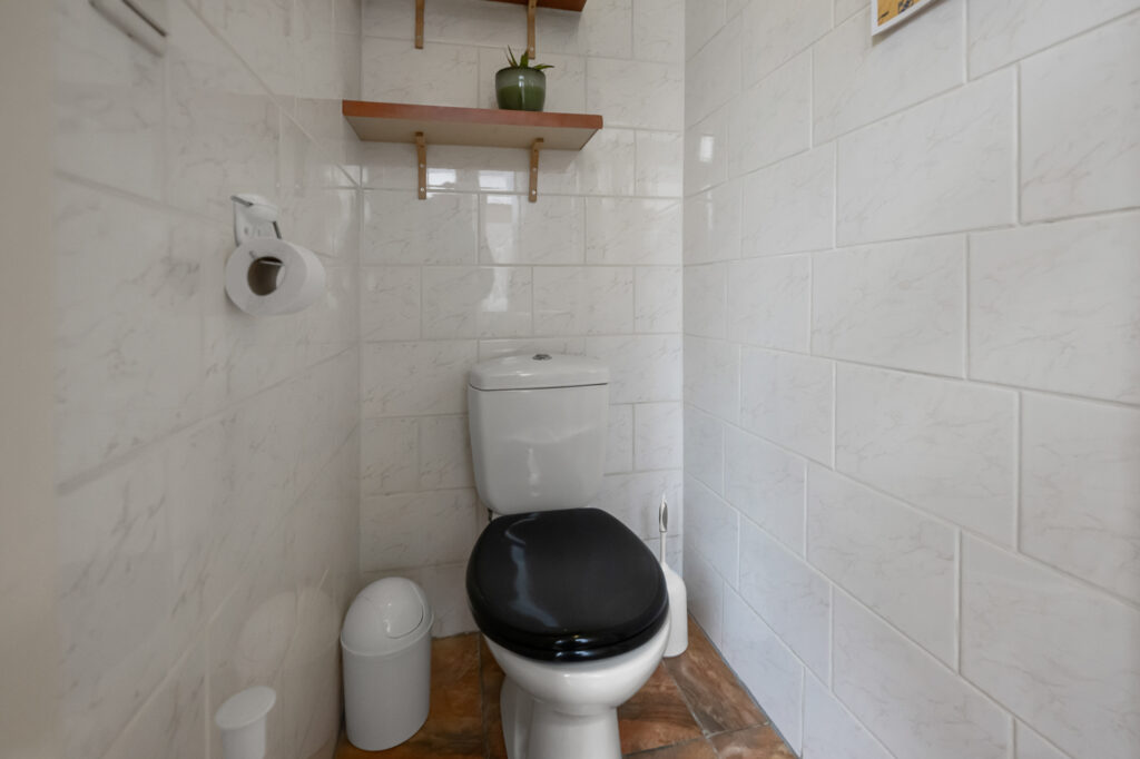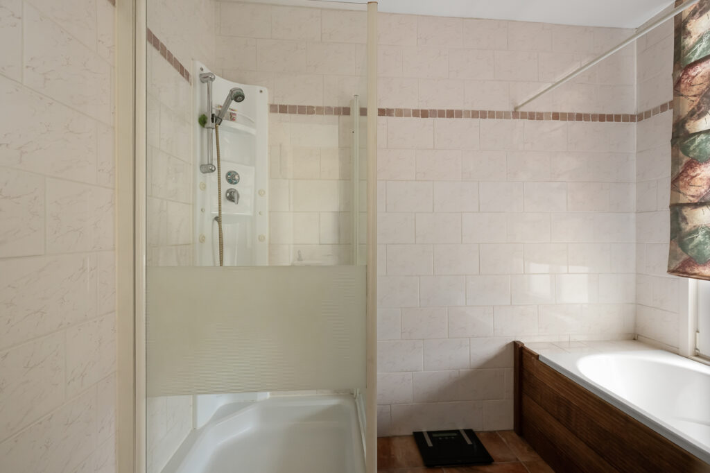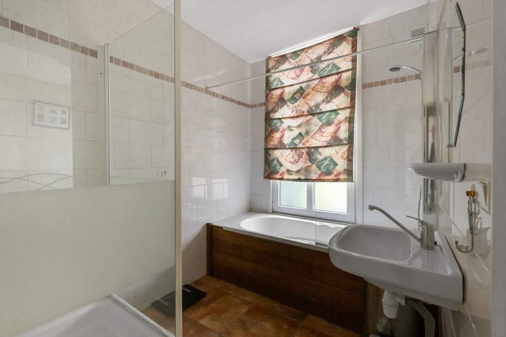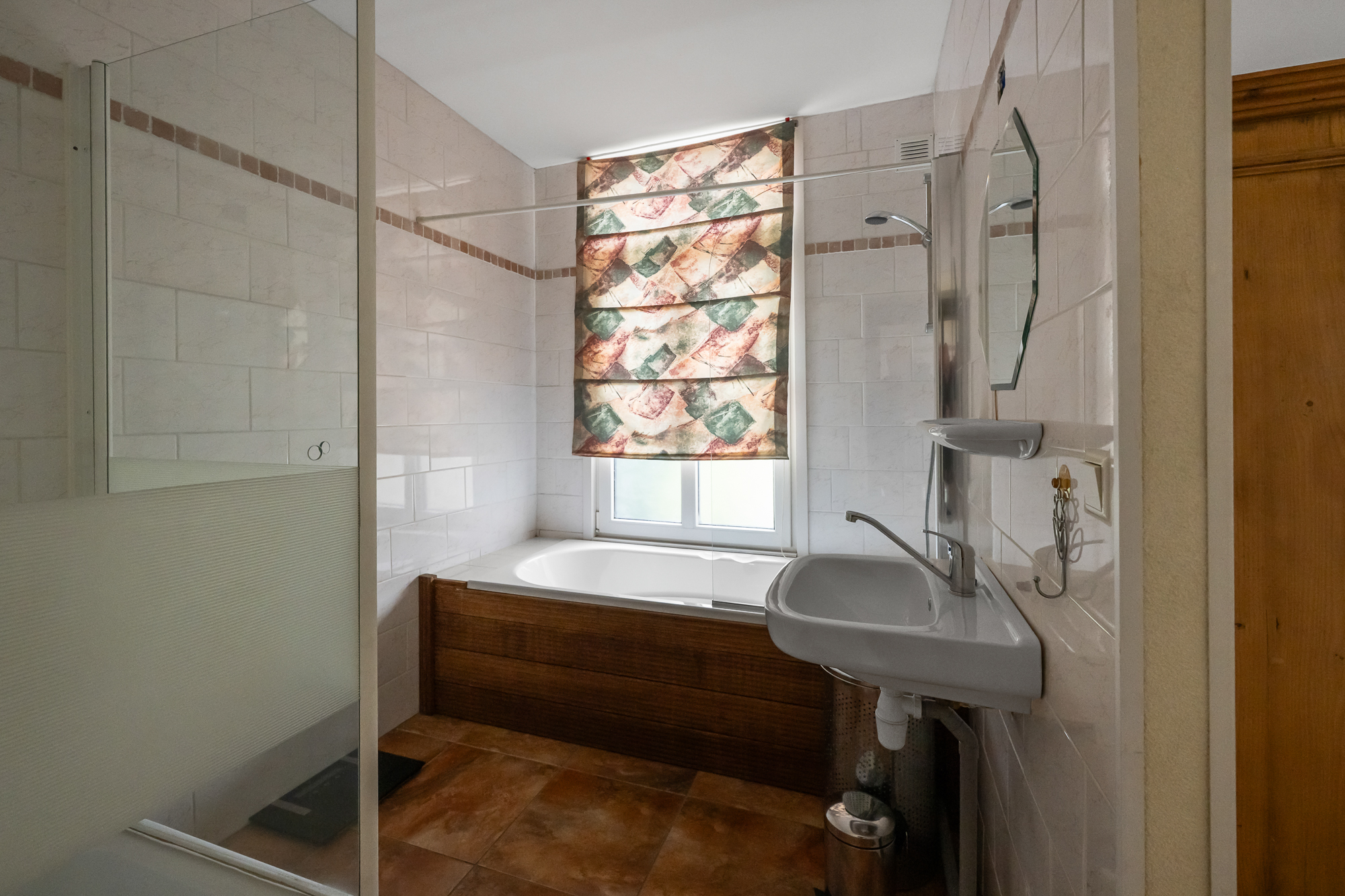 Aan de achterzijde van de woning bevindt zich de slaapkamer, een rustige en comfortabele ruimte met direct contact met de tuin. De badkamer is verzorgd uitgevoerd en voorzien van onder andere een douche, wastafel en een bad.