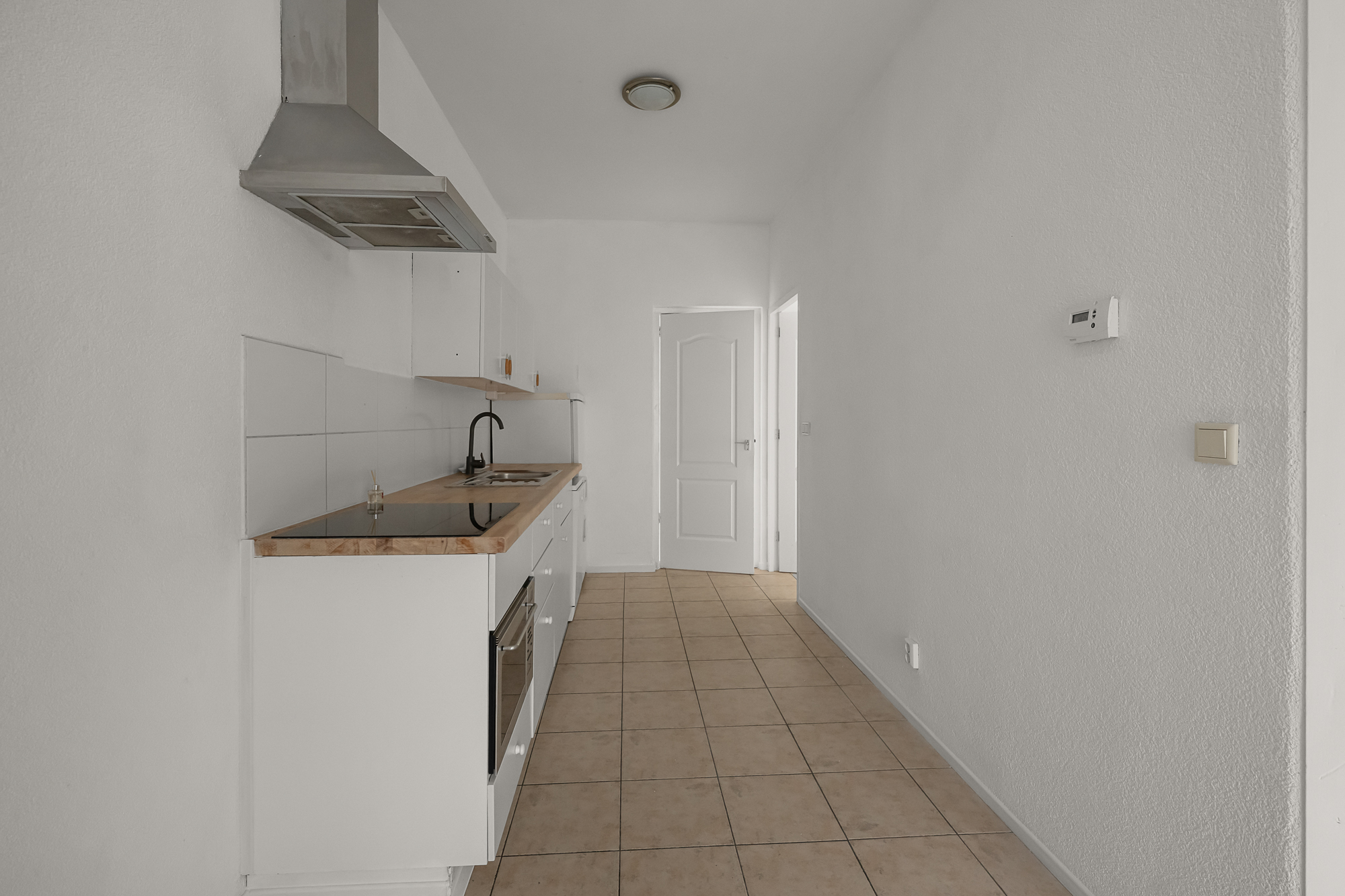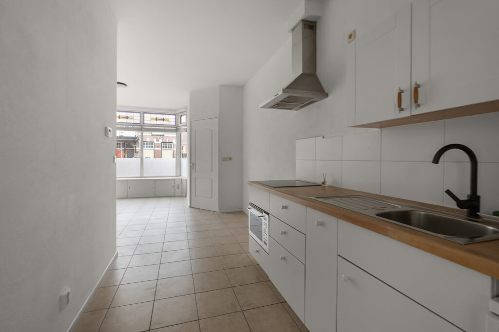 De open keuken sluit direct aan op de woonkamer en is praktisch ingericht met diverse inbouwapparatuur. Vanuit de tussenhal is er directe toegang tot de achtertuin, waardoor binnen en buiten op een natuurlijke manier met elkaar verbonden zijn.