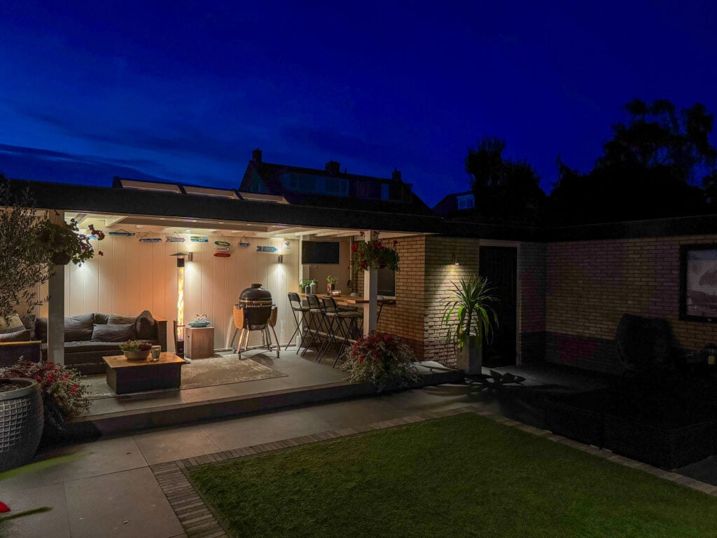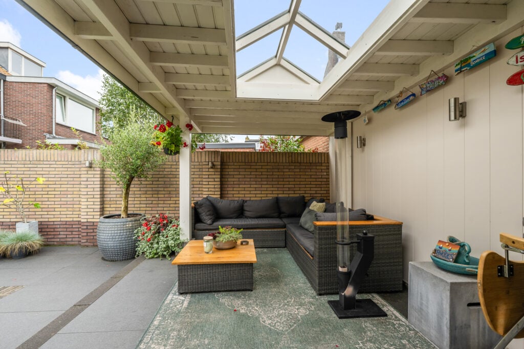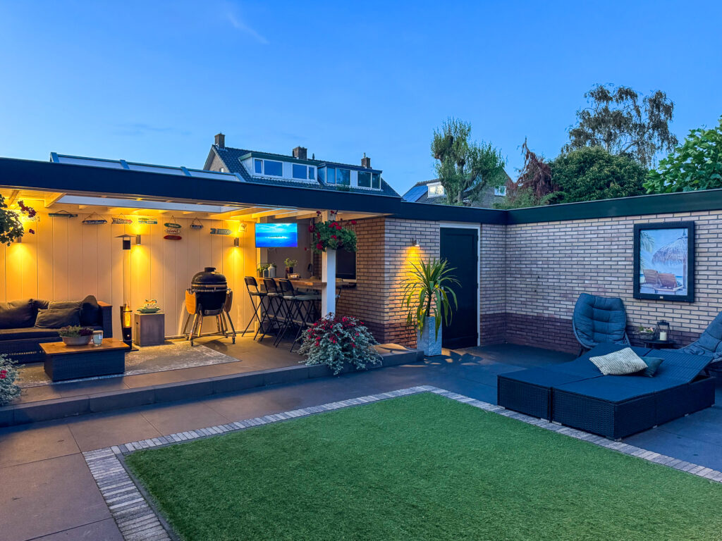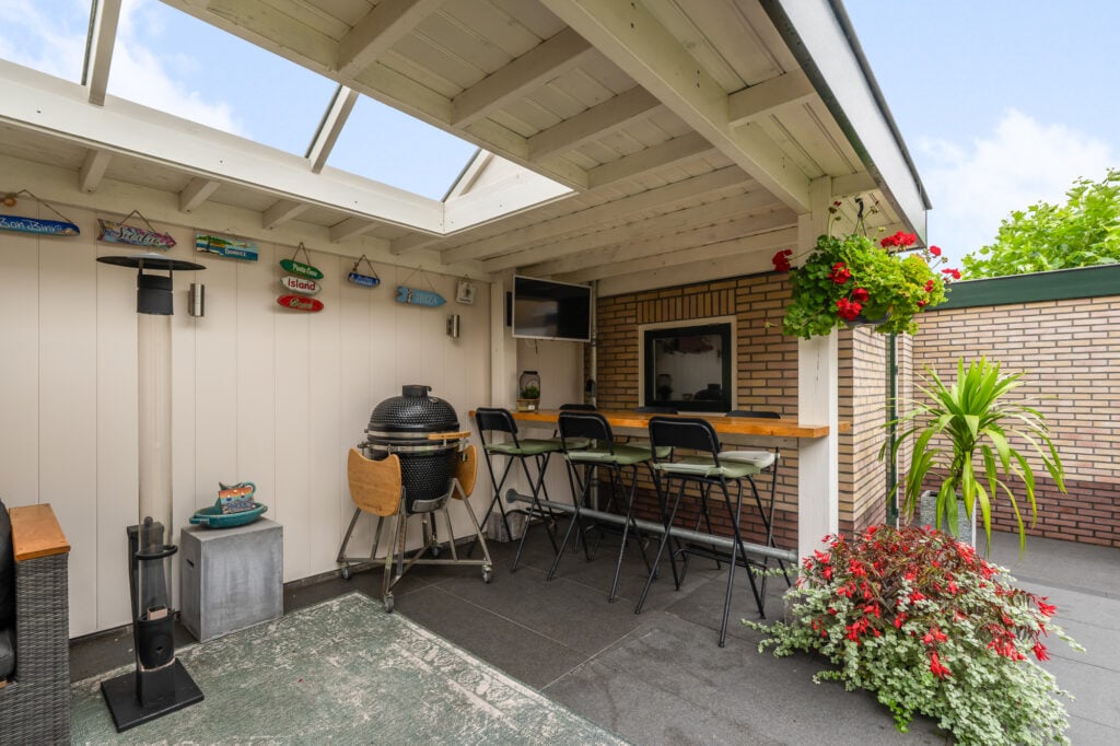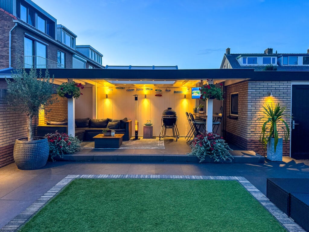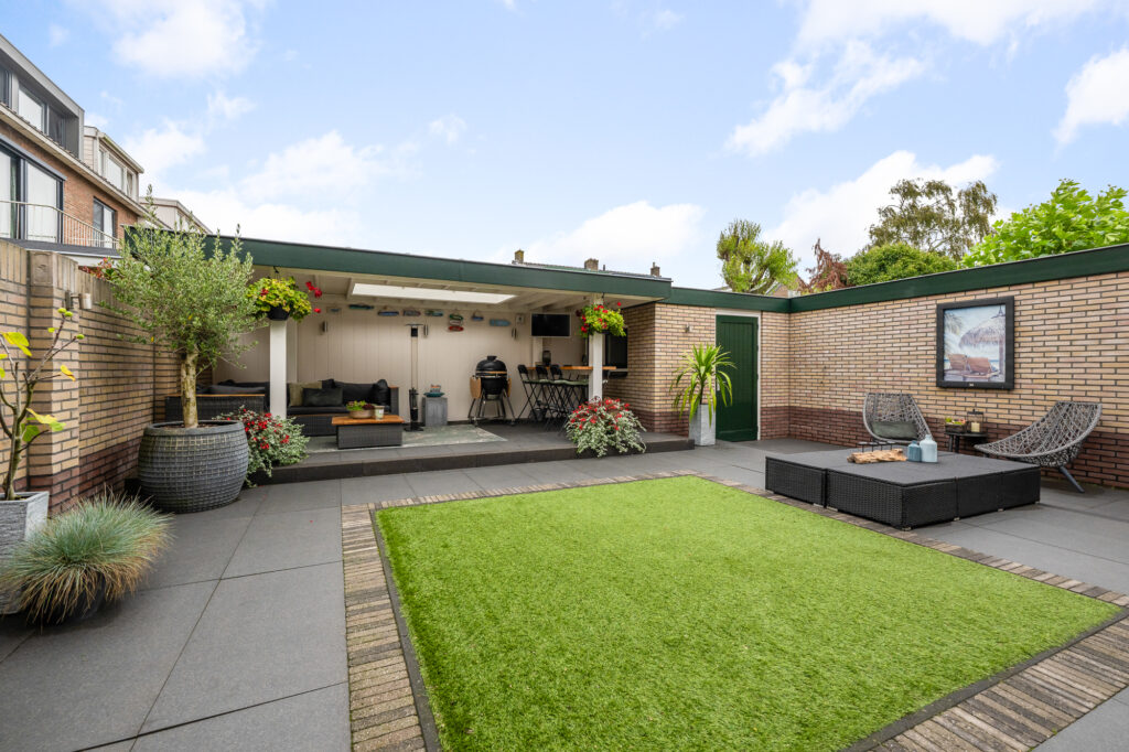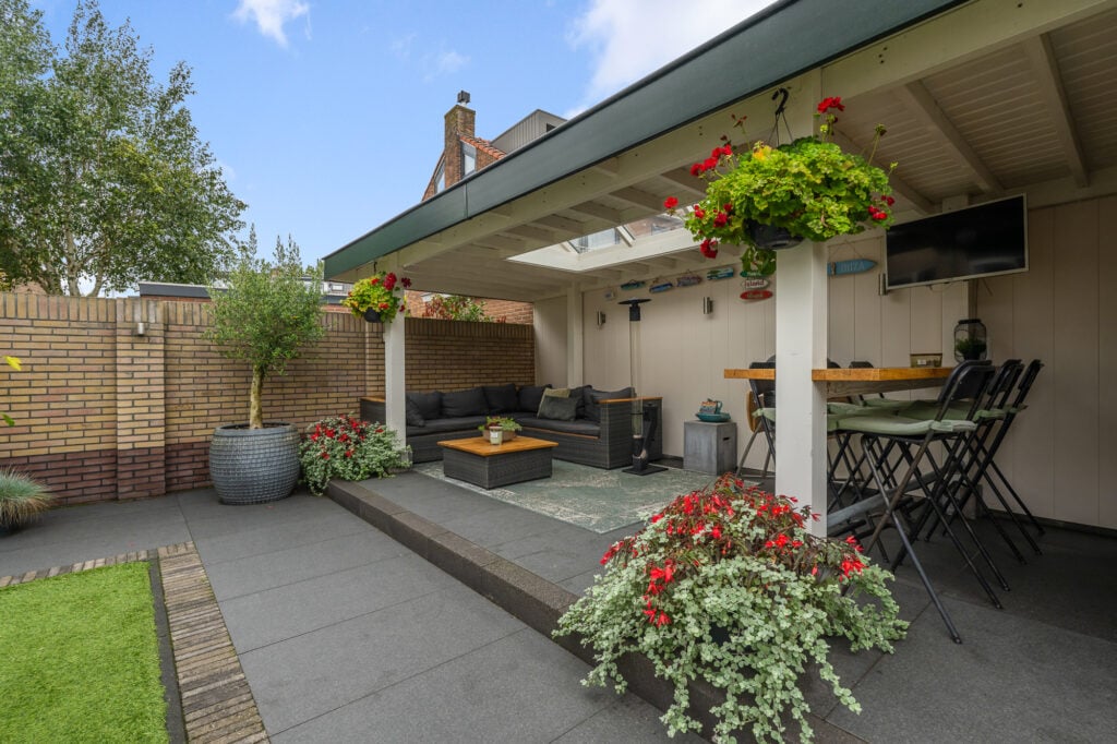 De royale tuin is een echt verlengstuk van je woonplezier. Een luxe overkapping met lichtkoepel (2,3 m diep en 6 m breed) creëert een gezellige setting waar je in alle rust, lange ontspannen avonden kunt beleven. Zet er je lounge set neer, geniet van een diner buiten of organiseer een barbecue, de mogelijkheden zijn eindeloos. Naast de overkapping vind je ook een ruime stenen berging voor al je spullen of andere toepassingen.