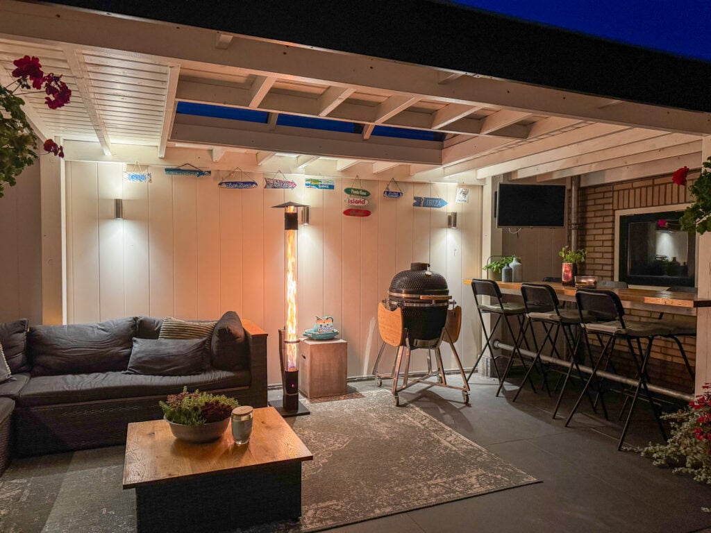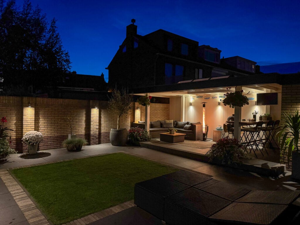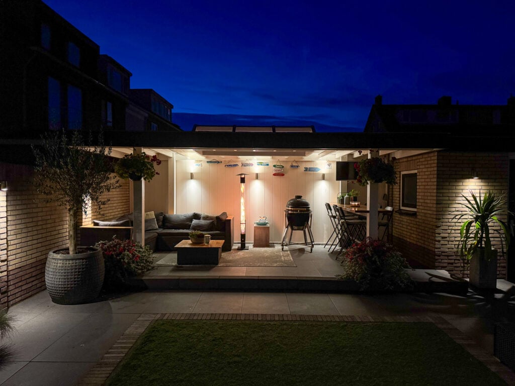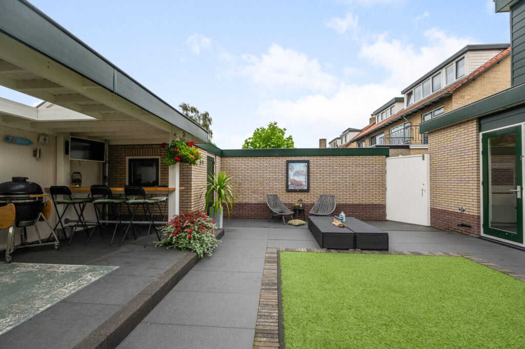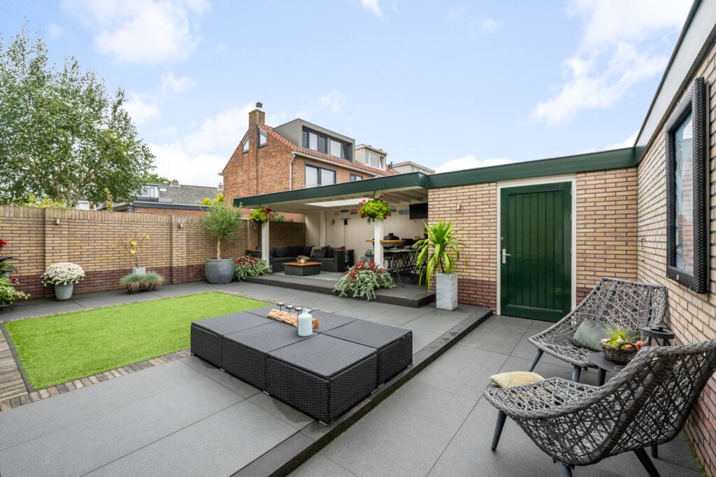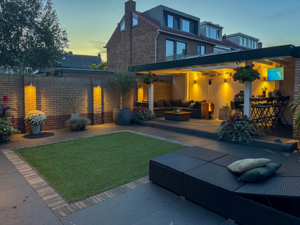 De royale tuin is een echt verlengstuk van je woonplezier. Een luxe overkapping met lichtkoepel (2,3 m diep en 6 m breed) creëert een gezellige setting waar je in alle rust, lange ontspannen avonden kunt beleven. Zet er je lounge set neer, geniet van een diner buiten of organiseer een barbecue, de mogelijkheden zijn eindeloos. Naast de overkapping vind je ook een ruime stenen berging voor al je spullen of andere toepassingen.