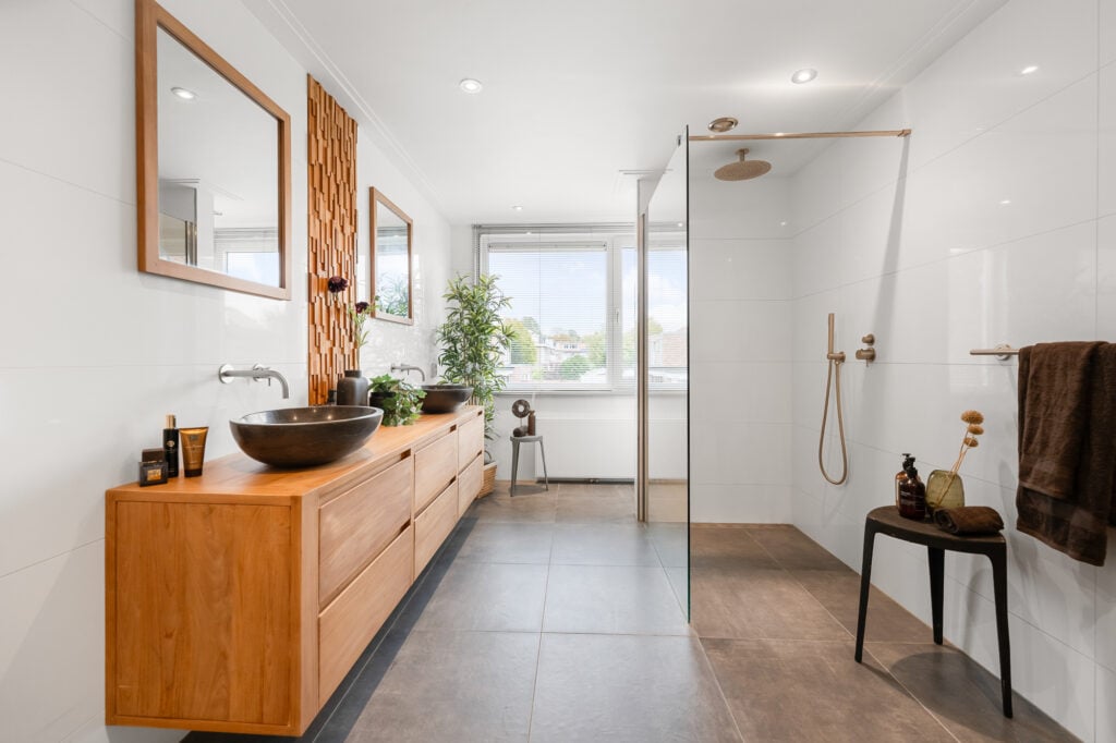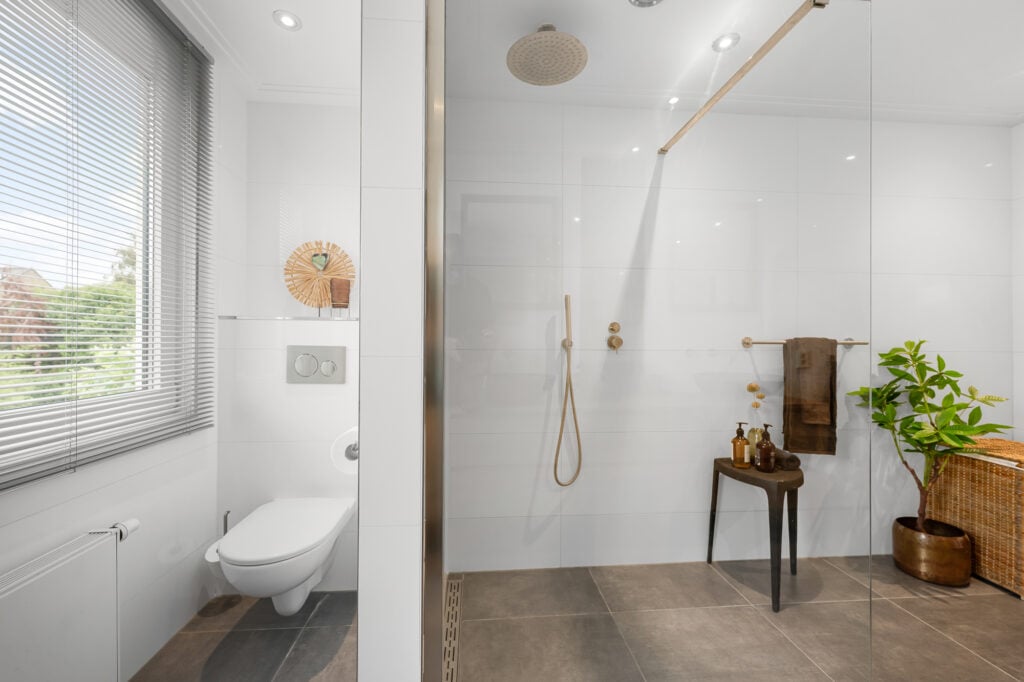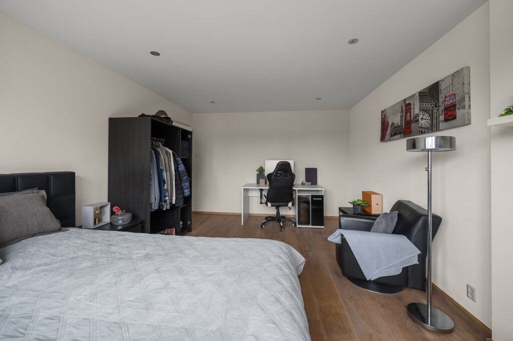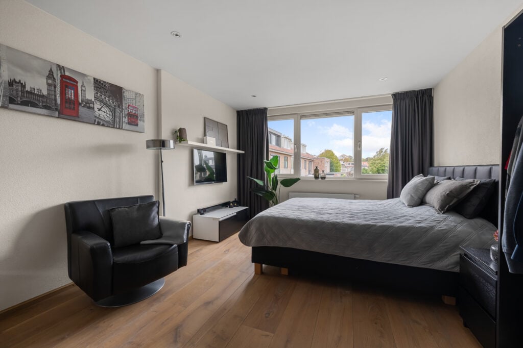 Op de 1e verdieping vind je twee zeer ruime slaapkamers, waarvan één al is uitgerust met een praktische inloopkast. De fraaie en ruime badkamer, compleet met vloerverwarming, inloopdouche, een tweede toilet en een luxe wastafelmeubel met dubbele wastafel, zorgt voor een heerlijke wellnesservaring. De regendouche en de geïntegreerde kranen in de muren en plafonds laten zien dat hier gewerkt is met kwaliteit.