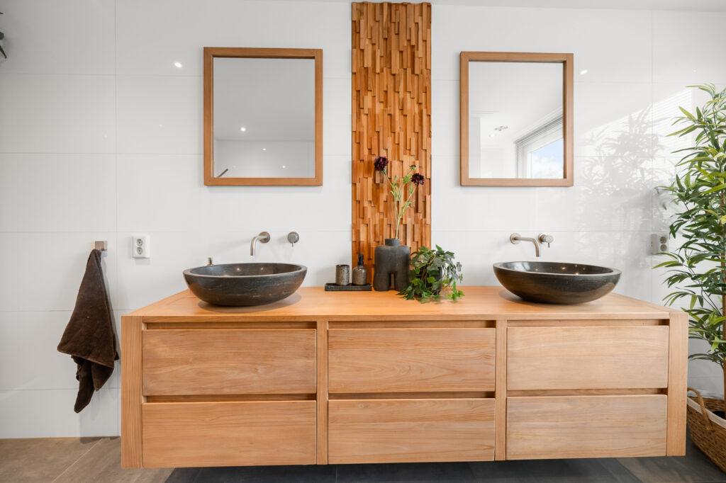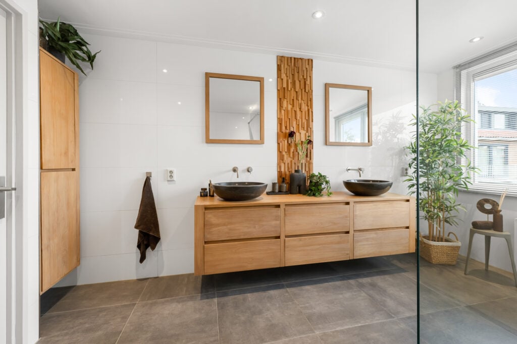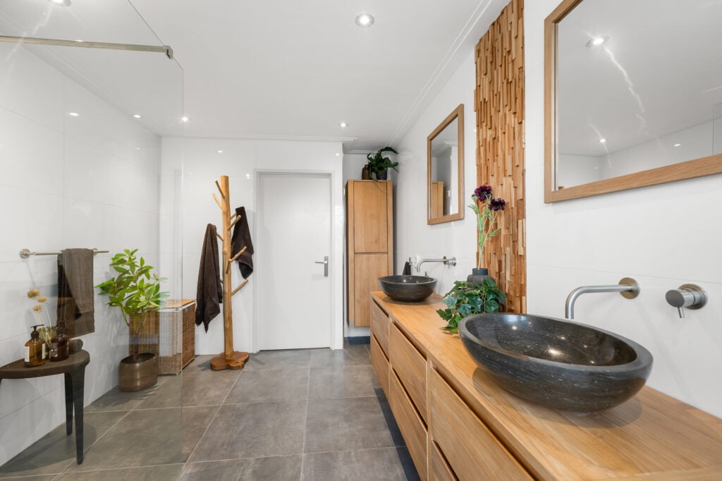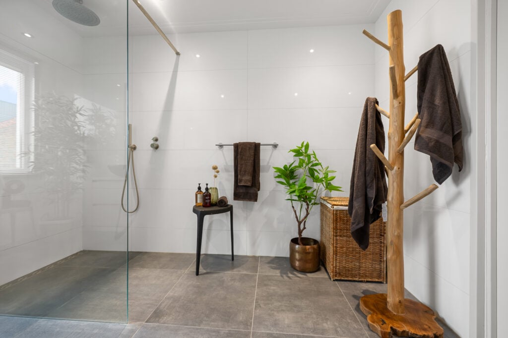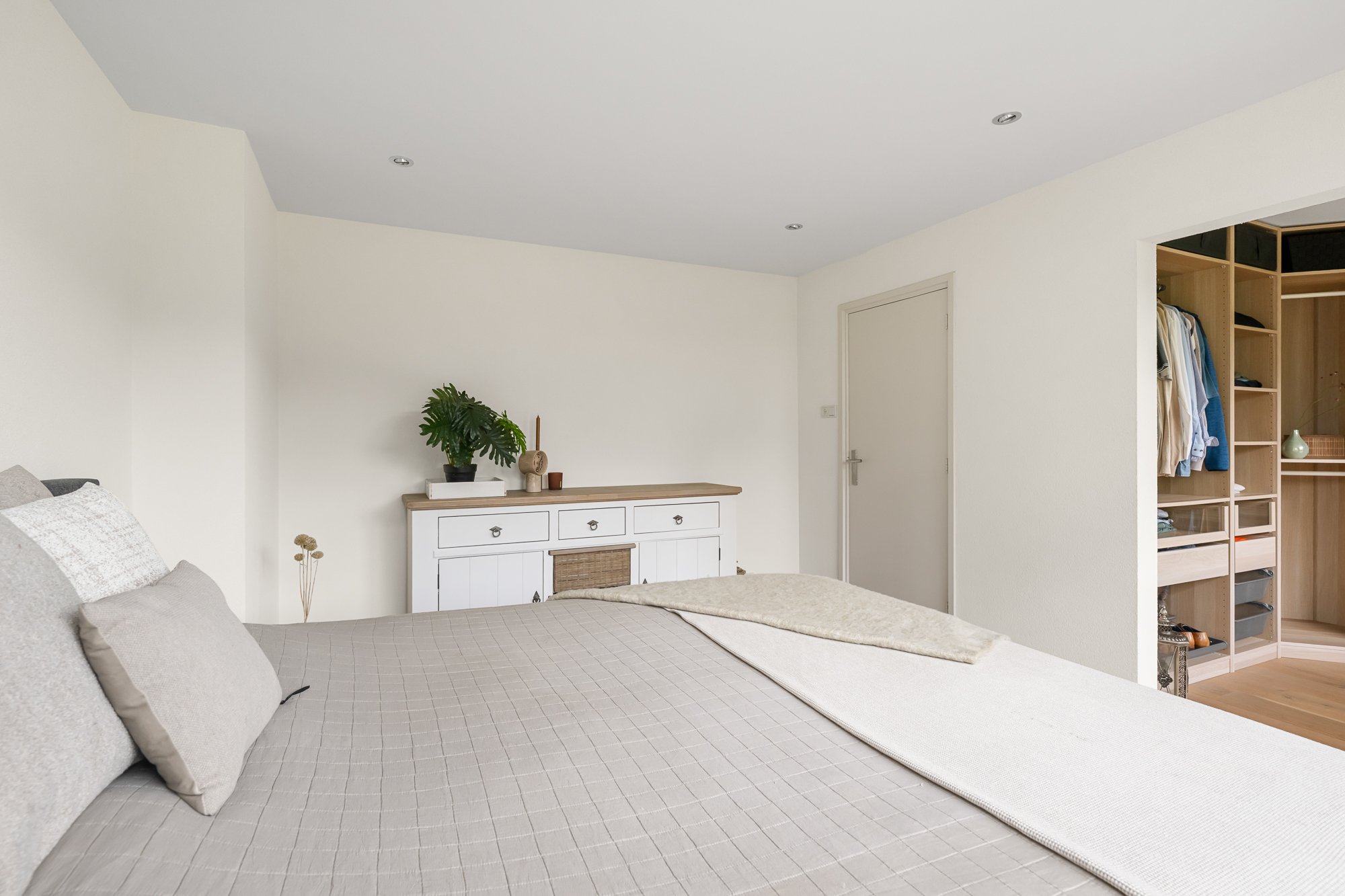 Op de 1e verdieping vind je twee zeer ruime slaapkamers, waarvan één al is uitgerust met een praktische inloopkast. De fraaie en ruime badkamer, compleet met vloerverwarming, inloopdouche, een tweede toilet en een luxe wastafelmeubel met dubbele wastafel, zorgt voor een heerlijke wellnesservaring. De regendouche en de geïntegreerde kranen in de muren en plafonds laten zien dat hier gewerkt is met kwaliteit.