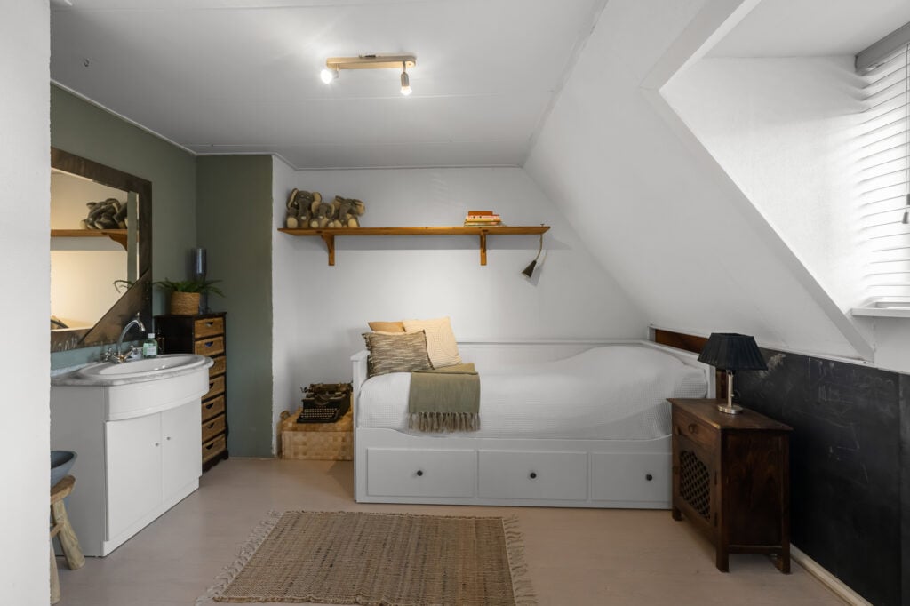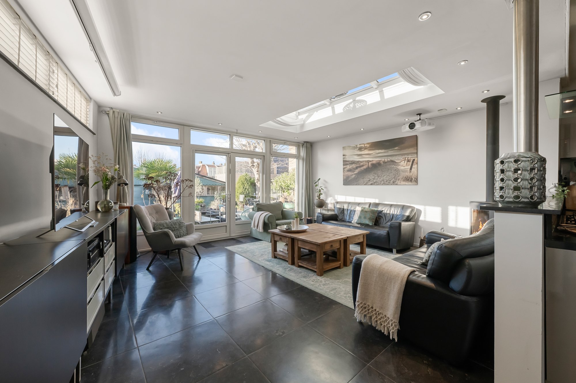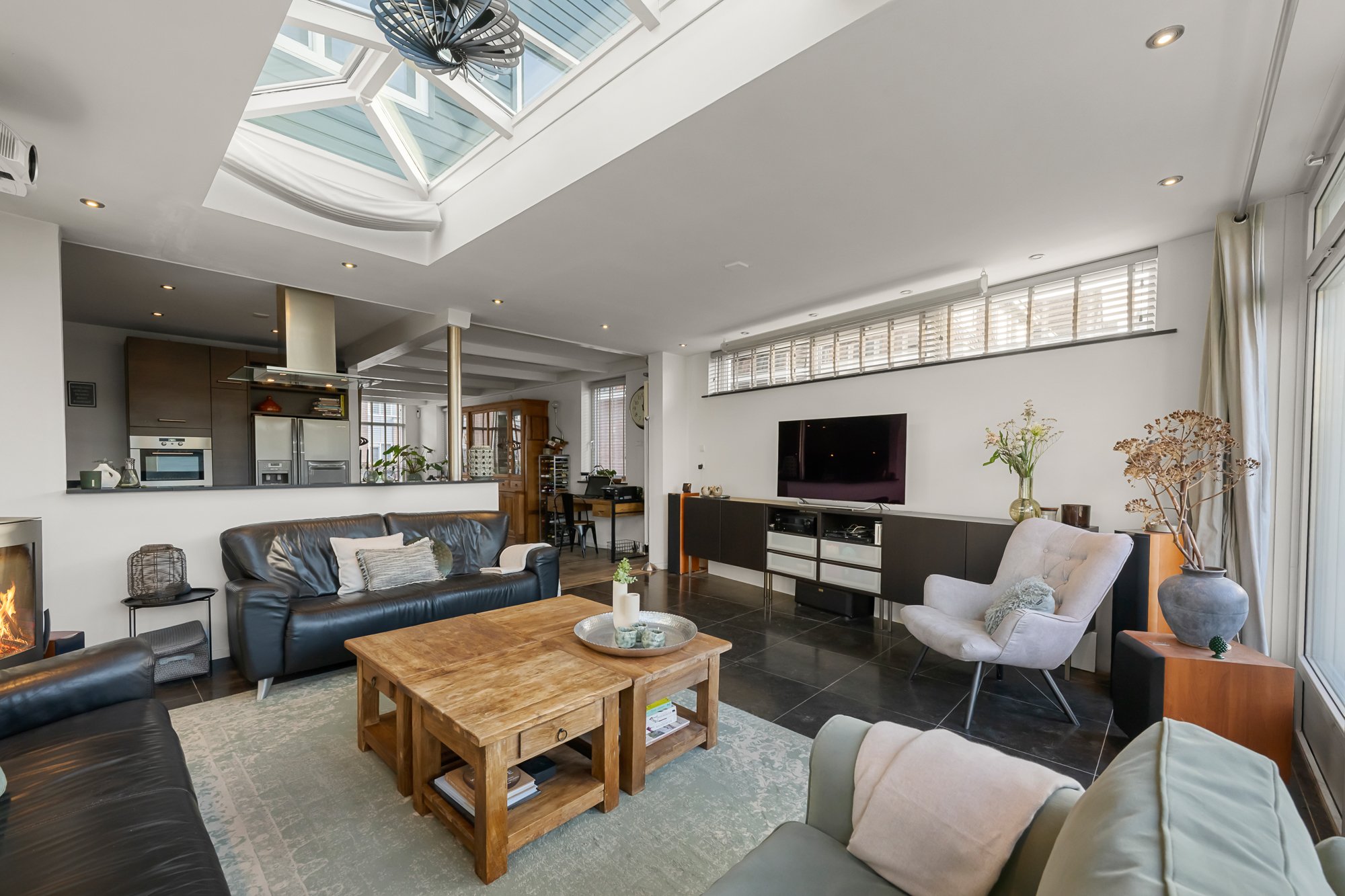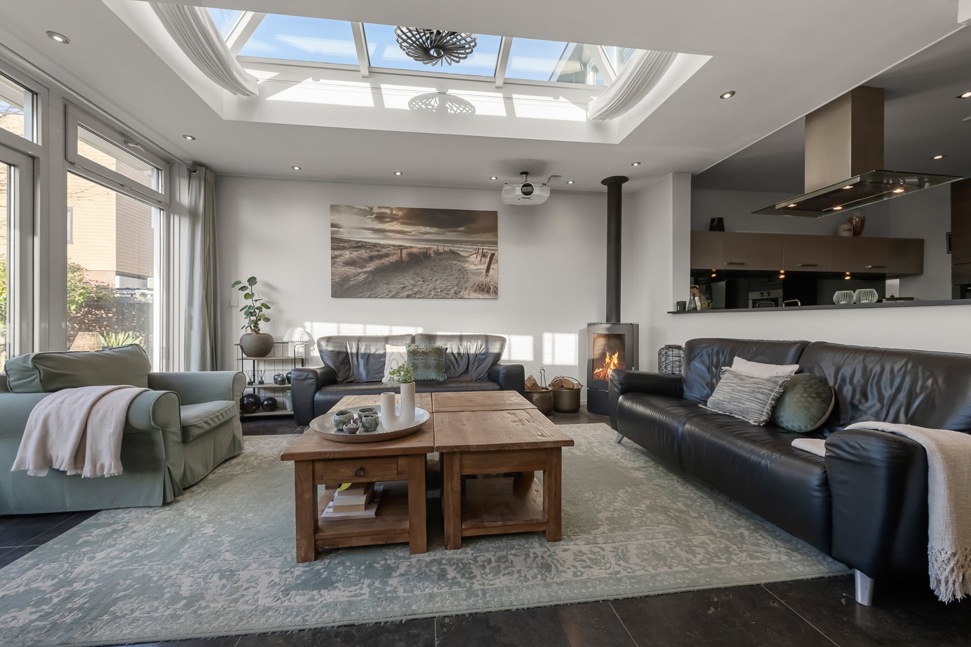 De leefruimtes zijn royaal en licht, met volop mogelijkheden om meerdere zit- en leefhoeken te creëren. Verwarming en sfeer komen van de aanwezige houtkachel, die het huis in de koudere maanden een warme, huiselijke uitstraling geeft.