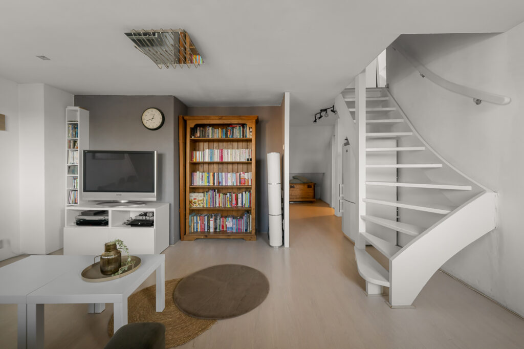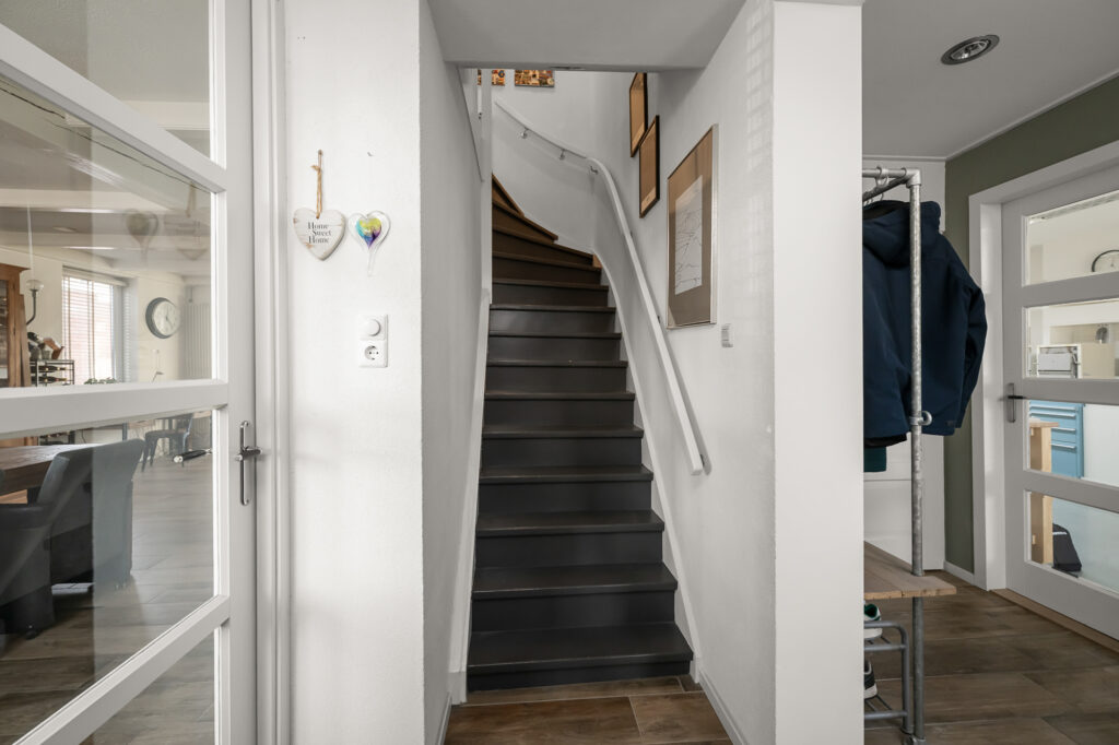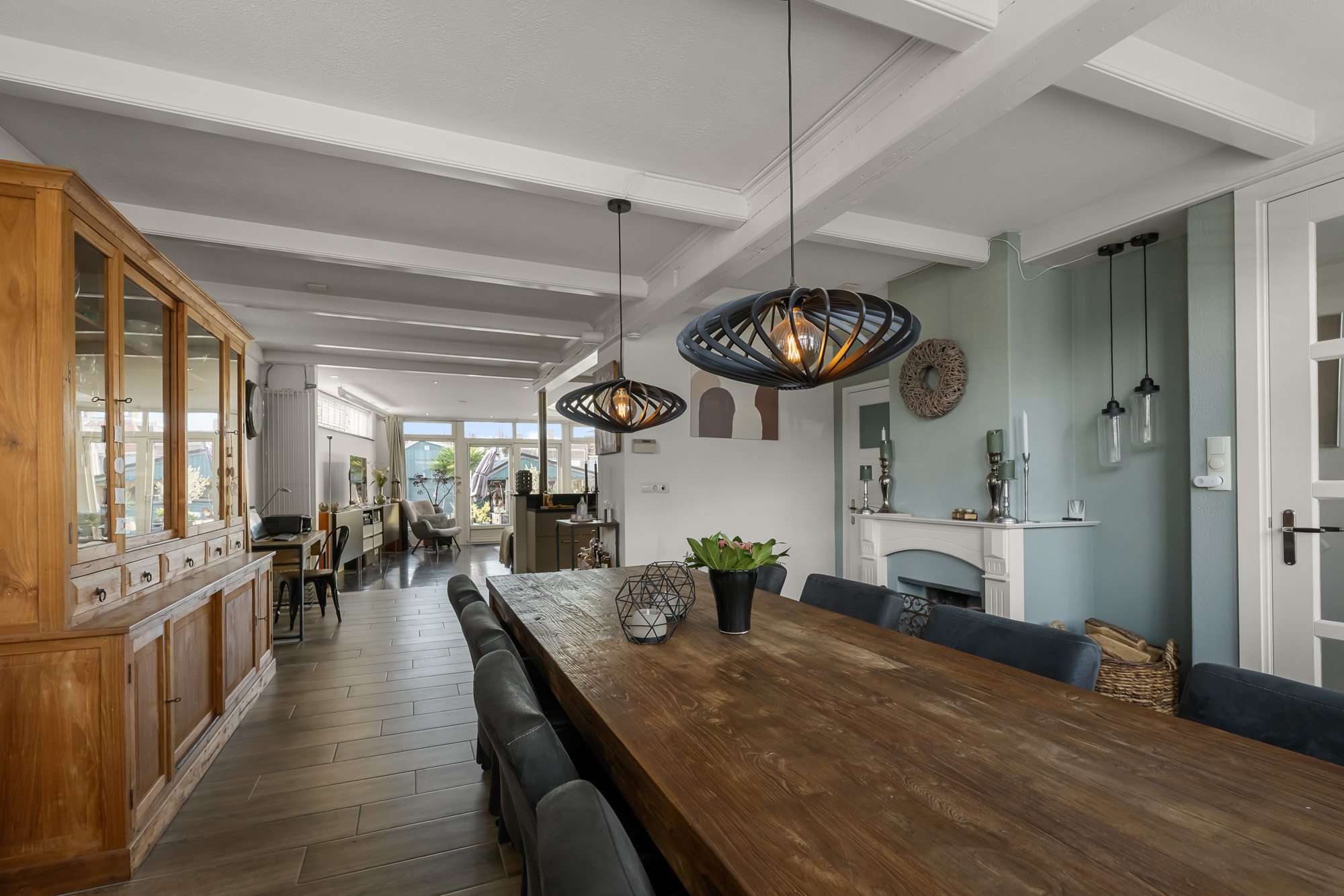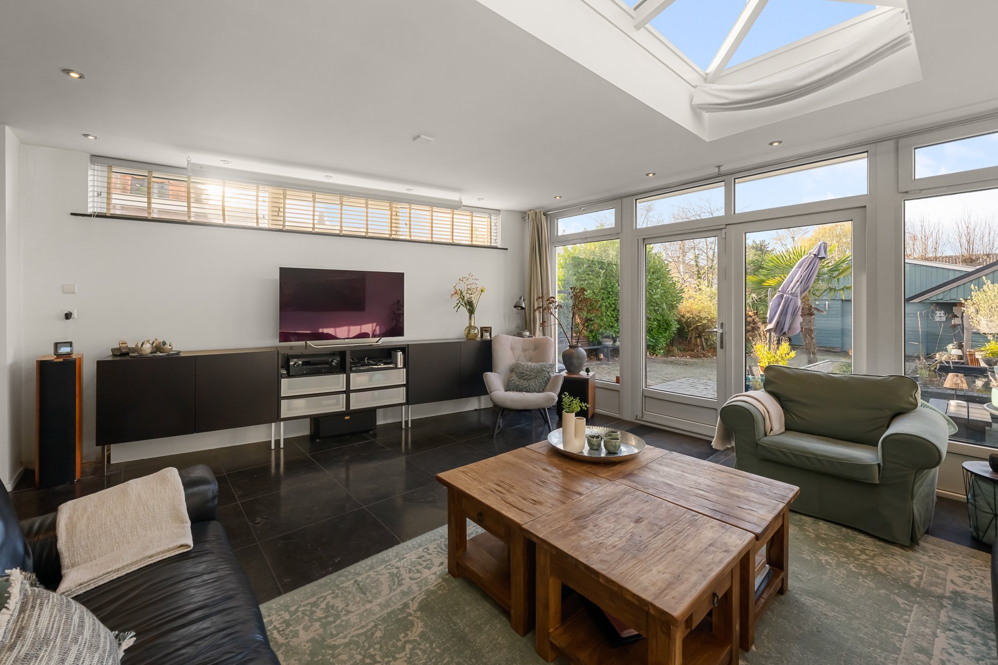 De leefruimtes zijn royaal en licht, met volop mogelijkheden om meerdere zit- en leefhoeken te creëren. Verwarming en sfeer komen van de aanwezige houtkachel, die het huis in de koudere maanden een warme, huiselijke uitstraling geeft.