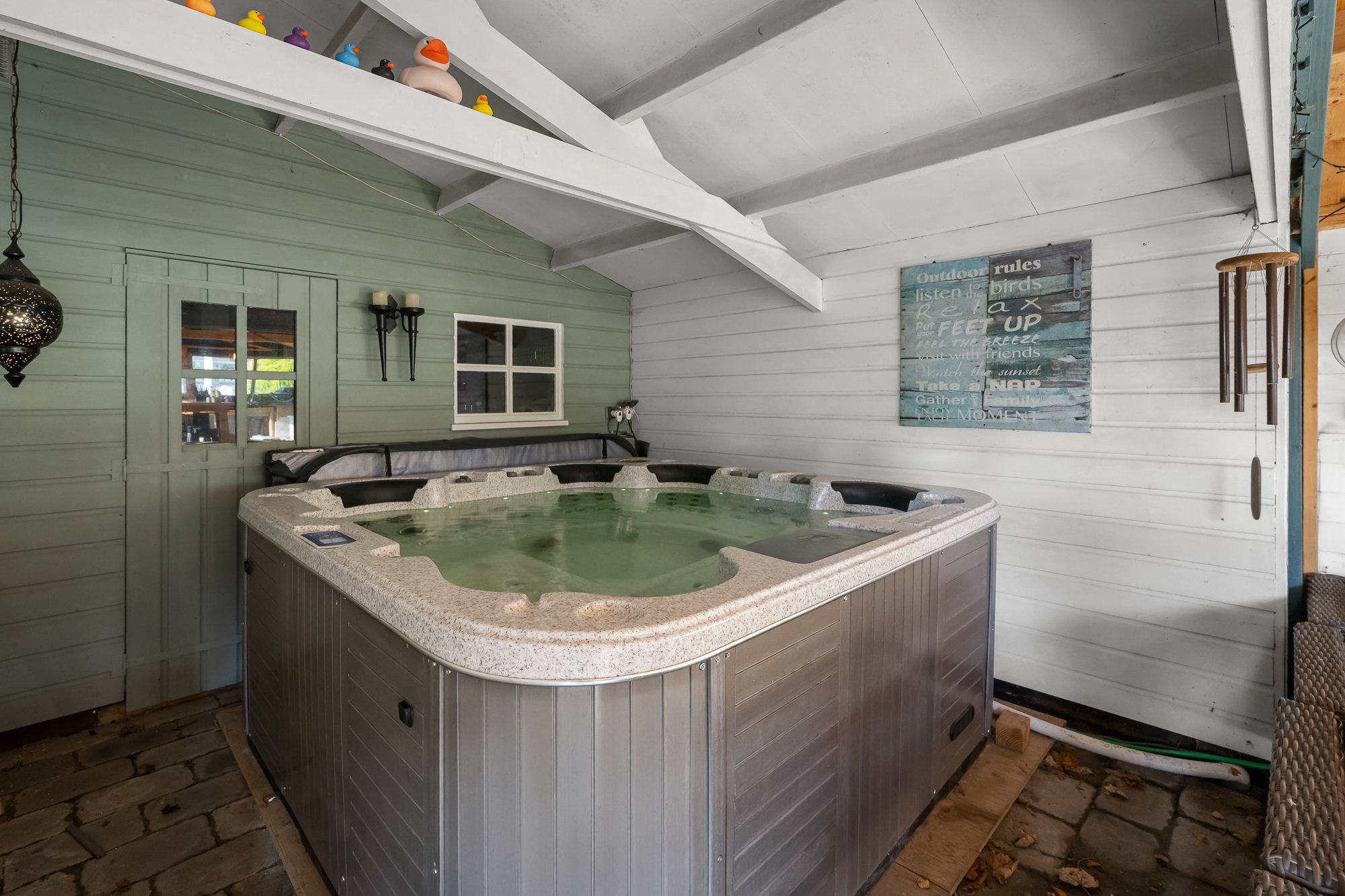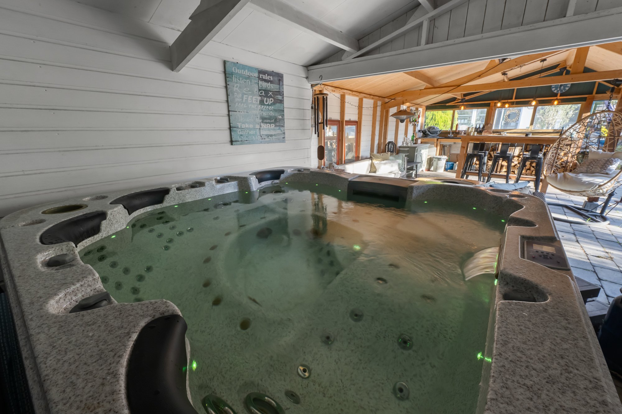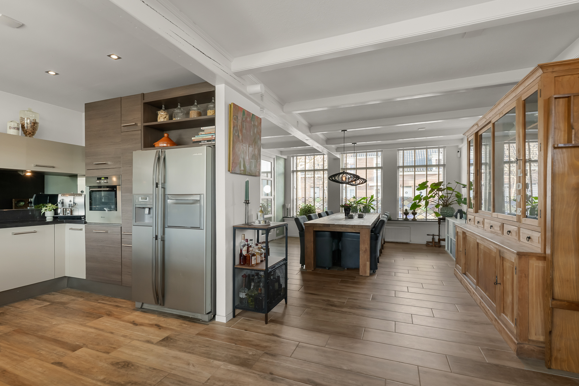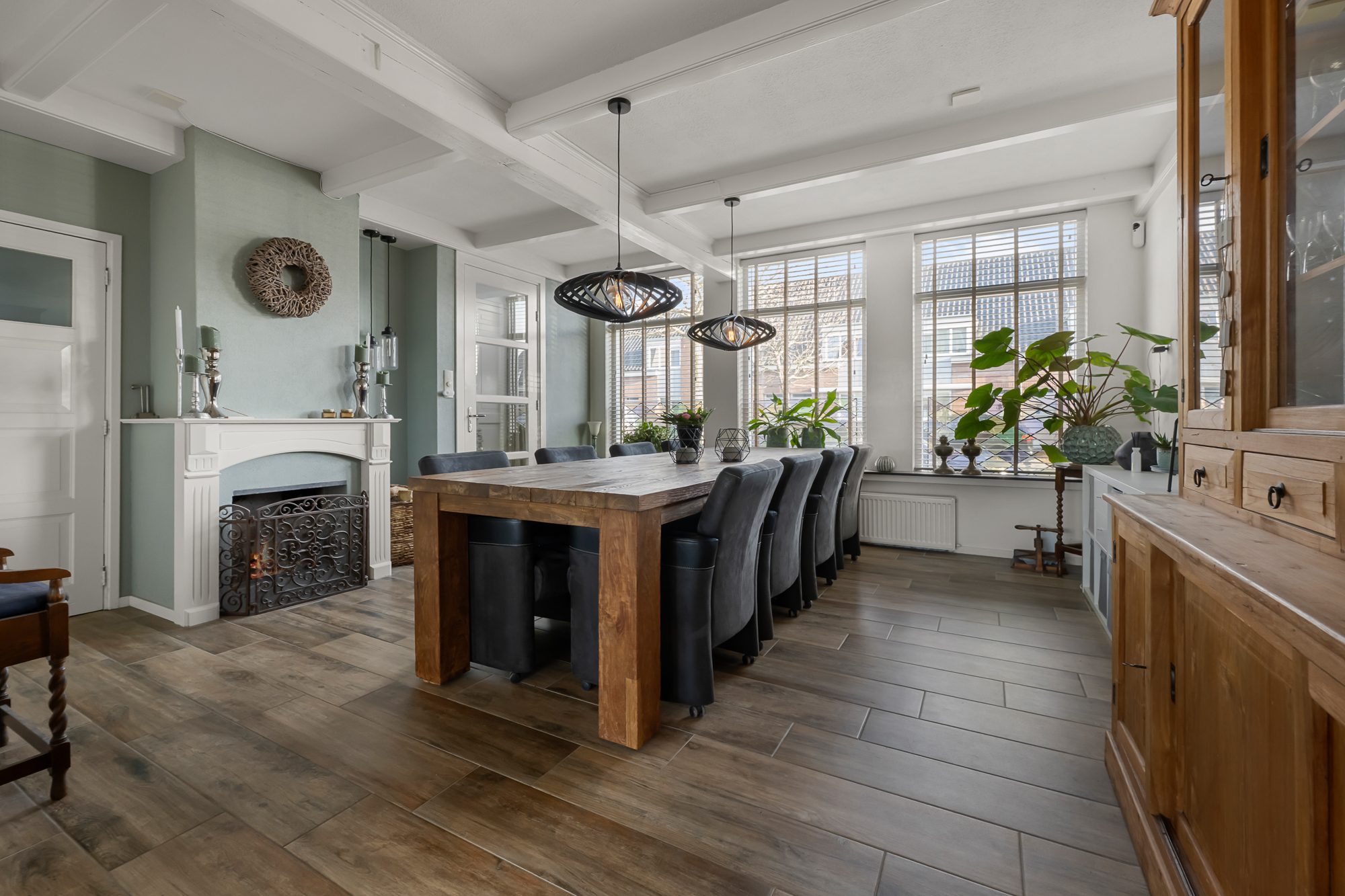 De leefruimtes zijn royaal en licht, met volop mogelijkheden om meerdere zit- en leefhoeken te creëren. Verwarming en sfeer komen van de aanwezige houtkachel, die het huis in de koudere maanden een warme, huiselijke uitstraling geeft.