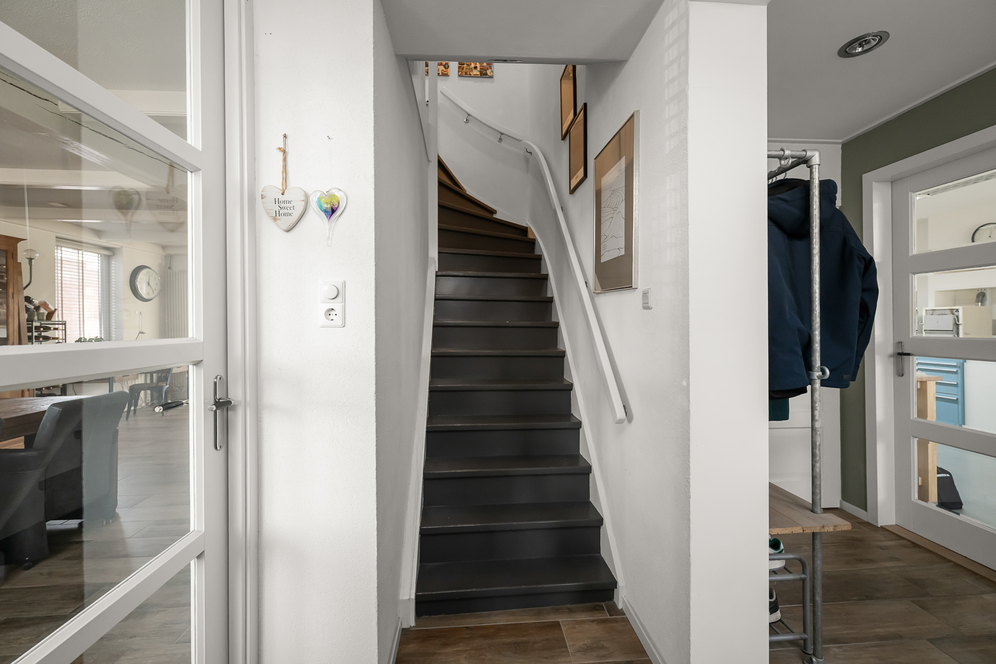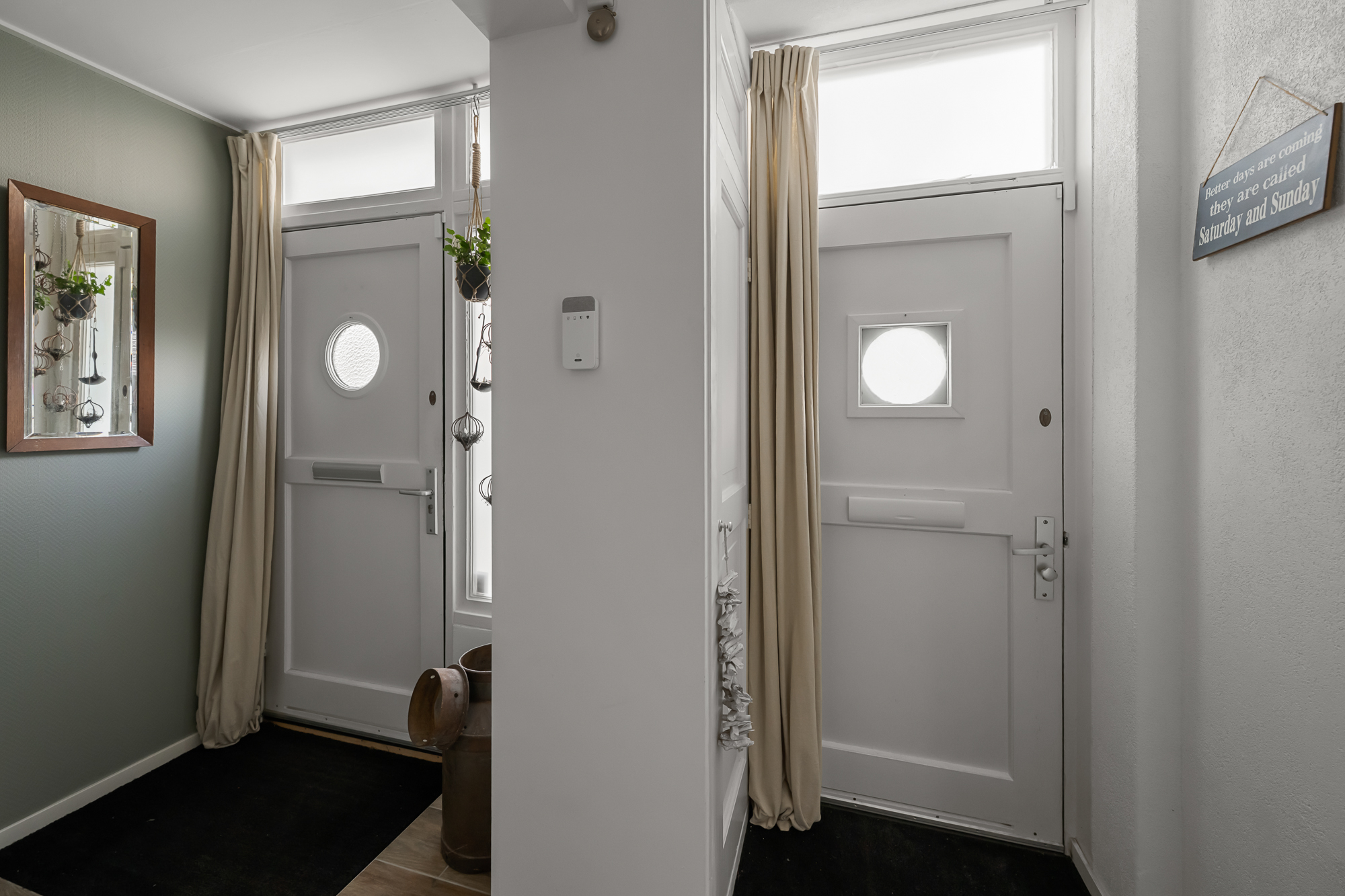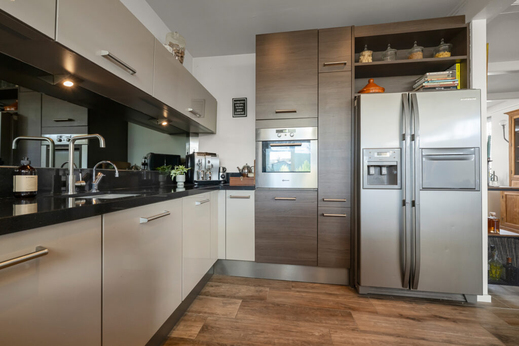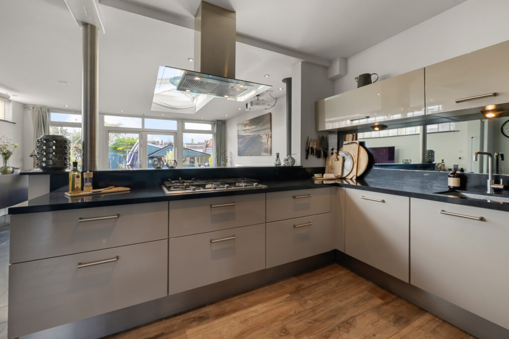 Zodra je binnenkomt, wordt direct duidelijk hoe bijzonder de opzet van deze woning is. De begane grond is namelijk nog steeds ingericht met het oorspronkelijke tweewoningenconcept in gedachten. Aan beide zijden van het huis is een keuken aanwezig, wat het eenvoudig maakt om de woning (opnieuw) te splitsen in twee zelfstandige woongedeelten. Aan de zijde van het voormalige nummer 10 is bovendien al rekening gehouden met de aanleg voor een badkamer, terwijl aan de zijde van nummer 12 een toiletaansluiting beschikbaar is. Hierdoor is de basis voor dubbele bewoning, mantelzorg of inwonende (volwassen) kinderen al gelegd, zonder ingrijpende verbouwingen.