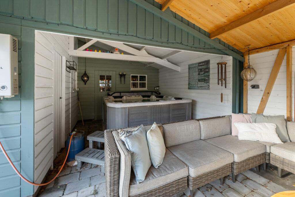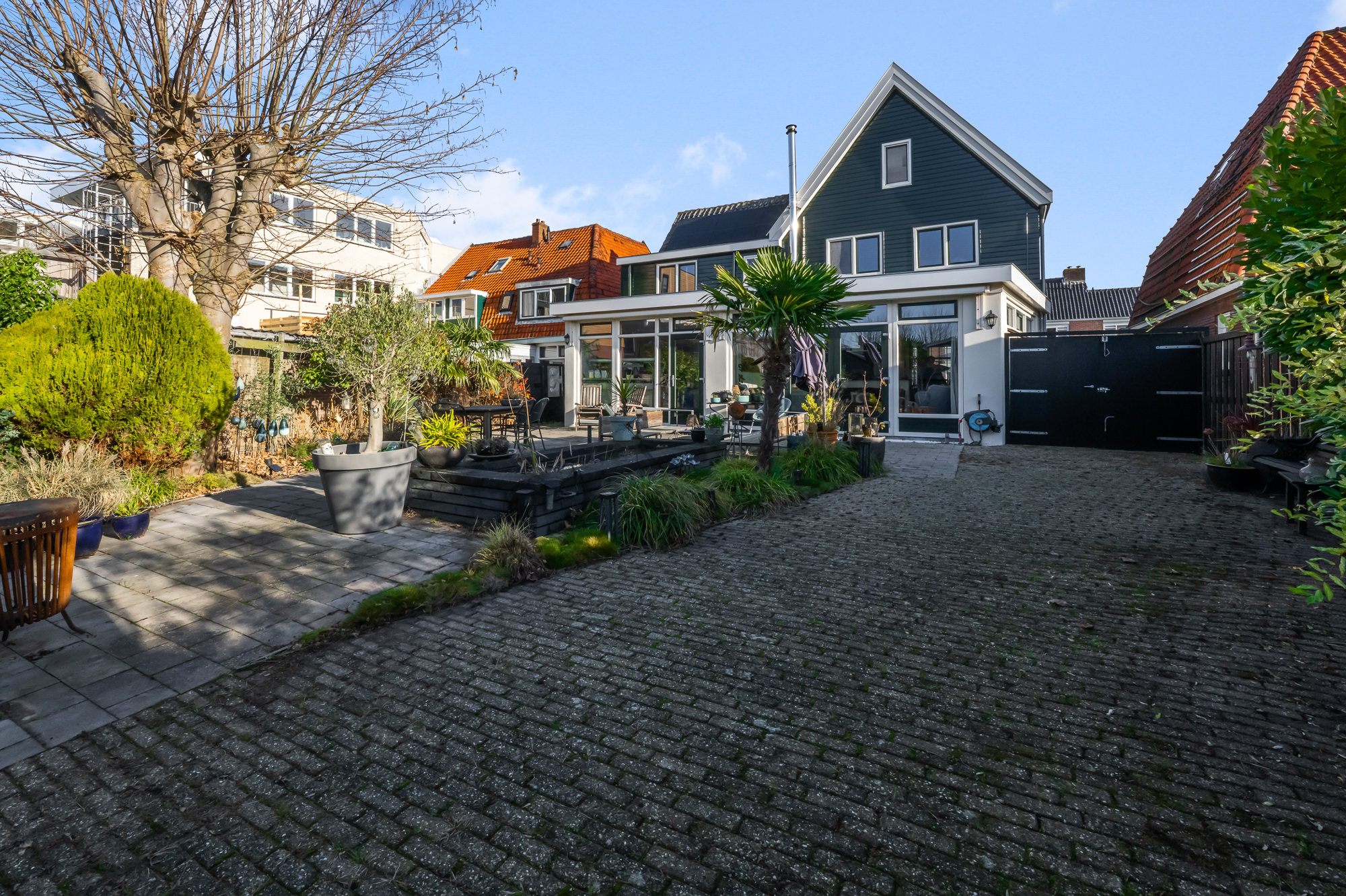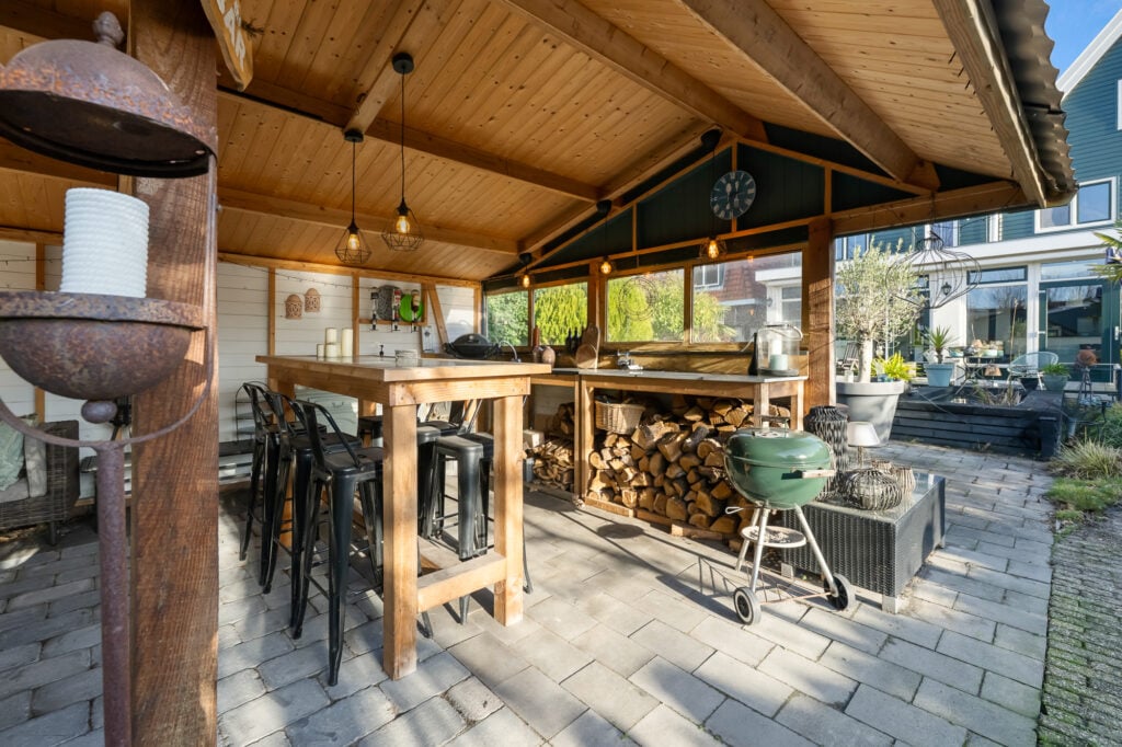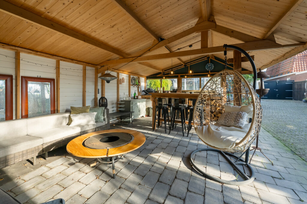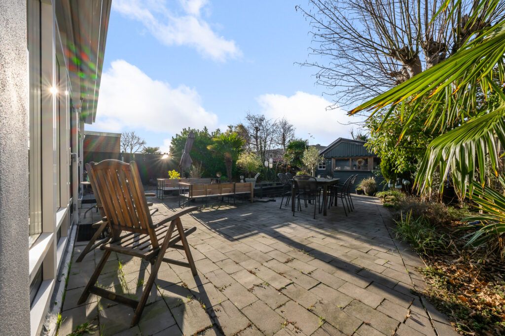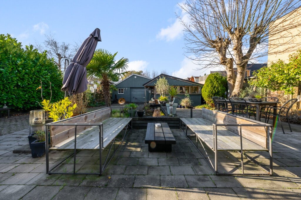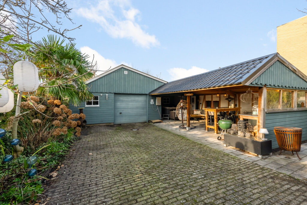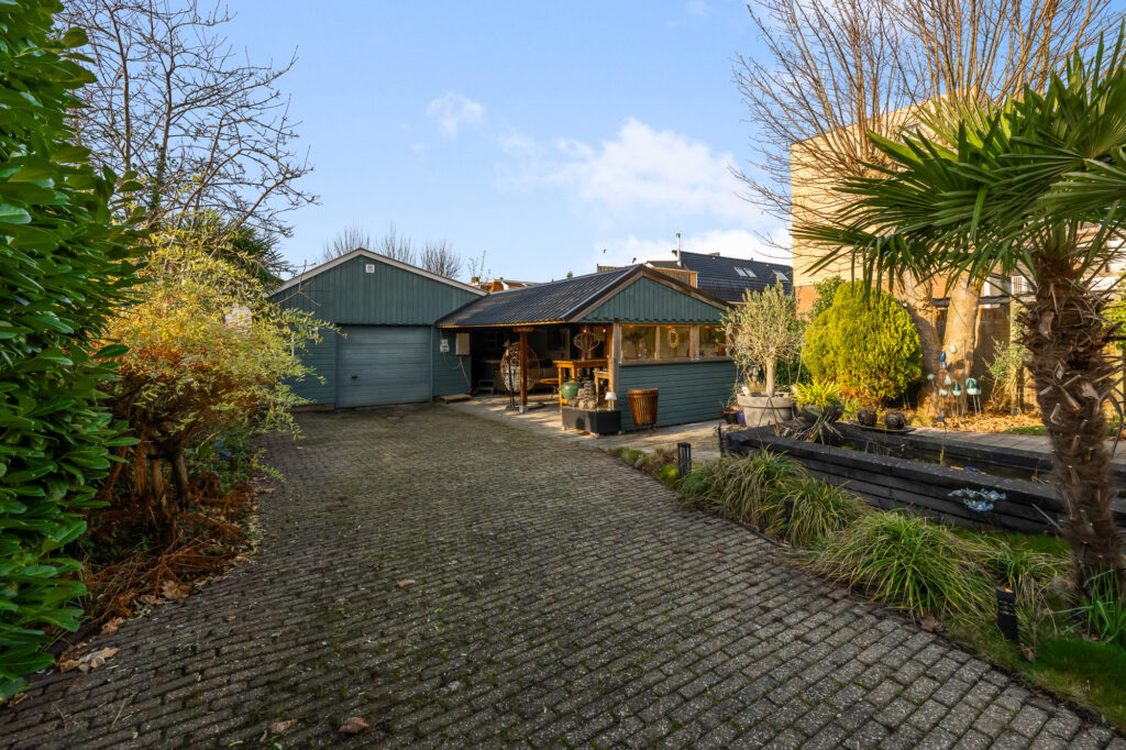 Ook buiten is de ruimte indrukwekkend. Het perceel van circa 489 m² biedt een royale achtertuin, met volop privacy en mogelijkheden voor meerdere terrassen, speelruimte of groen. Parkeren kan op eigen terrein, wat in deze omgeving een groot pluspunt is. Achter in de tuin staat een grote vrijstaande garage, perfect voor auto’s, motoren, opslag of als klus- en hobbyruimte.
