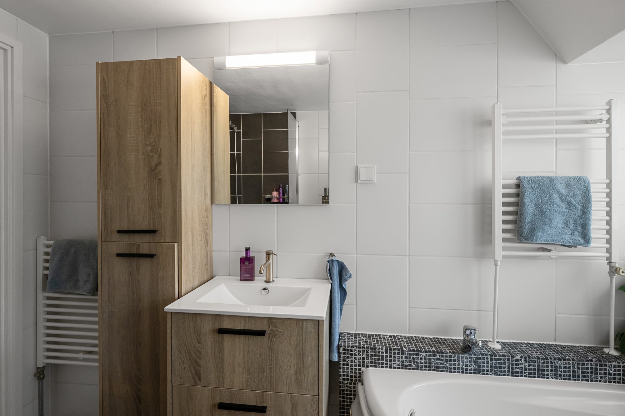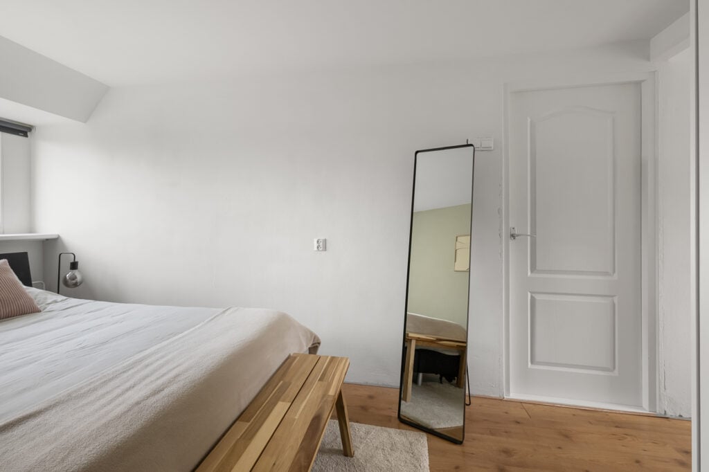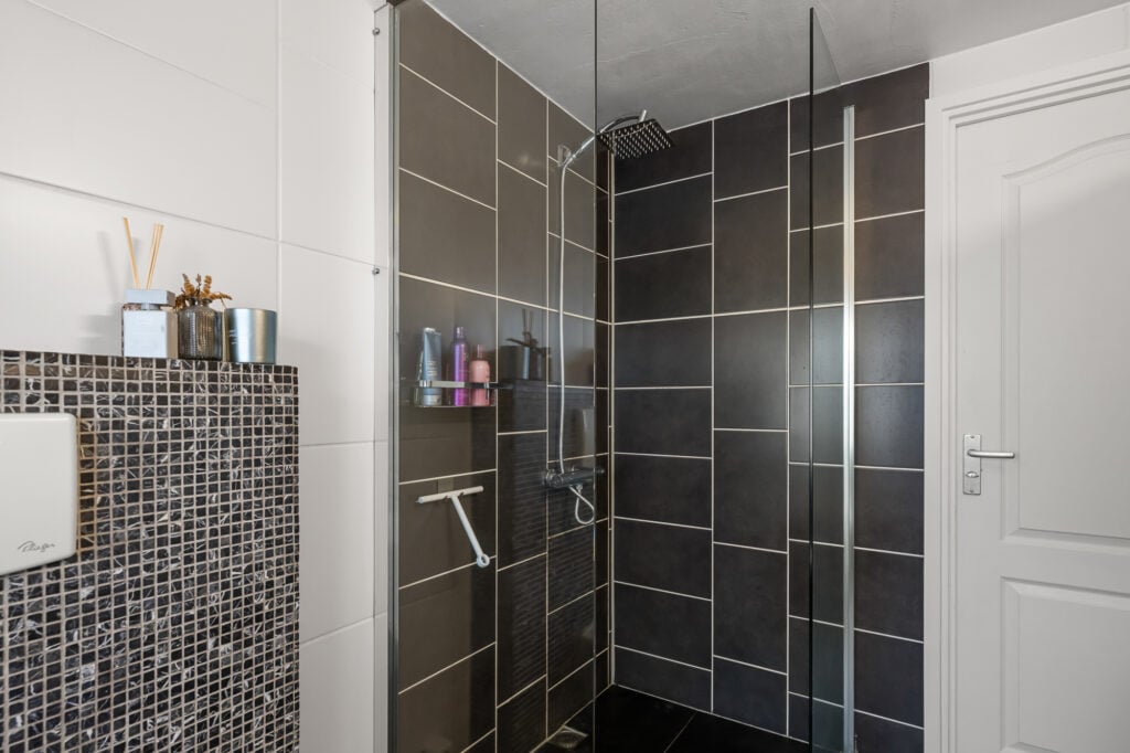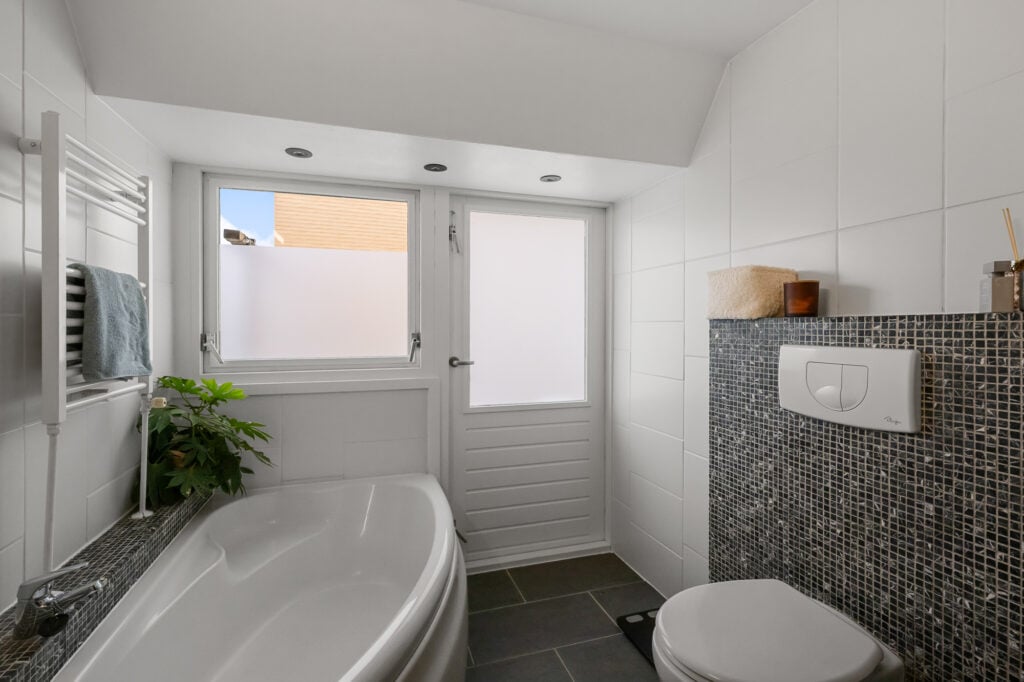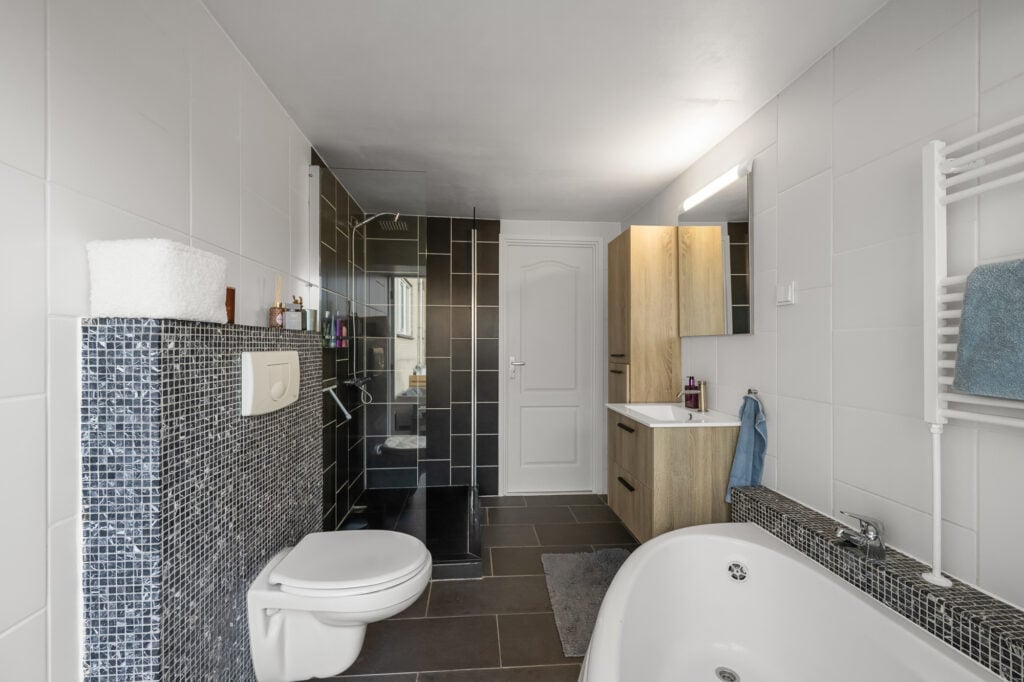 Op de eerste verdieping zijn van oorsprong drie slaapkamers. De huidige indeling biedt een ruime hoofdslaapkamer met een inloopkast, ideaal voor wie graag wat extra opbergruimte heeft. Wie wil, kan hier eenvoudig weer drie kamers van maken. De badkamer is modern uitgevoerd en voorzien van een ligbad, inloopdouche, wastafelmeubel (vernieuwd in 2023) en een tweede toilet.