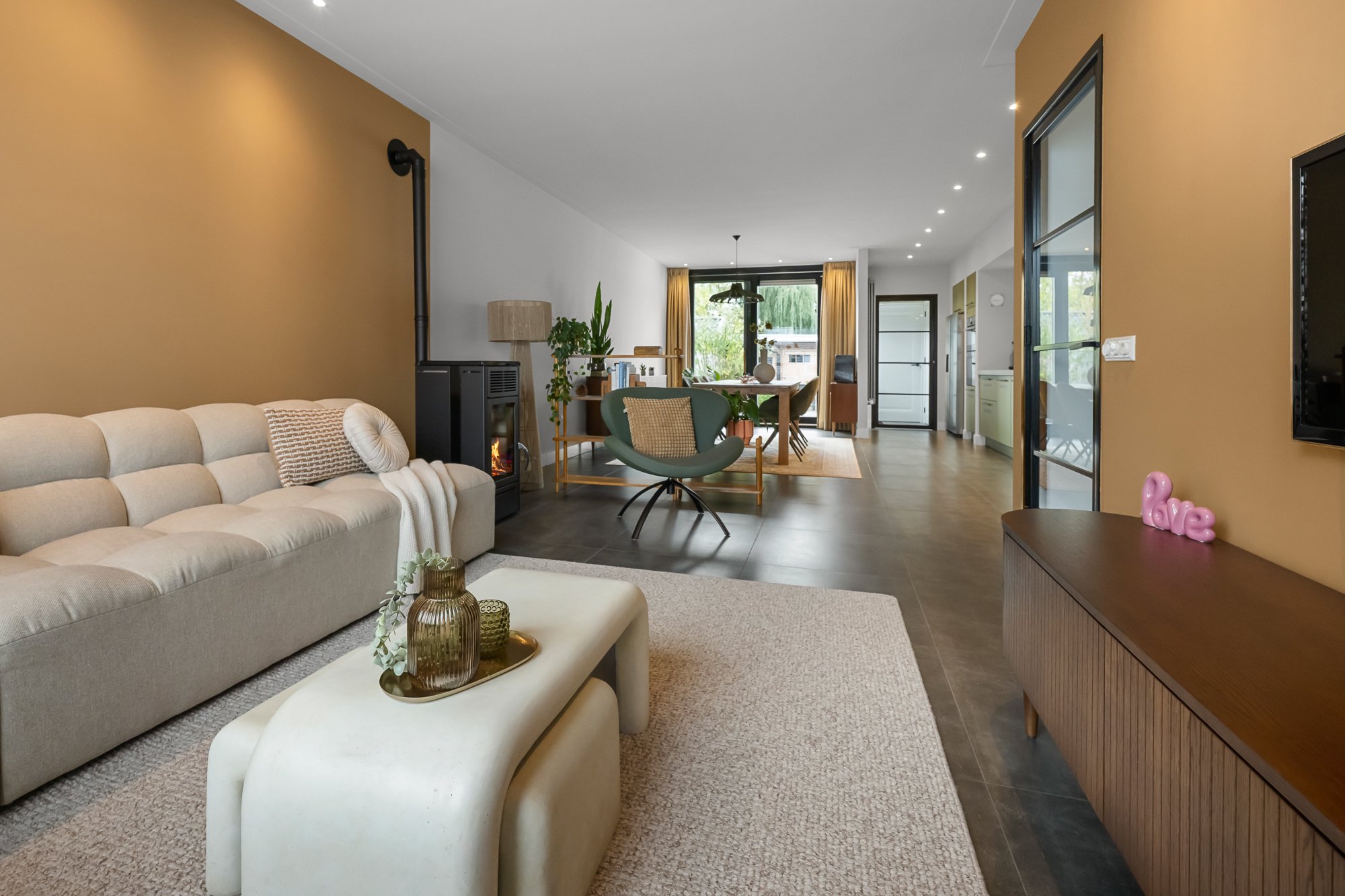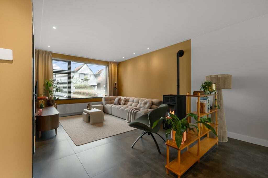 Bij binnenkomst voel je direct de warme en verzorgde sfeer. De woonkamer aan de voorzijde is licht en gezellig, met een sfeervolle zithoek en een pelletkachel die zorgt voor warmte en extra gezelligheid.