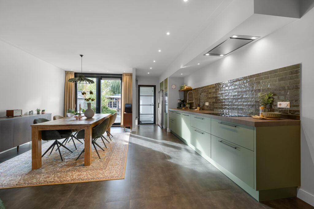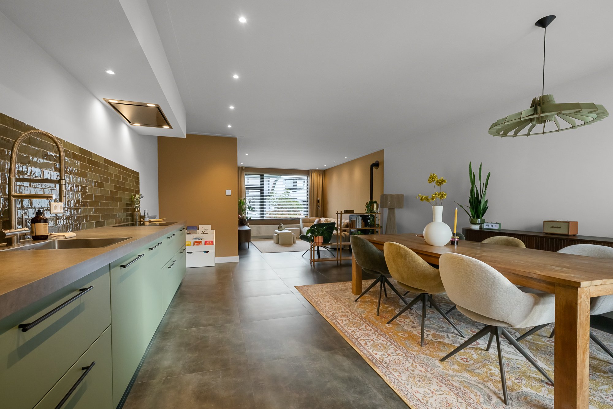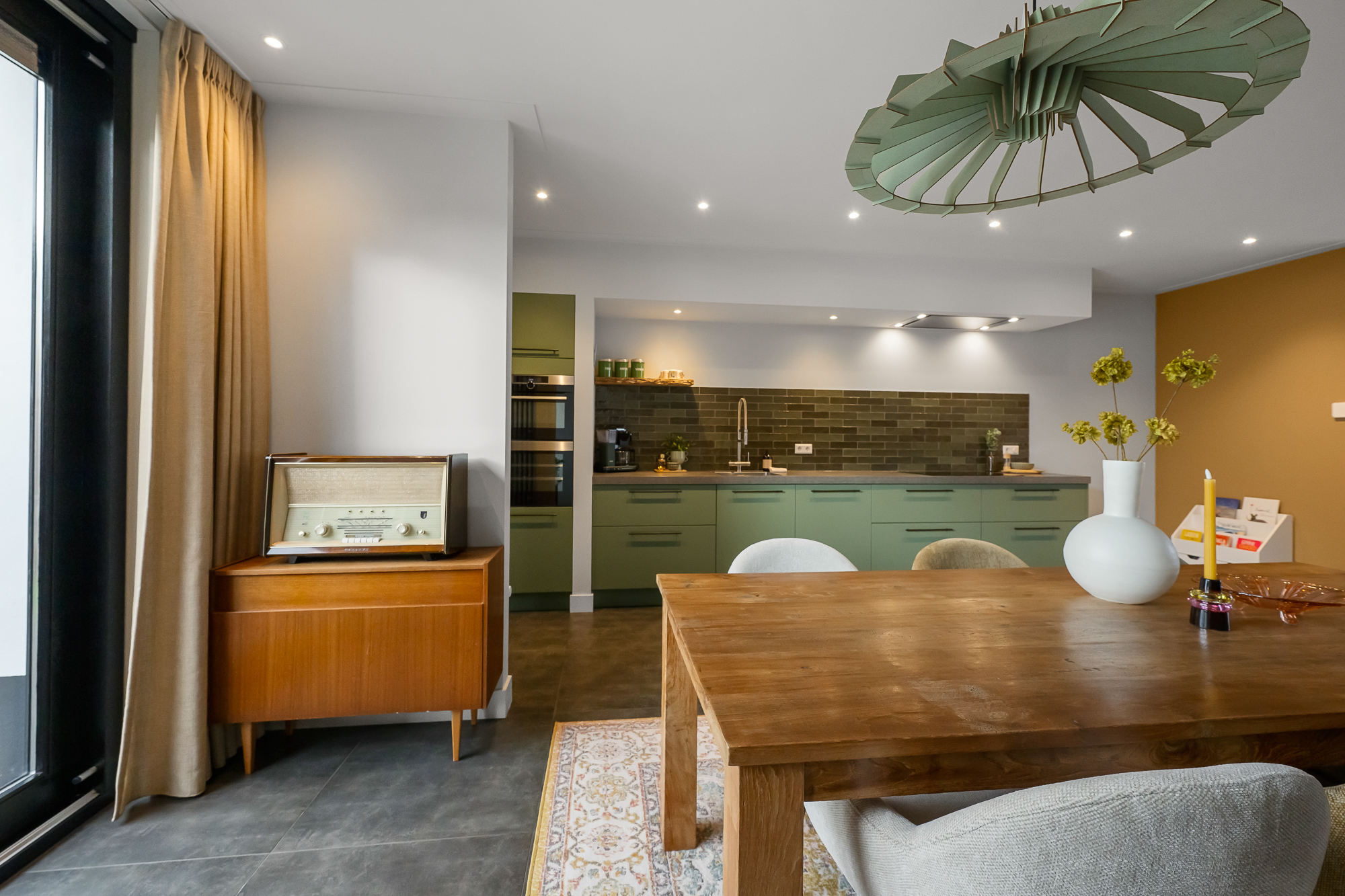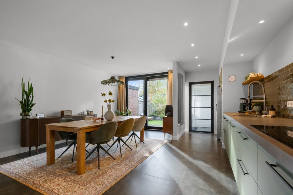 Aansluitend vind je de moderne keuken, compleet uitgerust met hoogwaardige inbouwapparatuur zoals een inductiekookplaat, wijnklimaatkast, kokendwaterkraan en combioven. Achter de keuken bevinden zich een praktische wasruimte en een apart toilet.
