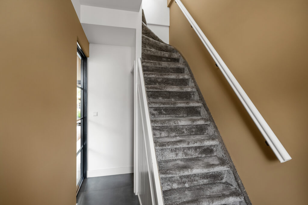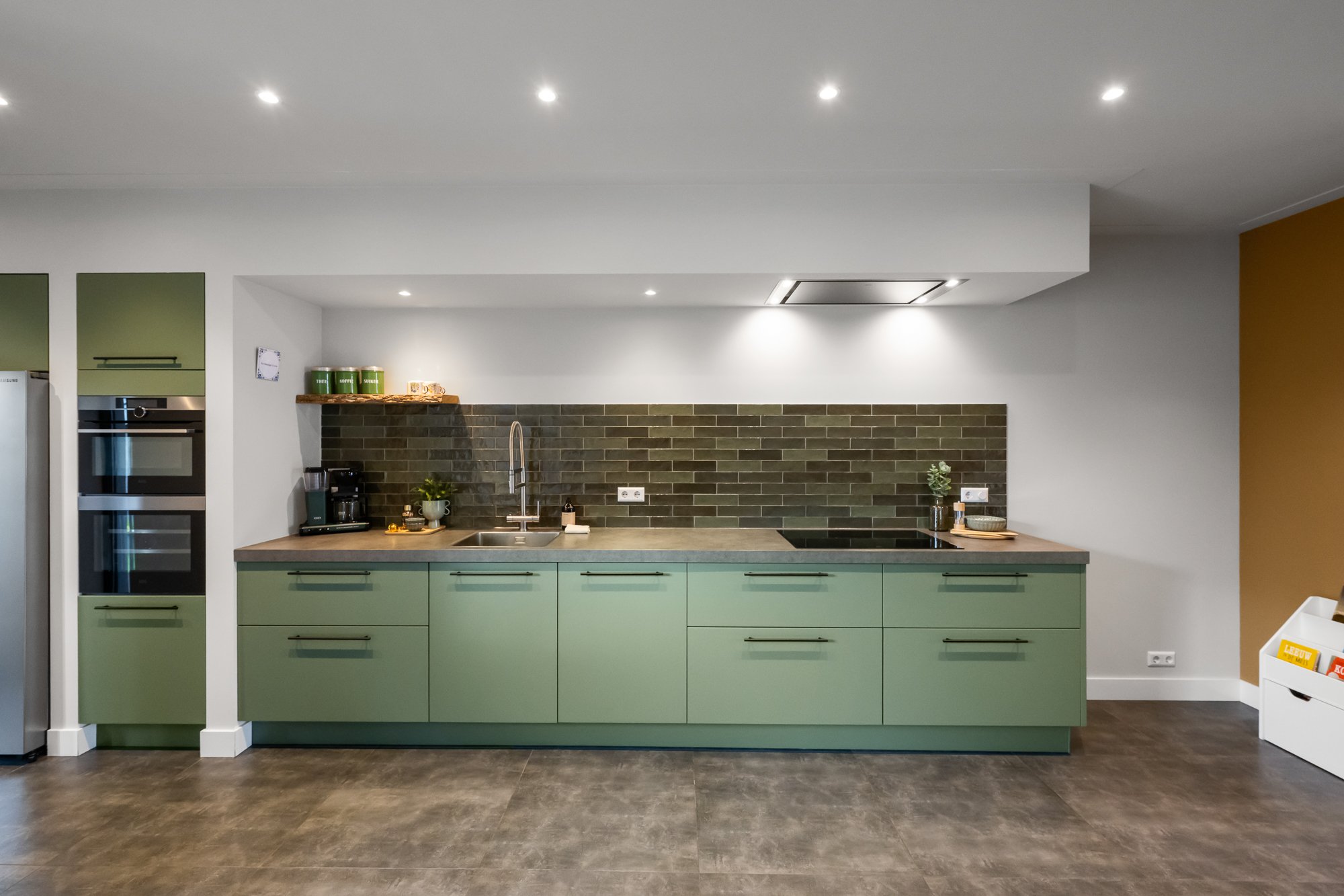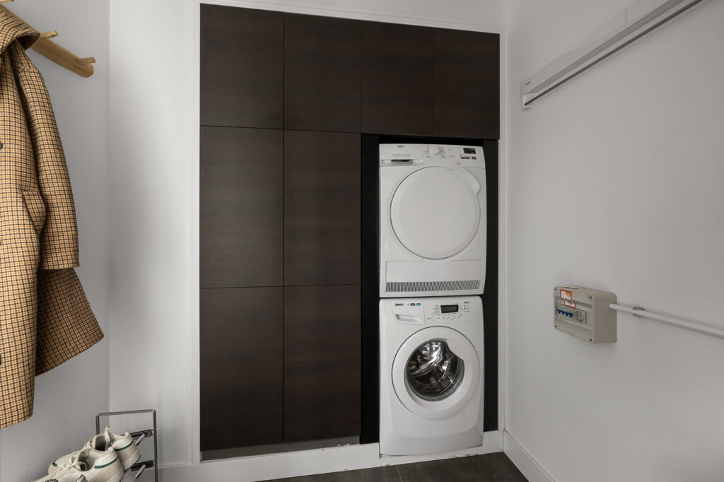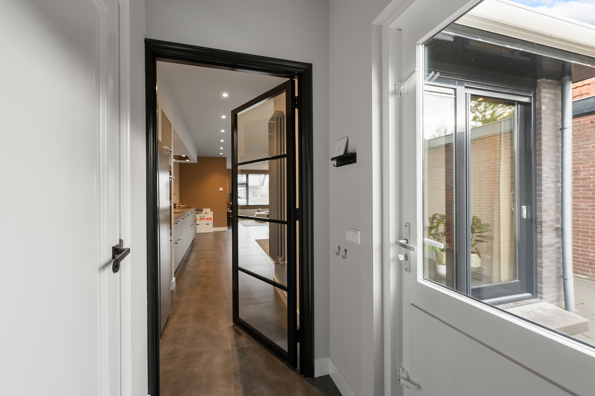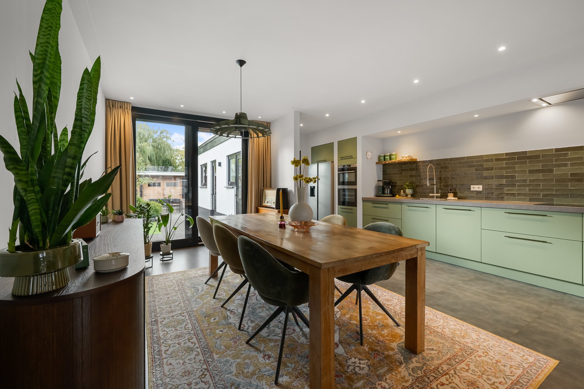Aansluitend vind je de moderne keuken, compleet uitgerust met hoogwaardige inbouwapparatuur zoals een inductiekookplaat, wijnklimaatkast, kokendwaterkraan en combioven. Achter de keuken bevinden zich een praktische wasruimte en een apart toilet.