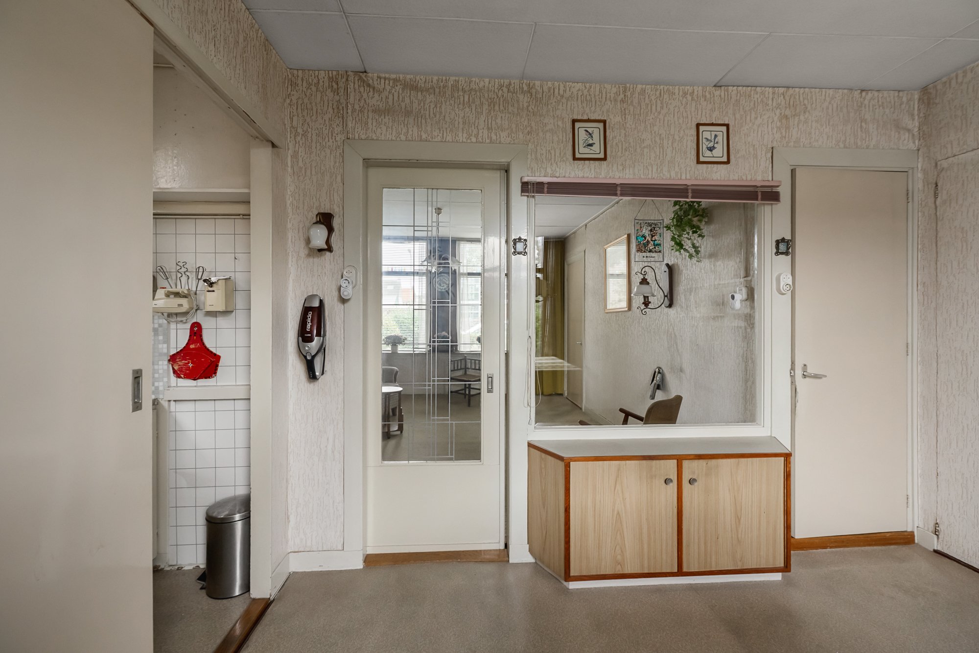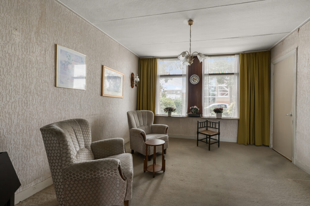 De entree geeft toegang tot de woonkamer aan de voorzijde. De grote ramen zorgen voor prettig daglicht en een open sfeer. Aansluitend ligt de eetkamer, een fijne ruimte die zich uitstekend leent om om te vormen tot een lichte woonkeuken met zicht op de tuin. De keuken ligt centraal in het huis, naast de eetkamer, en kan bij een verbouwing mooi bij de leefruimte worden betrokken.