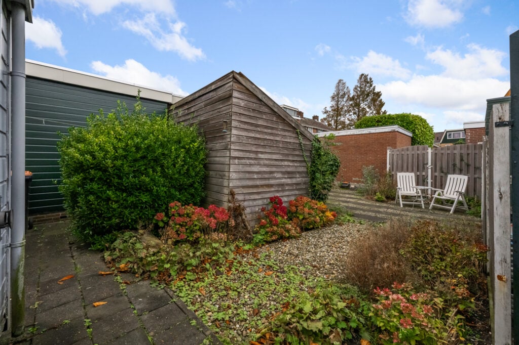 – Achtertuin op het westen met houten berging;
